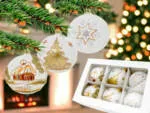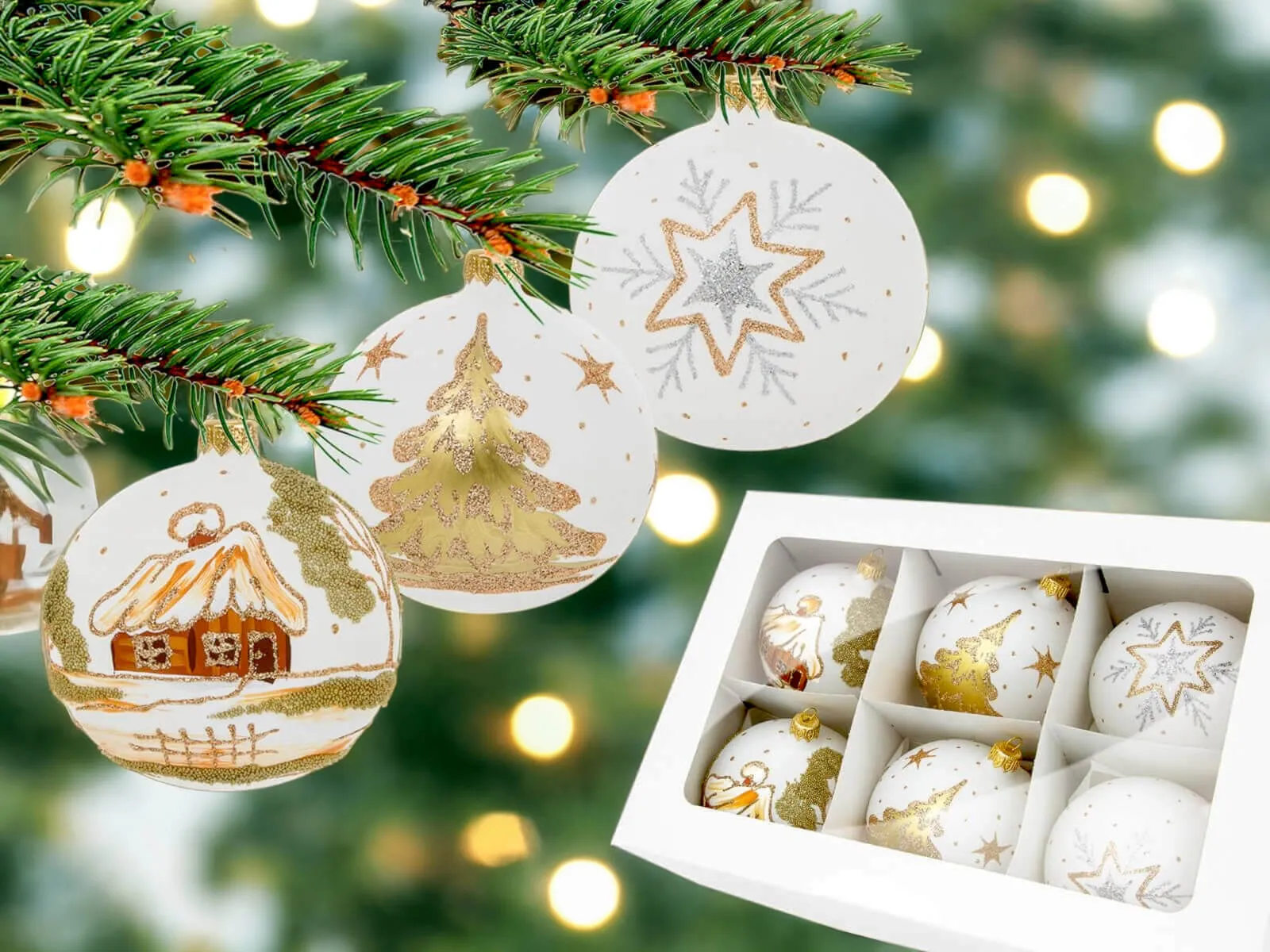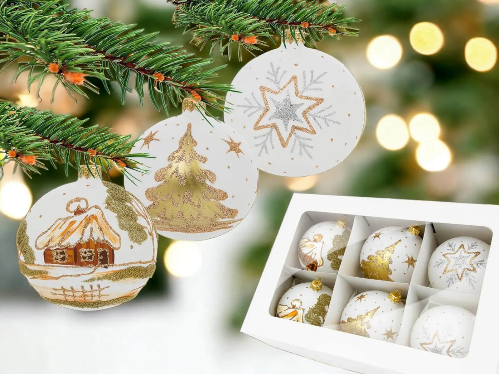 W komplecie znajdują się trzy różne wzory bombek, z każdego wzoru po dwie sztuki. Chatka, gwiazdka i choinka, każda z nich została starannie ozdobiona złotym akcentem na białej kredzie. Kredowy biały kolor tworzy delikatne tło, podkreślając jednocześnie złote zdobienia, które nadają bombkom wytwornego i stylowego wyglądu.