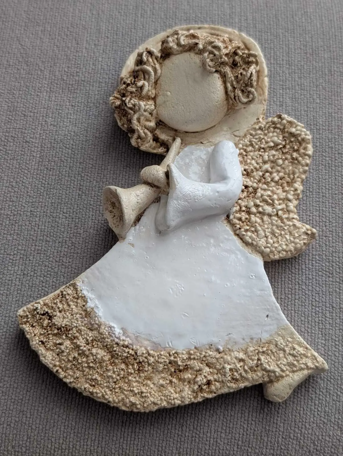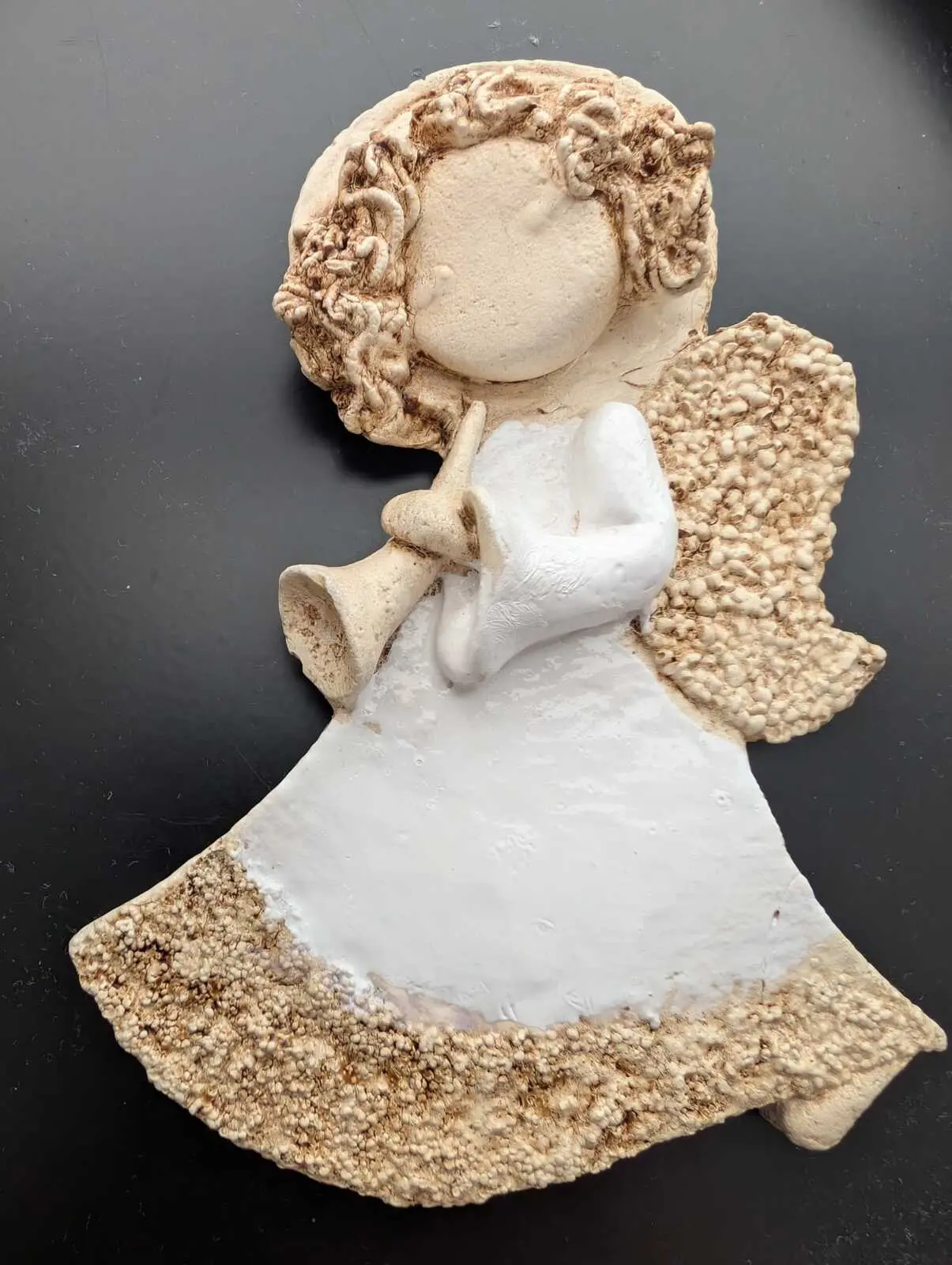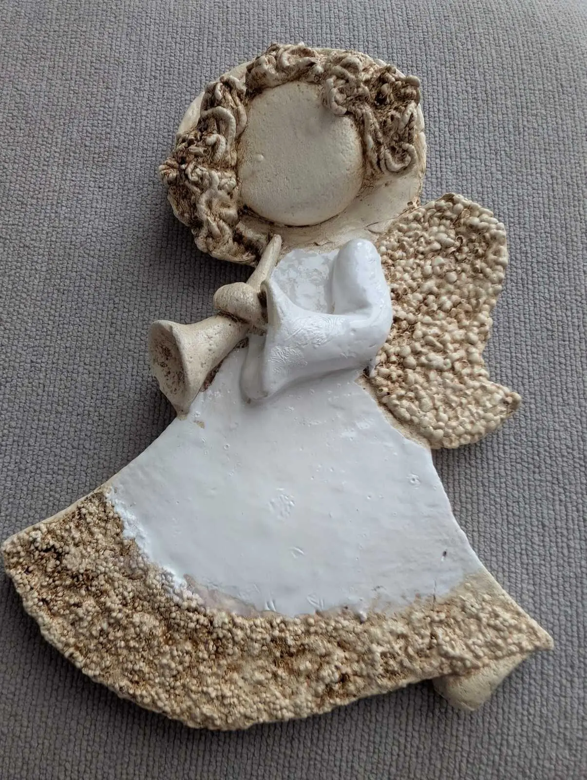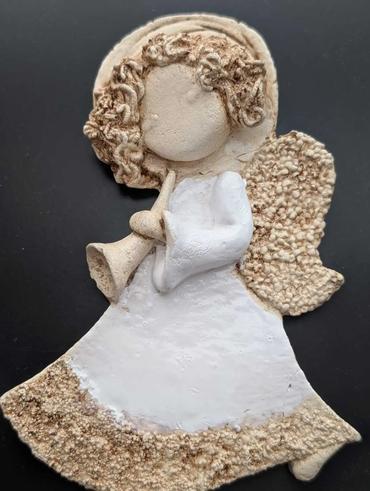 Liolinka z trąbką to mała dziewczynka ubrana w białą sukienkę. W swoich małych rączkach trzyma trąbkę, na której gra cudne melodie. Jej włosy są jasnego koloru, które zdobi aureola. Z tyłu ma małe, złote skrzydła. Figurka jest wykonana ręcznie z jak największą dokładnością. Może służyć jako dekoracja lub prezent dla dziecka.