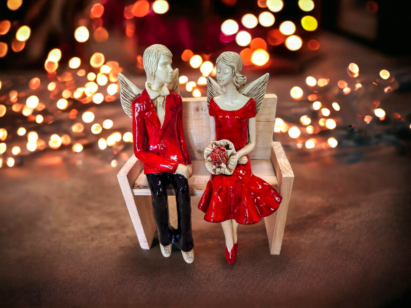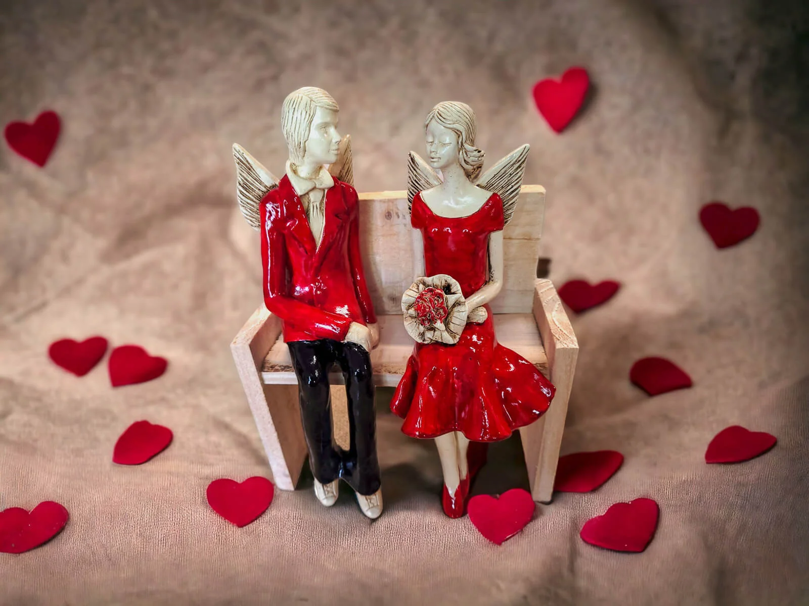 Para ręcznie wykonanych aniołów w czerwonym kolorze. Idealne na prezent dla młodej pary i nie tylko. Mogą pięknie ozdobić stół na przyjęciu weselnym.