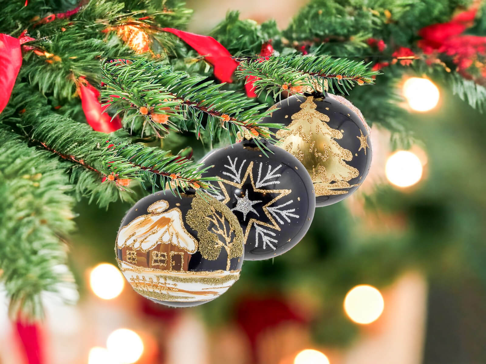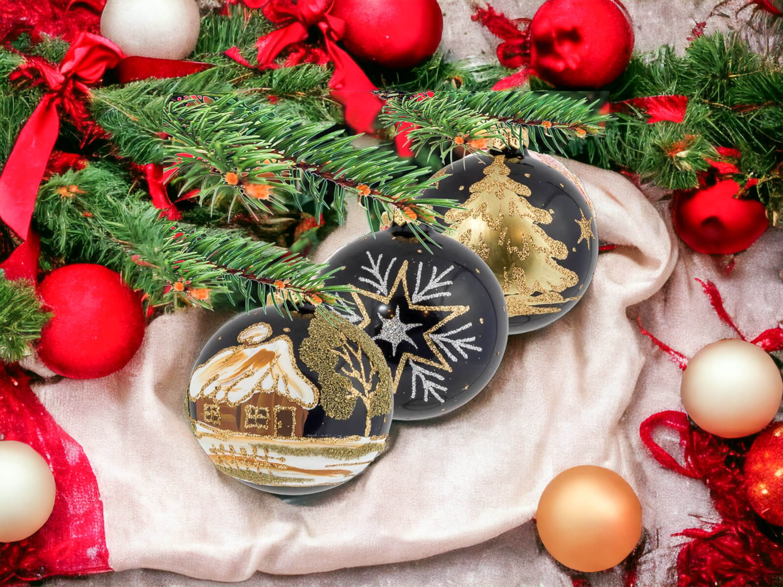 Komplet szklanych bombek choinkowych Czarny Opal - Chatka, Gwiazdka, Choinka to wyraz wyrafinowanego smaku i elegancji w świątecznym wystroju. Ręcznie robione i malowane, te unikatowe ozdoby łączą w sobie głęboki kolor czarnego opalu z bogatym złotym zdobieniem, tworząc niepowtarzalny zestaw, który zachwyca wyjątkowym designem i polskim rzemiosłem.