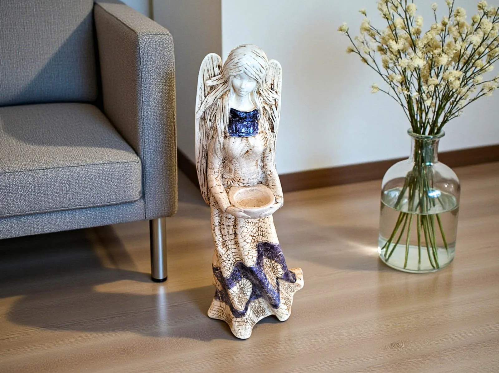 Anioł trzyma w dłoniach misę, która może pełnić funkcję podstawki pod tealight. Wystarczy zapalić świeczkę, aby w kilka chwil stworzyć nastrojowe światło i ciepłą atmosferę w pomieszczeniu.