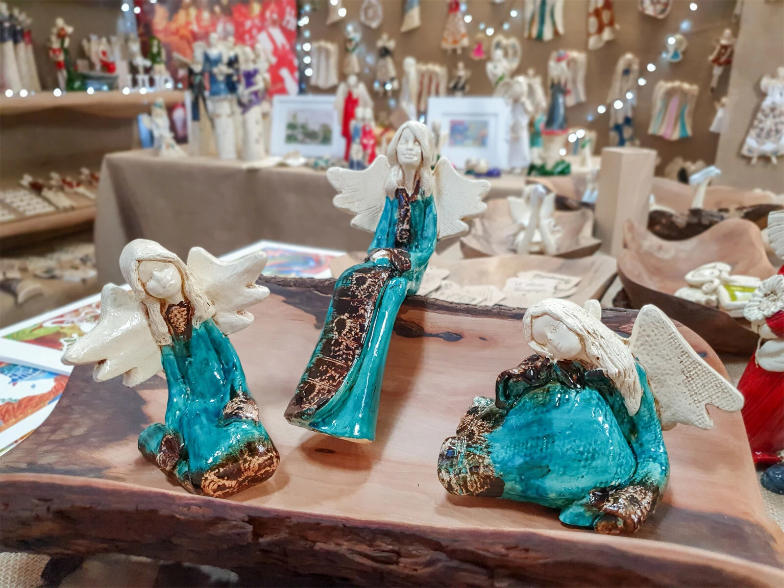 Komplet trzech turkusowych, ręcznie robionych i malowanych aniołków gipsowych. Wyjątkowe aniołki mają przepiękne, turkusowe suknie z efektownymi, brązowymi zdobieniami. Jasne elementy na brązowym tle wyglądają jak utkane wzory. To świetny kontrast do białych włosów i skrzydeł. Taka dekoracja w salonie od razu zwróci uwagę i zachwyci gości, a domowników będzie cieszyć niezwykłym ciepłem i spokojem. Wszystkie aniołki to siedzące figurki, jedna ma opuszczone nogi i można ją umieścić na wyższych elementach czy krawędziach. Ręcznie robione aniołki można postawić osobno, ale pięknie też wyglądają razem.