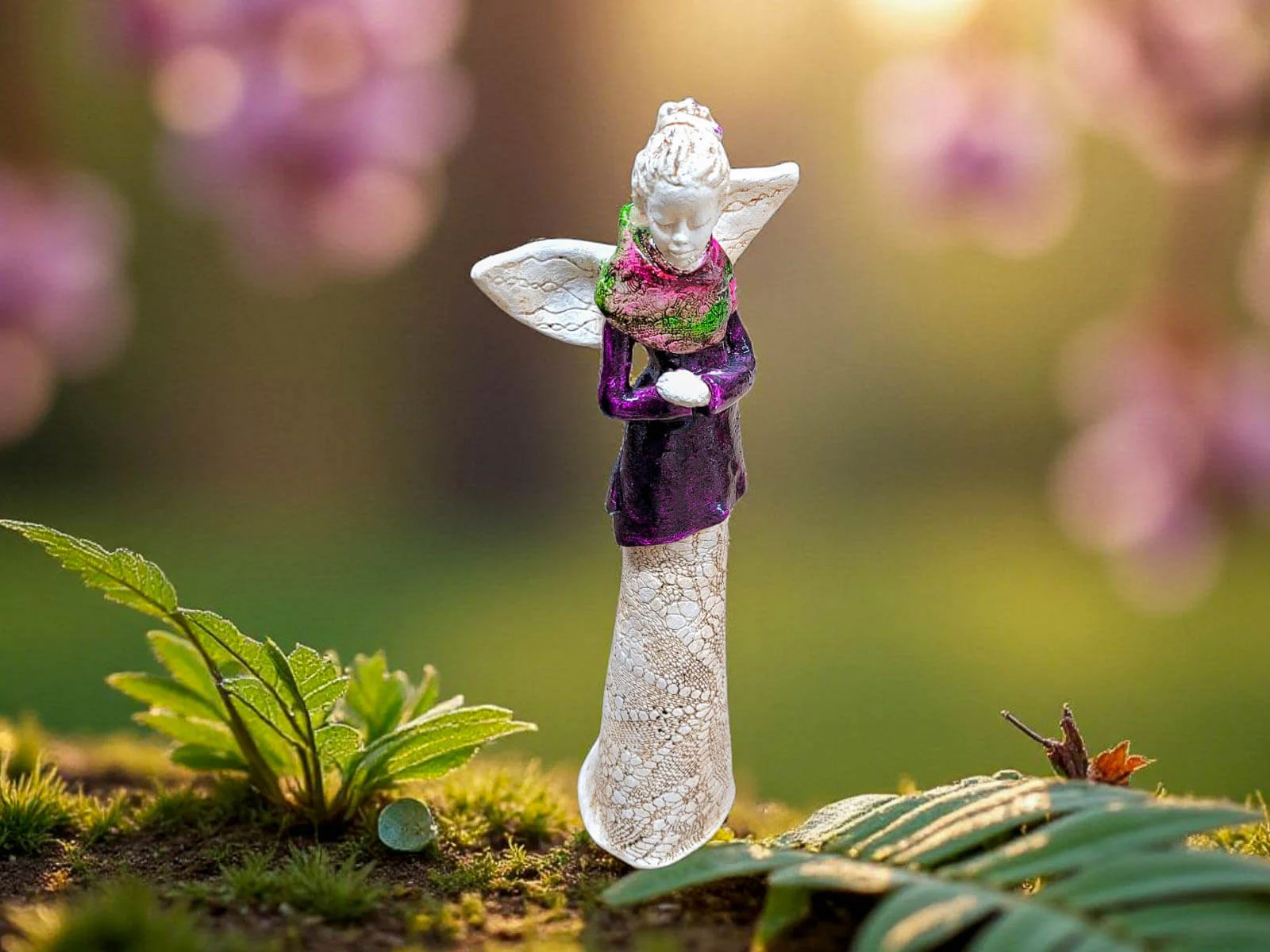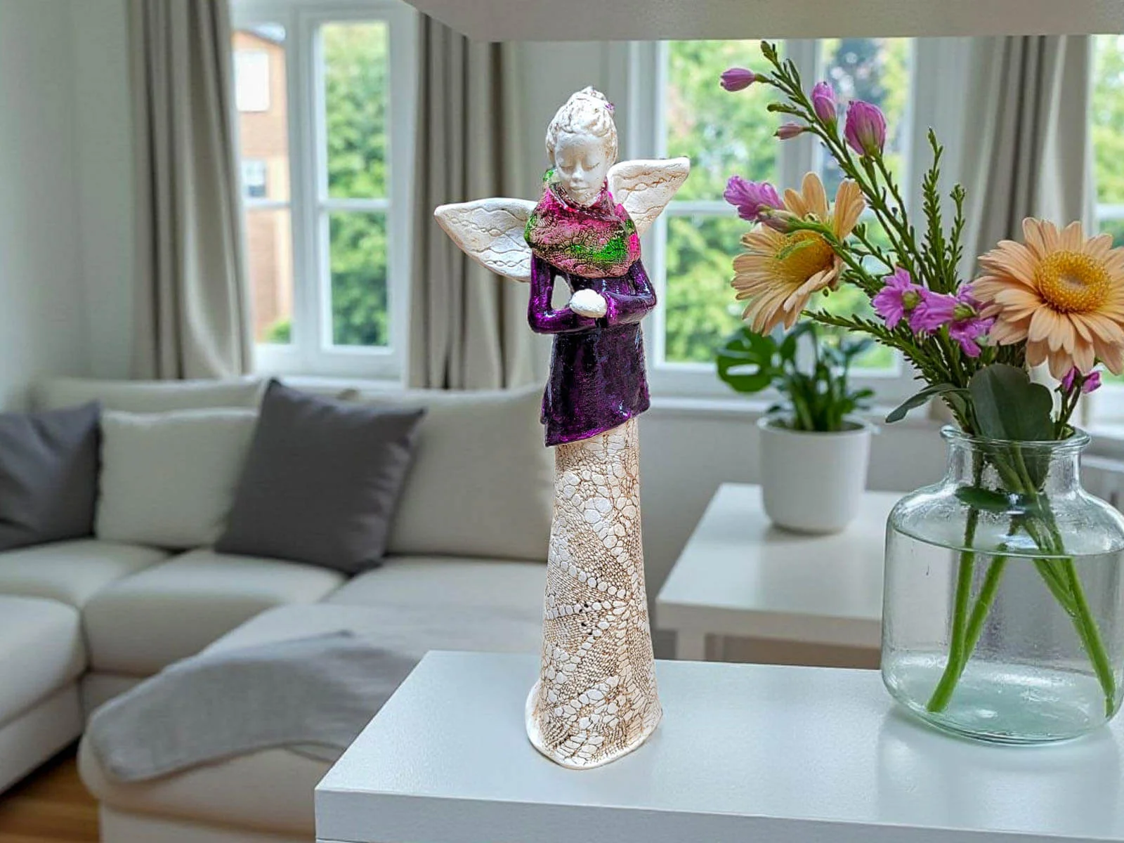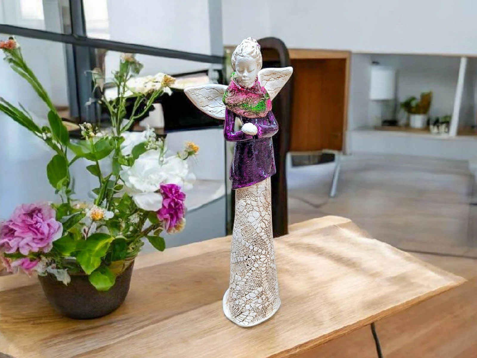Przywitaj w swoim domu wyjątkowy symbol spokoju i elegancji – duży, stojący Anioł Catherine. Wyróżnia się fioletowym topem i kolorowym szalikiem, a włosy spięte w uroczy kok dodają mu subtelnej gracji. Każdy detal tej figurki jest starannie wykonany ręcznie w Polsce, co sprawia, że jest niepowtarzalnym dziełem sztuki i gwarancją unikalności.