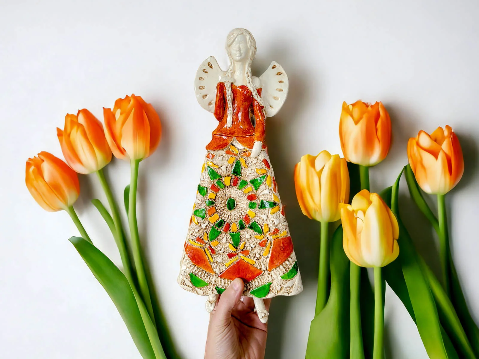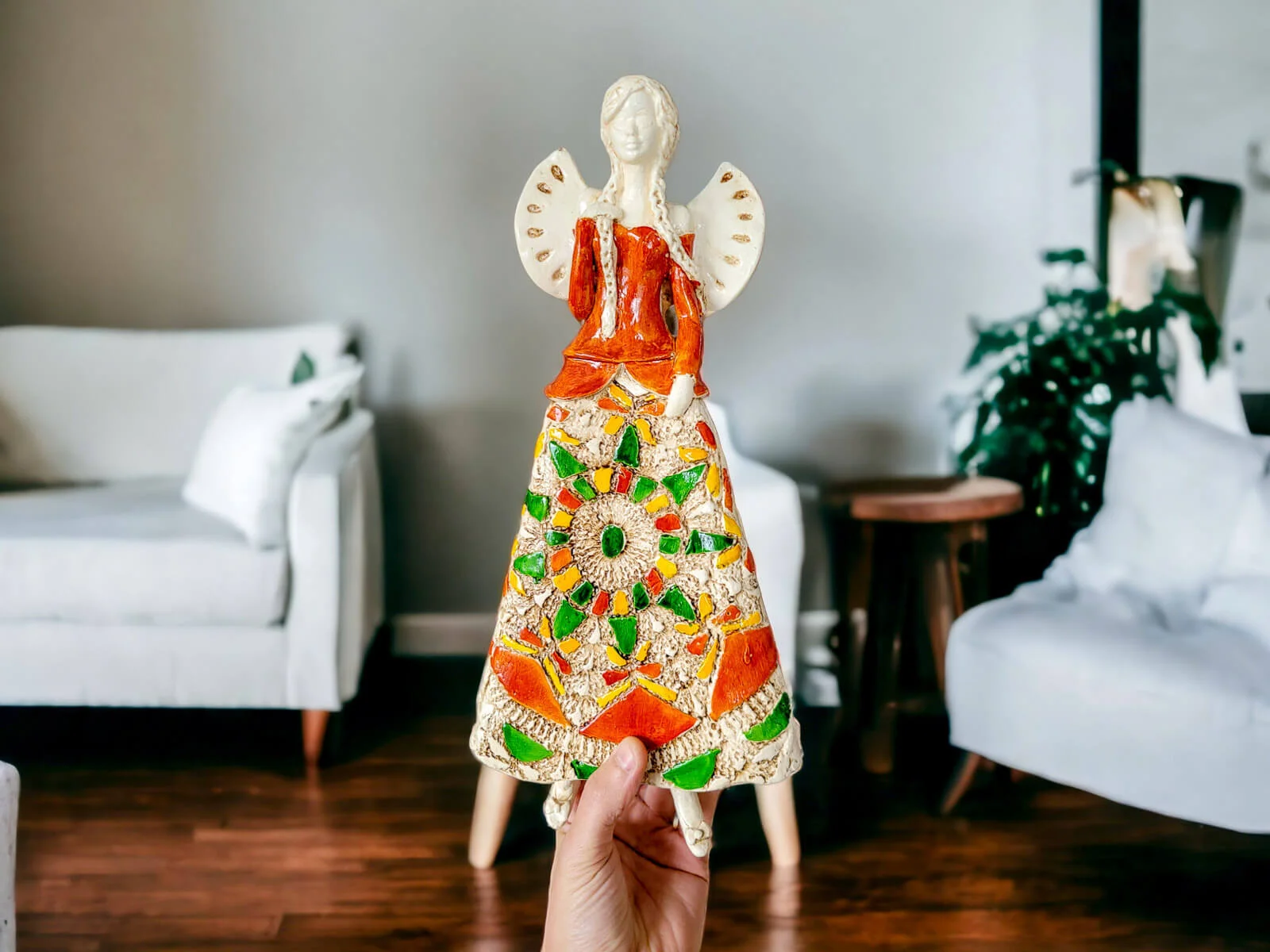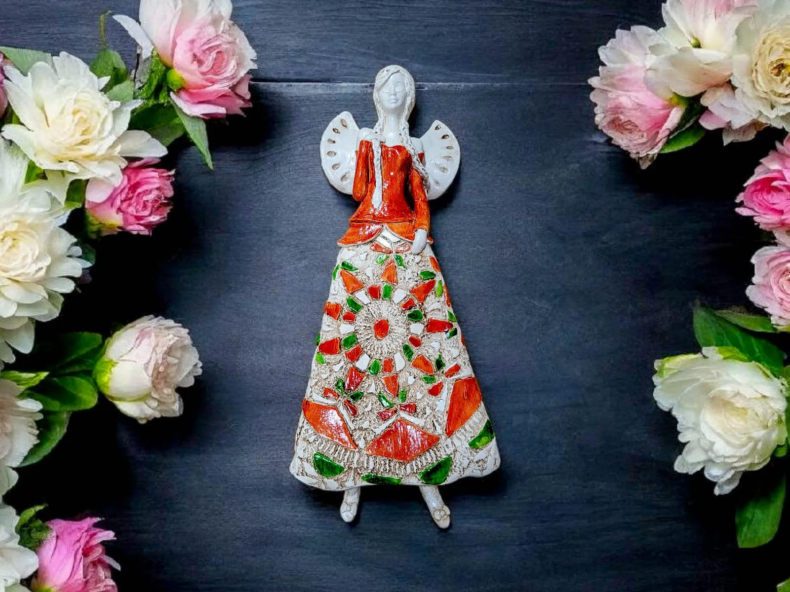 Anioł Heather w kolorze pomarańczowo zielonym to ręcznie wykonana figurka do zawieszenia na ścianę. Heather to śliczna anieliczka ceniąca sobie tradycję. Jest artystką, uwielbia kulturę ludową swojej wioski. Jest ubrana w folklorystyczną suknie. Eksponuje piękne, długie warkocze. Ma delikatne, rozłożyste skrzydła. Figurka nadaje się na prezent na każdą okazję. Można ją zawiesić w każdym miejscu. Świetnie wkomponuje się w klasyczne jak i nowoczesne wnętrze.