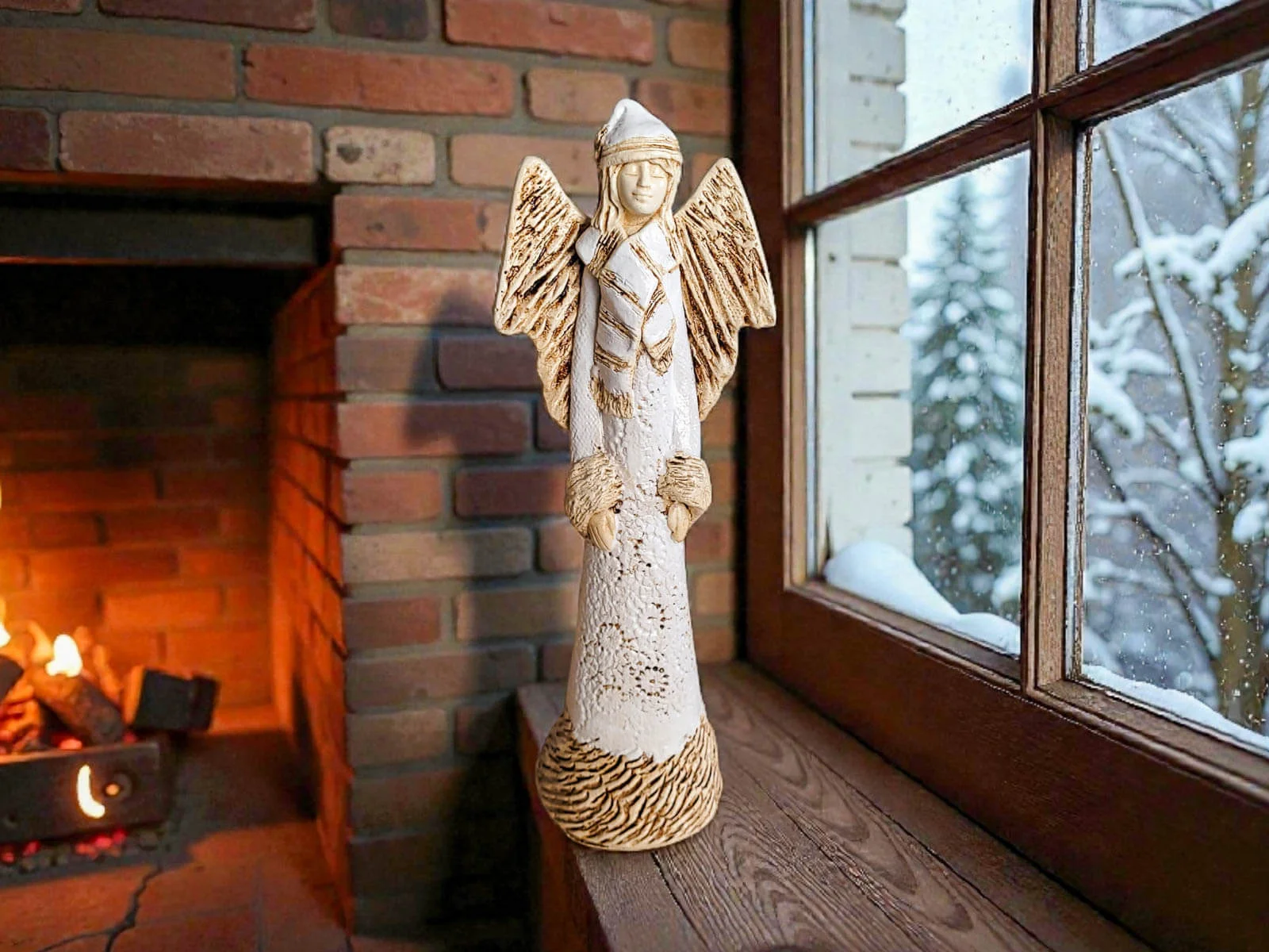 Anioł Abdiel w białej sukni. Uwialbie zimę. Gdy mróz szczypie w nos, gdy śnieg i lód. Abdiel ubiera swój ciepły wełniany płaszcz, szal, czapkę i idzie na spacer wśród ośnieżonych pustych dróg i pól. Potem zasiada w bujanym fotelu z gorącą owocową herbatą z odrobiną rumu i szydełkuje albo robi na drutach. Anioł Abdiel ma bardzo gorące serce, więc nawet w bardzo zimną zimę ogrzeje każde miejsce. Nie obiecujemy, że odkręci grzejnik, albo rozpali w kominku, ale pięknie będzie się prezentować nawet na lodowatym parapecie. Przypomni o zaległych rodzinnych odwiedzinach i zmniejszy tęsknotę za nimi. Swoją przytulnością roztopi każde, nawet te zamrożone relacje.