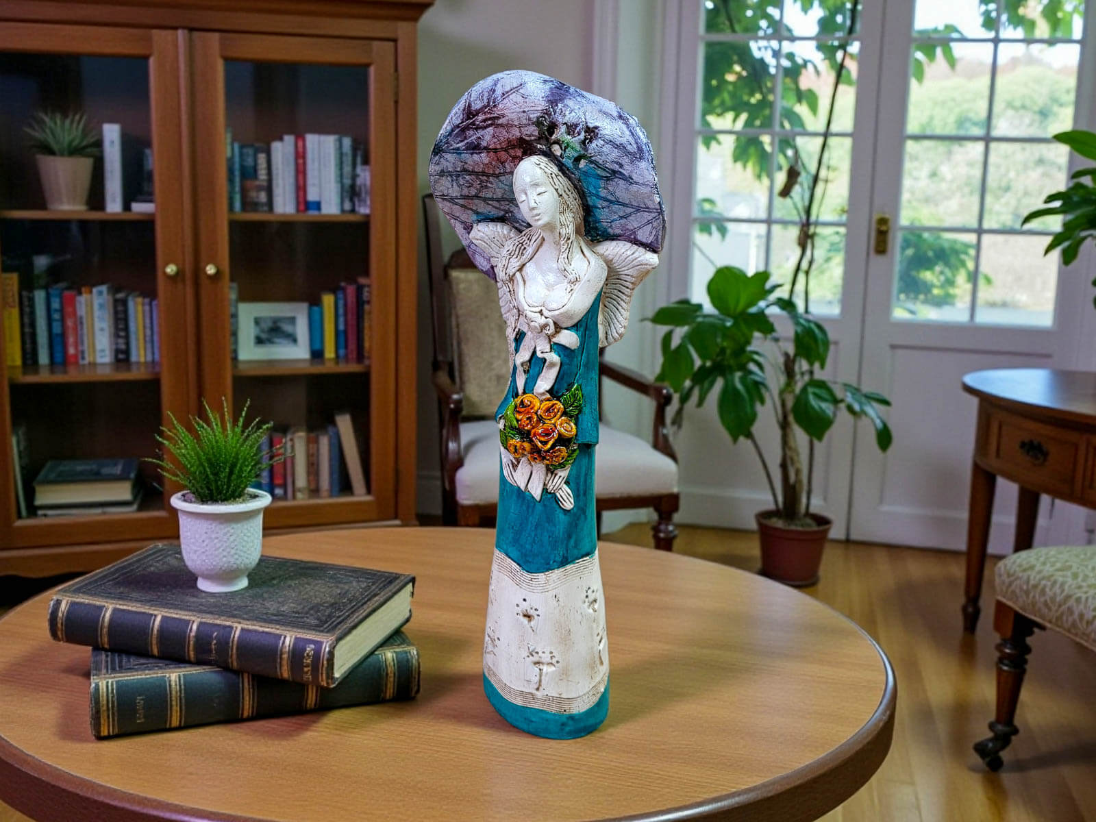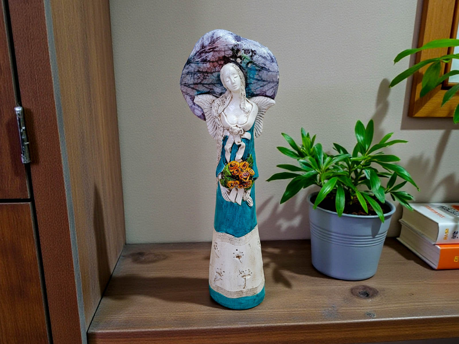 Figurka stojącego Anioła Mabel to wyjątkowe połączenie subtelności, kobiecej siły i artystycznej elegancji. Przedstawia kobietę w turkusowej sukni, w dużym, stylowym kapeluszu, trzymającą bukiet kwiatów – symbol wdzięku, delikatności i pięknych emocji. Jej dopasowana suknia z wyrazistym dekoltem przyciąga spojrzenia i dodaje figurce zmysłowego charakteru, który rozpala wyobraźnię, nie tracąc klasy.
