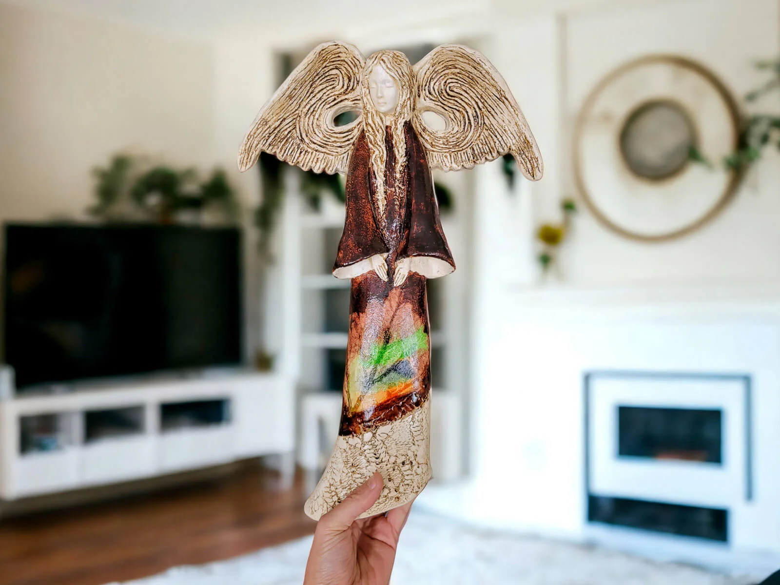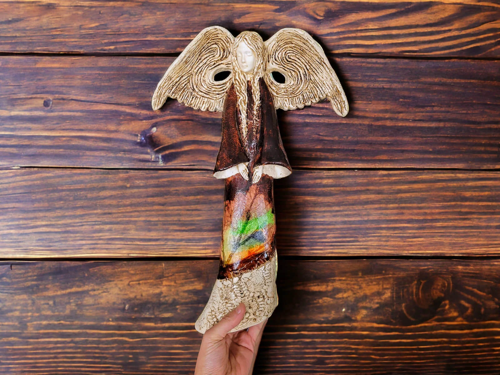 Brązowy Anioł Clara w limitowanej kolekcji Art z liściem. Osoby o imieniu Clara odznaczają się sympatycznym sposobem bycia, ale też dużym temperamentem. Taki właśnie jest ten Anioł w kolorze brązowym - ciekawość życia nie pozwala jej długo usiedzieć na miejscu. Pragnie być obecna wszędzie, umożliwiają jej to duże skrzydła. Clara jest również bardzo uczuciowa. Pragnie sympatii i potrafi ją odwzajemnić. Figurka w kolorze turkusu będzie się pięknie prezentować jako element wystroju, ale również może być podarowana w prezencie.