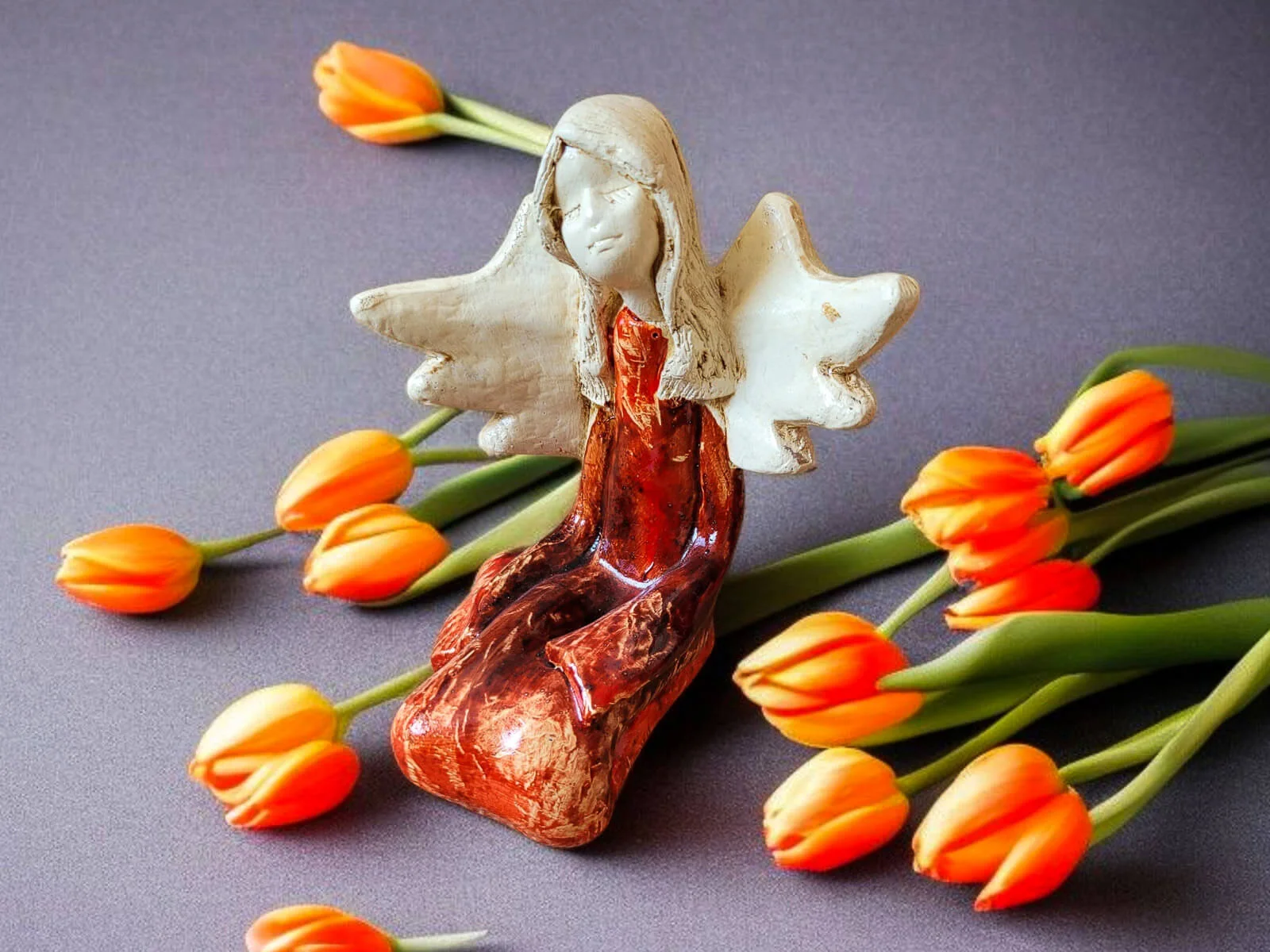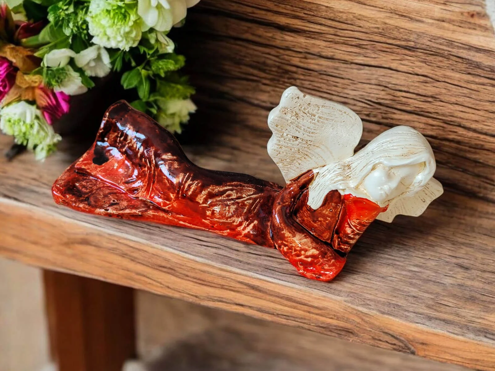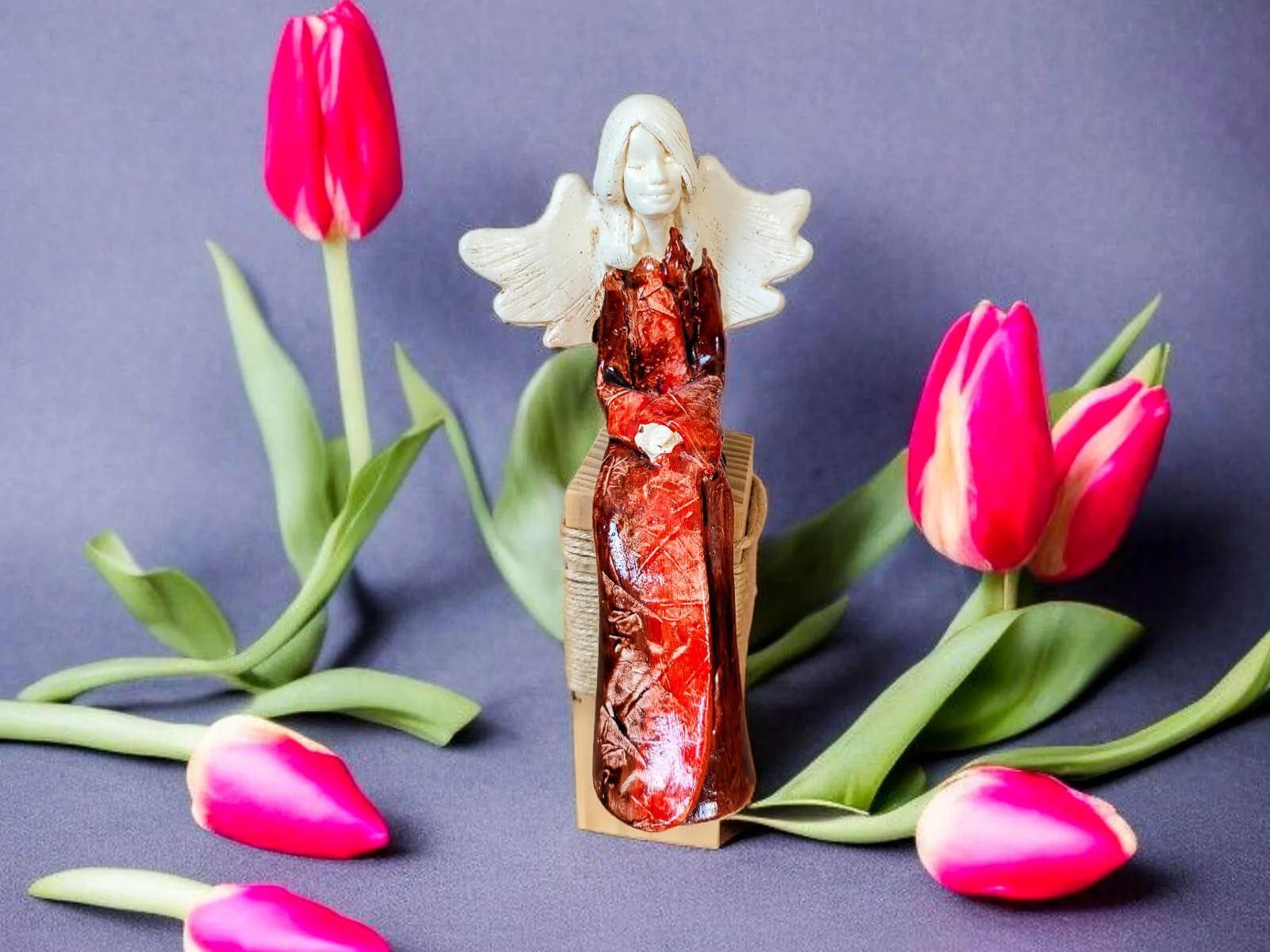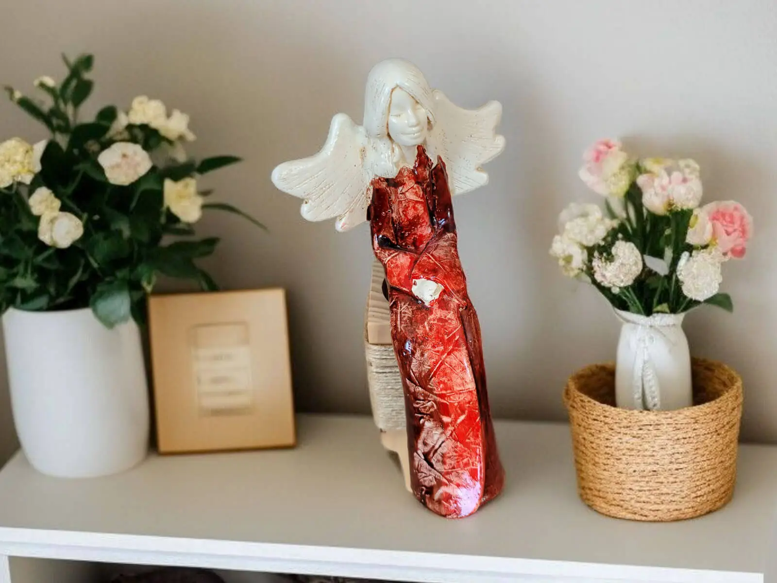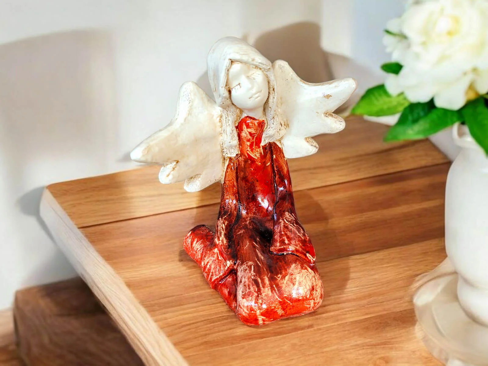 Kontrast jasnych skrzydeł i włosów z głębokim brązem sukni wprowadza do wnętrza harmonię i subtelność. To nie tylko dekoracja – to źródło codziennej radości i wyciszenia.