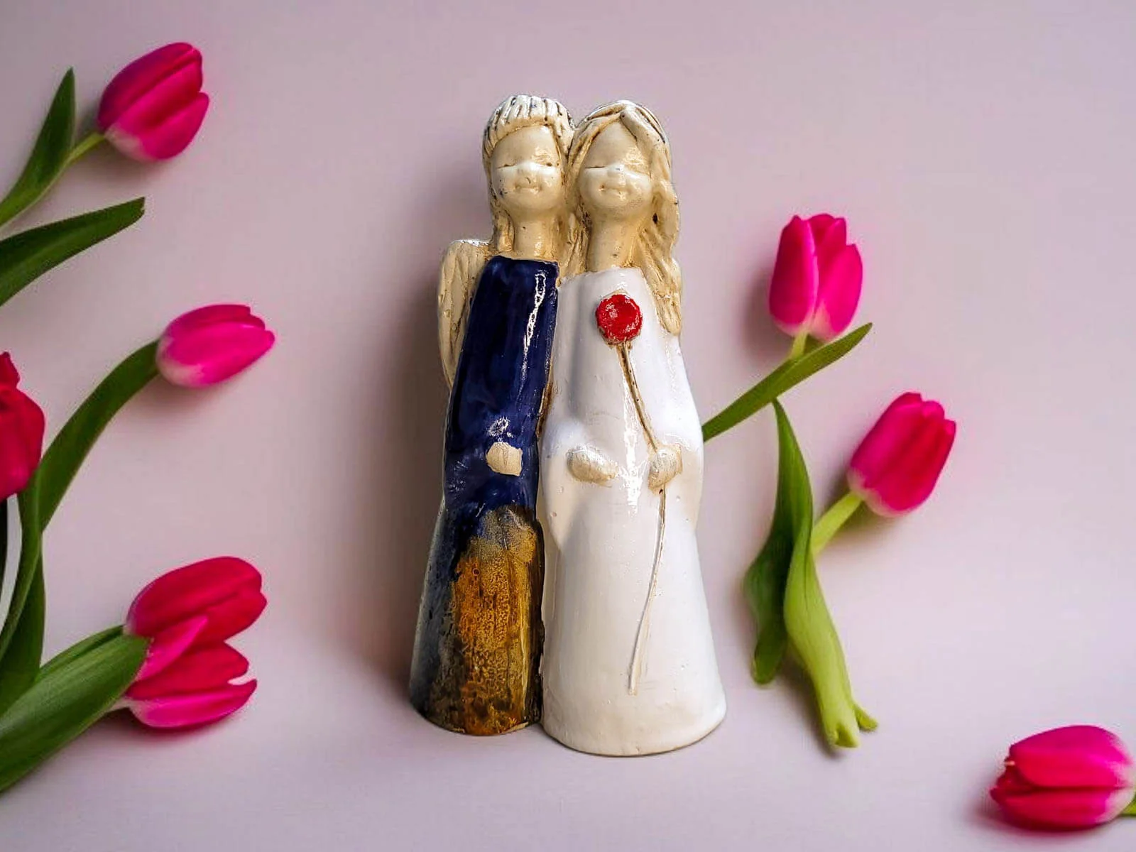 Apple & Ella w granatowej i turkusowej sukience to ręcznie wykonana figurka dwóch aniołków. Siostry czule się o siebie opierają. Może to świadczyć o ich siostrzanej bliskości oraz miłości do siebie. Aniołki ubrane są w piękne, długie subtelne suknie w kolorze białym i niebieskim, co świadczy o ich czystości, niewinności i beztroskim wieku dziecięcym. Figurka idealnie nadaje się na prezent dla dziewczynki jako pamiątka komunijna lub dla przyjaciółki. Pięknie będzie zdobić domowe wnętrze jak i spełniać funkcję ozdoby ogrodowej.