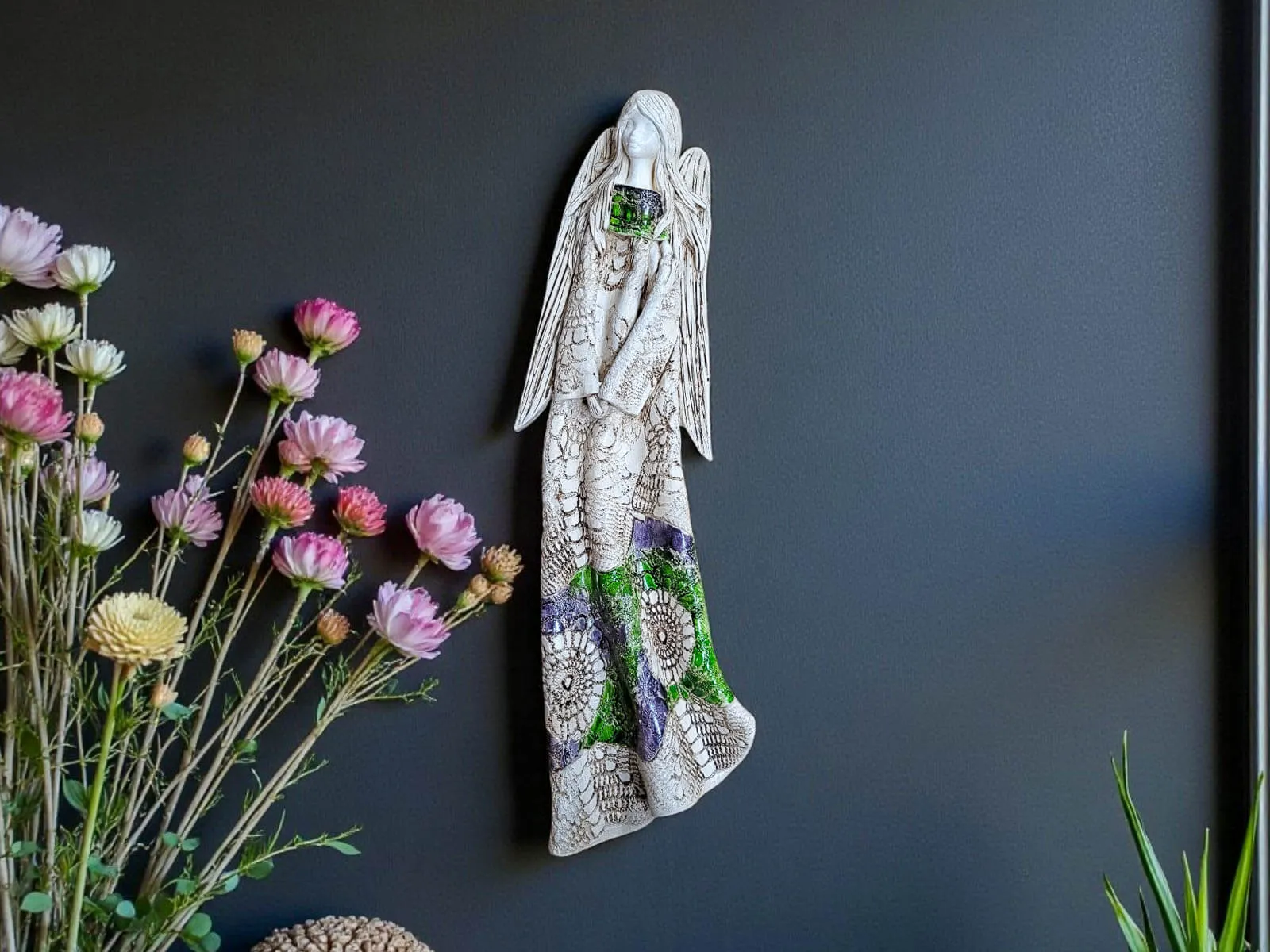 Anioł Genesis to ręcznie wykonana figurka do zawieszenia na ścianę w odcieniach zieleni i szarości, która symbolizuje spokój, nadzieję i harmonię. To dekoracja, która nie tylko upiększa wnętrze, ale także niesie ze sobą głębokie przesłanie wsparcia, troski i życzliwości.