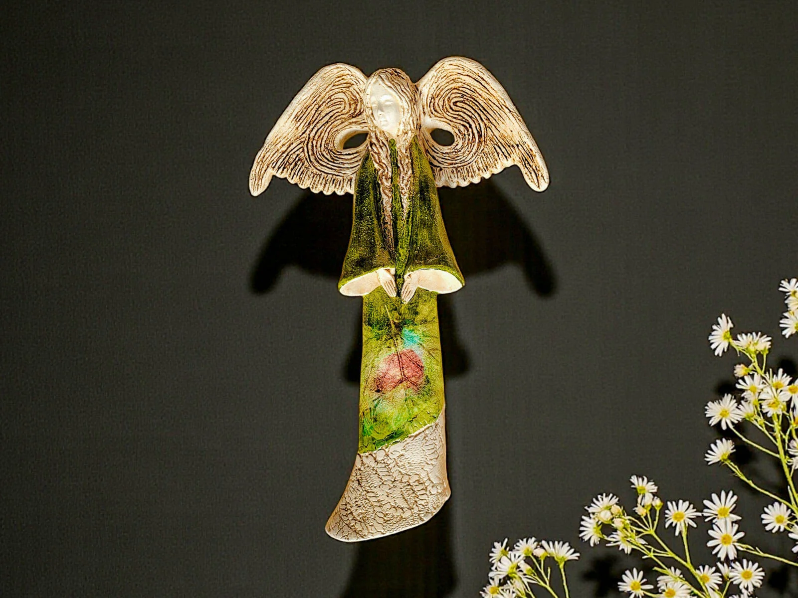 Jej zielona suknia zdobiona prawdziwymi liśćmi zachwyca naturalnością i elegancją, a rozłożyste, imponujące skrzydła nadają figurze lekkość i wznoszącą energię. Clara to doskonały akcent dekoracyjny do salonu, sypialni, korytarza czy gabinetu, wprowadzający do wnętrza spokój, harmonię i piękno natury.