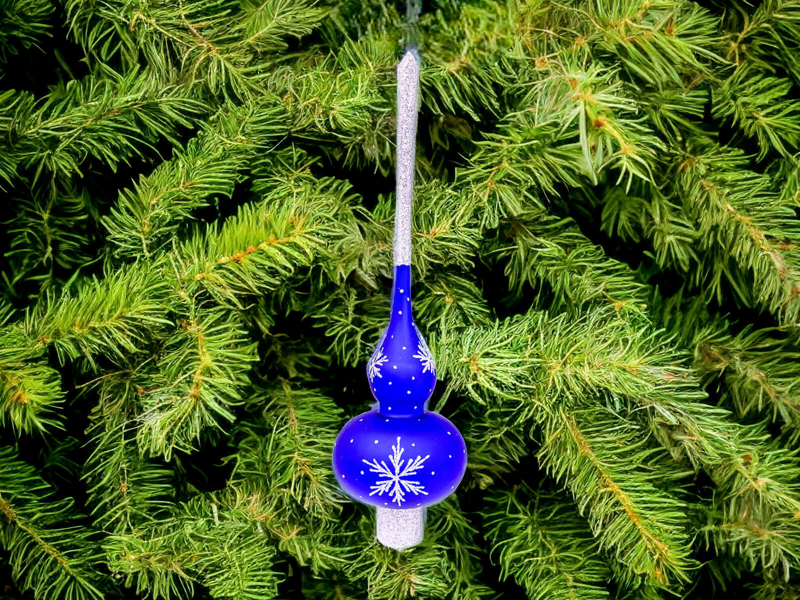 Szpic tej bombki został wykonany ze szkła, co nadaje mu eleganckiego charakteru. Szafirowy podkład dodaje ozdobie szlachetności i głębokiego, niebieskiego blasku, który doskonale komponuje się z atmosferą świąt.