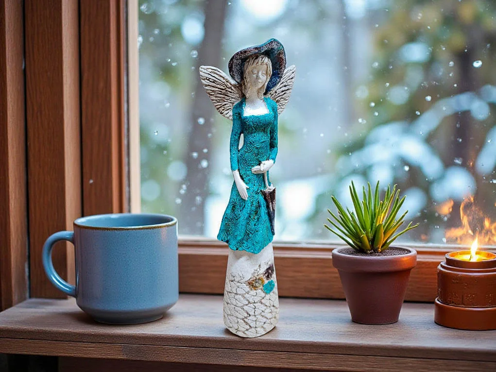 Anioł Olivia to wyjątkowa, ręcznie wykonana figurka w turkusowej sukni, która wnosi do wnętrza lekkość, spokój i odrobinę magii. Jej jasne, krótkie włosy oraz subtelny parasol trzymany w lewej dłoni nadają postaci delikatności i symbolicznego charakteru – ochrony, troski i dobrych myśli.