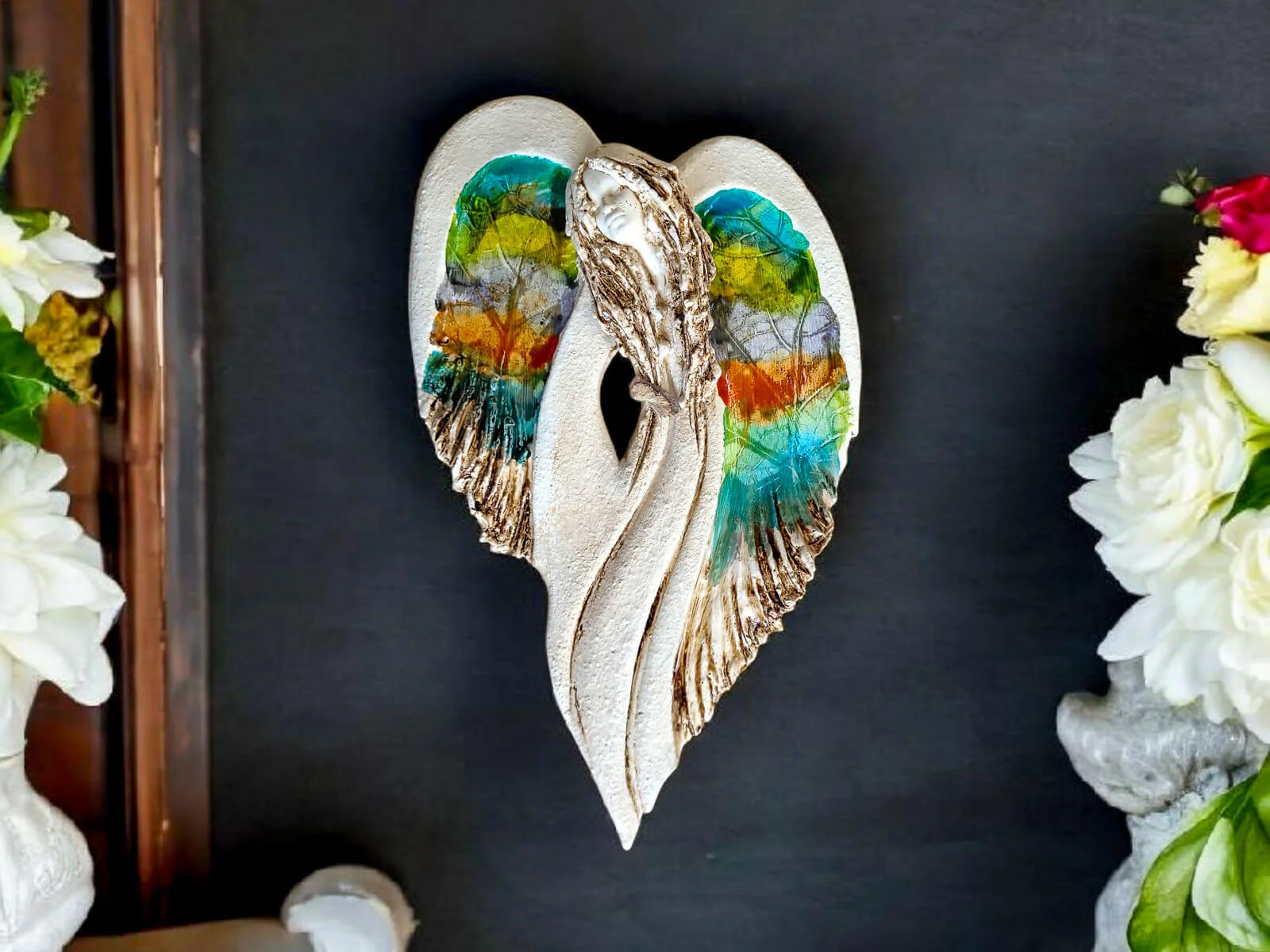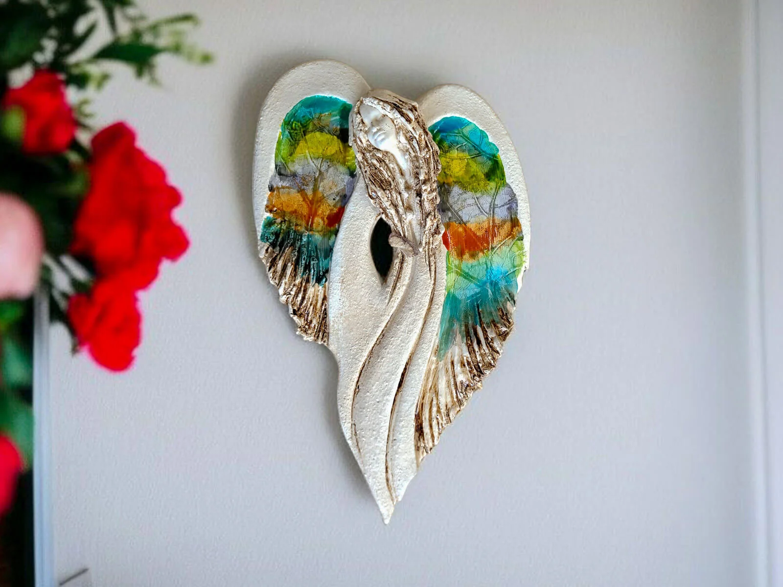 Unikalny anioł Cynthia z kolekcji Art Leaf z wzorami prawdziwych liści. Jedyna sztuka z tym wzorem. Wyjątkowa uroda, ujmująca delikatność, wielka wrażliwość, kwintesencja kobiecości, pełna miłości, porywająca, a jednocześnie zapewniająca spokój. Zobacz jak pięknie chroni miłość, jak dba i troszczy się o Ciebie i Twoich bliskich, opiekuje, obdarza wiarą dającą siłę, rozlewa radość do każdego zakątka mieszkania, przepełnia je dobrocią, sercem pełnym nadziei, sprawia, że miłość dwojga ludzi jest spokojną przystanią.