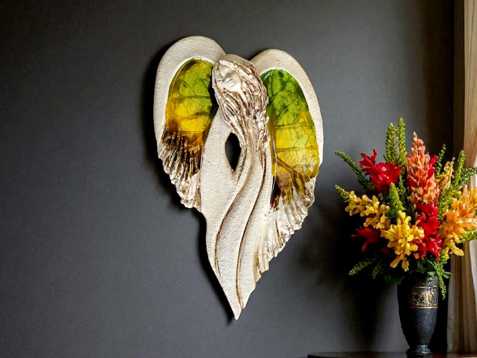 Unikalny anioł Cynthia z kolekcji Art Leaf z wzorami prawdziwych liści. Jedyna sztuka z tym wzorem. Wyjątkowa uroda, ujmująca delikatność, wielka wrażliwość, kwintesencja kobiecości, pełna miłości, porywająca, a jednocześnie zapewniająca spokój.  Zobacz jak pięknie chroni miłość, jak dba i troszczy się o Ciebie i Twoich bliskich, opiekuje, obdarza wiarą dającą siłę, rozlewa radość do każdego zakątka mieszkania, przepełnia je dobrocią, sercem pełnym nadziei, sprawia, że miłość dwojga ludzi jest spokojną przystanią.
