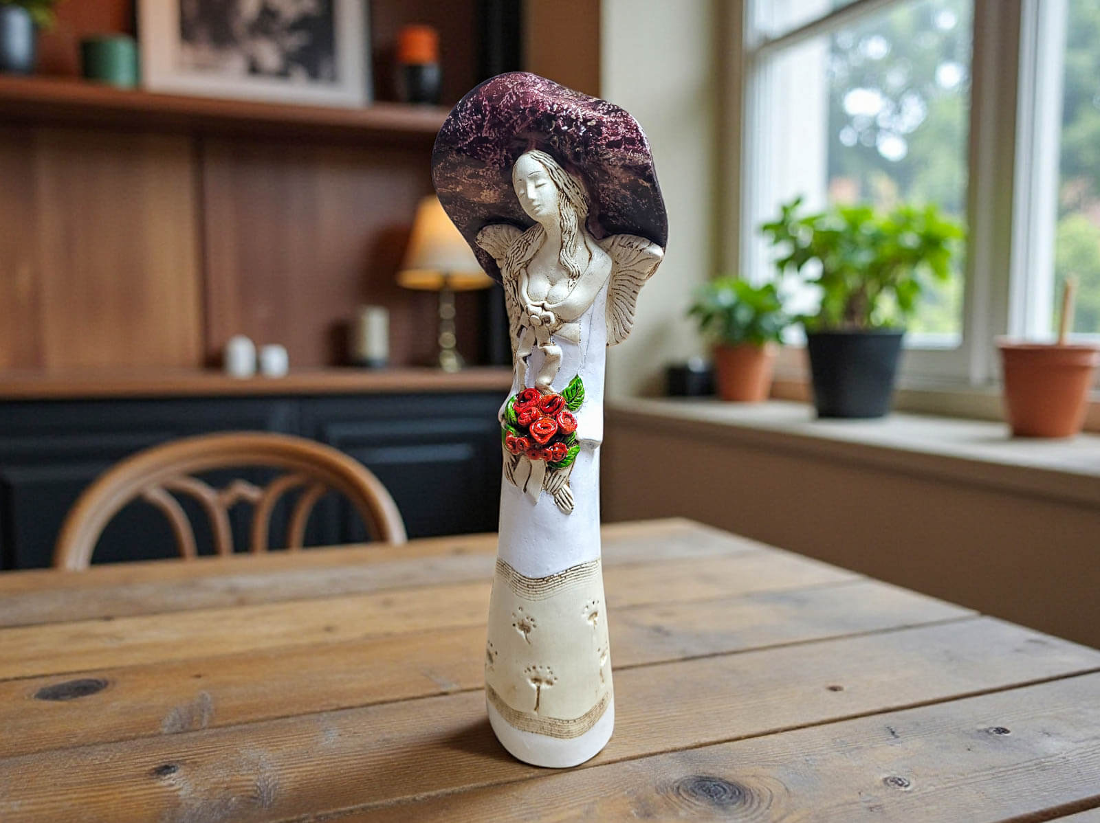 To dekoracja, która nie ginie w tle. Doskonale sprawdzi się jako centralny element wystroju salonu, sypialni lub eleganckiego gabinetu, nadając wnętrzu wyjątkowy klimat i artystyczny charakter. Anioł Mabel podkreśla indywidualność przestrzeni i gust właściciela.