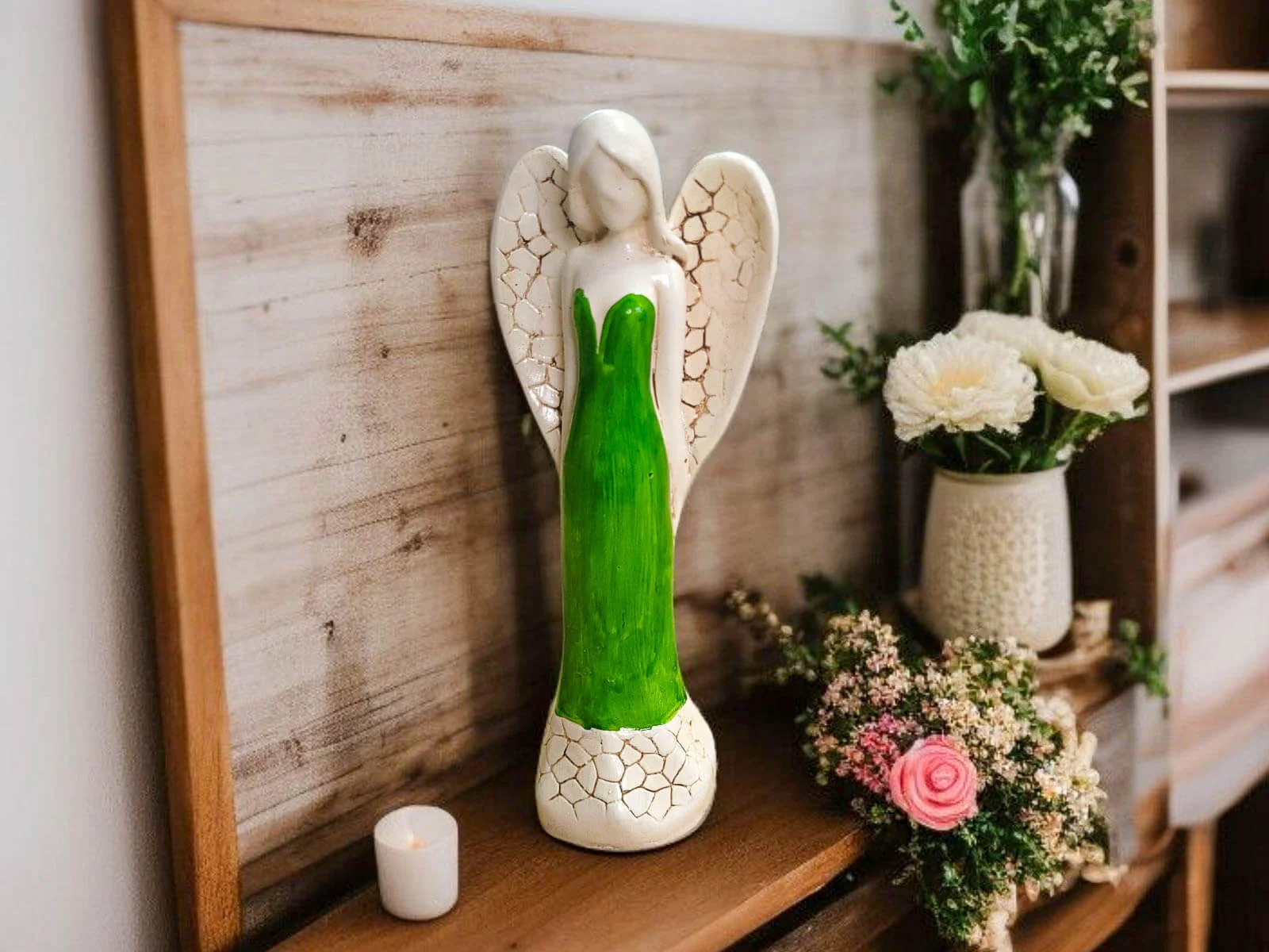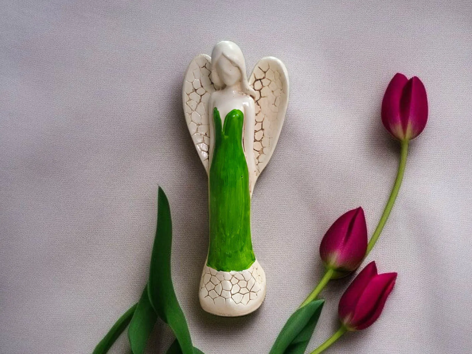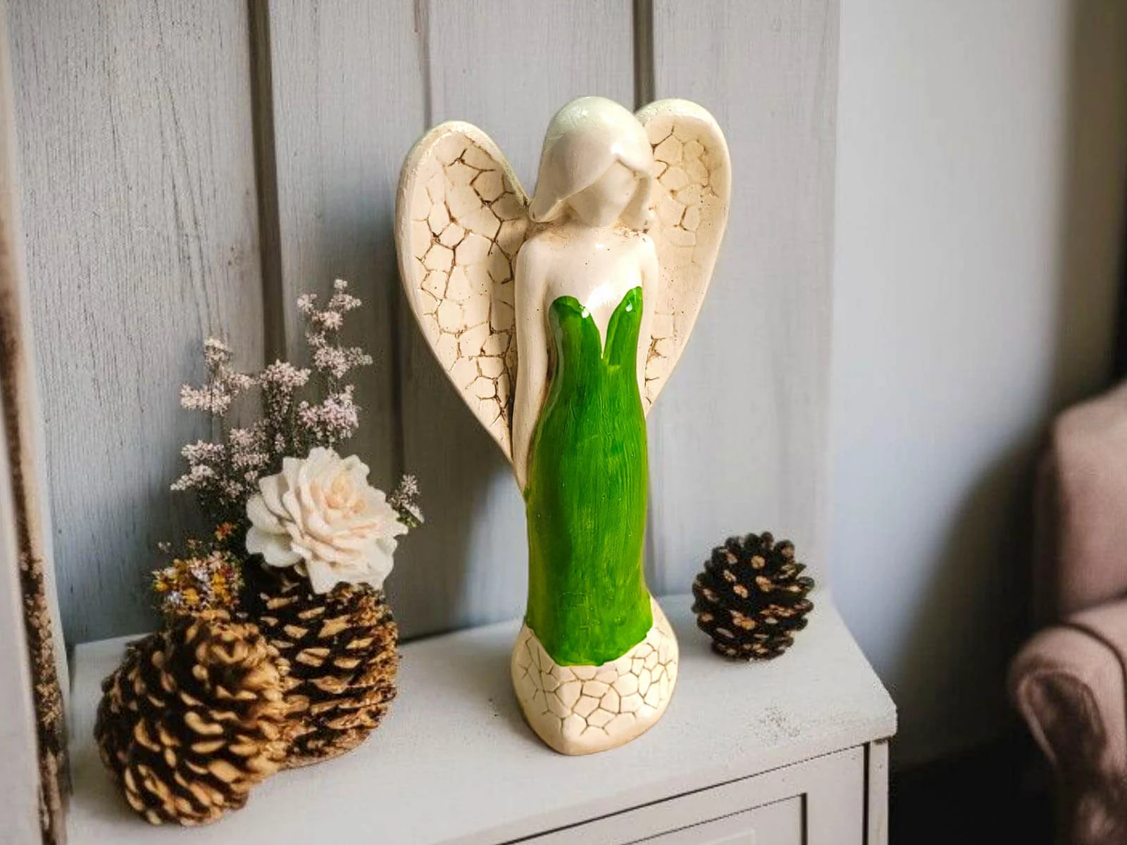 Figurka Anioła Emily to tajemnicza dama, której elegancja i delikatność z pewnością przyciągną uwagę i wniosą do przestrzeni wyjątkowy urok. Ta ręcznie robiona ozdoba nie tylko dekoruje, ale także stanowi unikalny prezent, idealny na różne okazje.