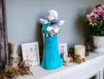 Aniołek ubrany jest w turkusową sukienkę, symbolizującą spokój, harmonię i opiekę. To wyjątkowa ozdoba, która wnosi ciepło i pozytywną energię do każdego wnętrza. Idealny prezent dla bliskiej osoby lub piękny dodatek do kolekcji aniołków.