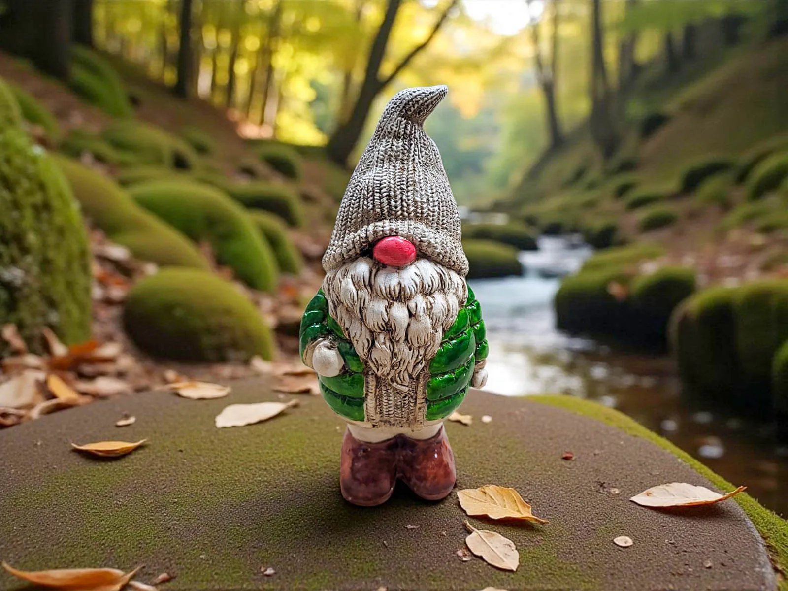 Skrzat ubrany jest w zieloną puchową, pikowaną kurtkę, która nadaje mu przytulny, zimowy charakter. Na głowie ma ciepłą, miękką czapę, opadającą na oczy, co dodaje mu uroku i tajemniczości. Jego długa, gęsta broda oraz duży, czerwony nos sprawiają, że wygląda niezwykle sympatycznie – jak prawdziwy strażnik domowego ciepła i świątecznego nastroju.