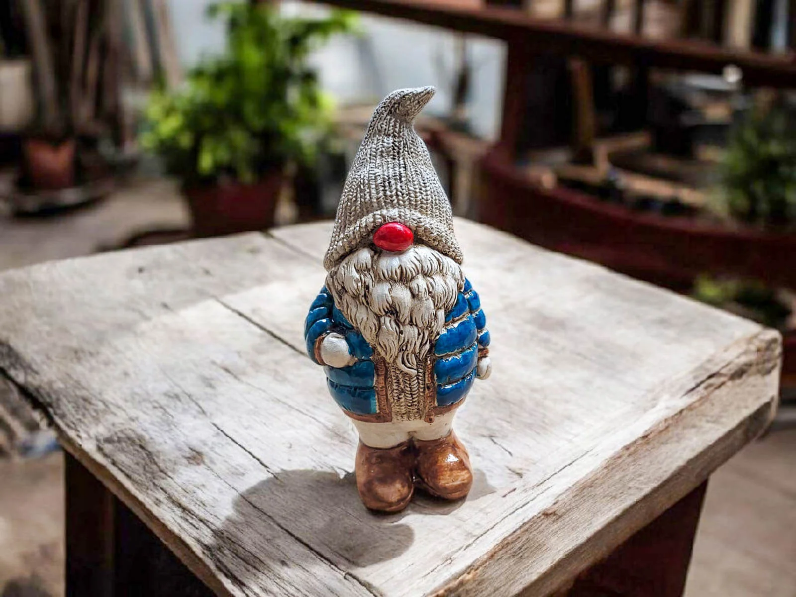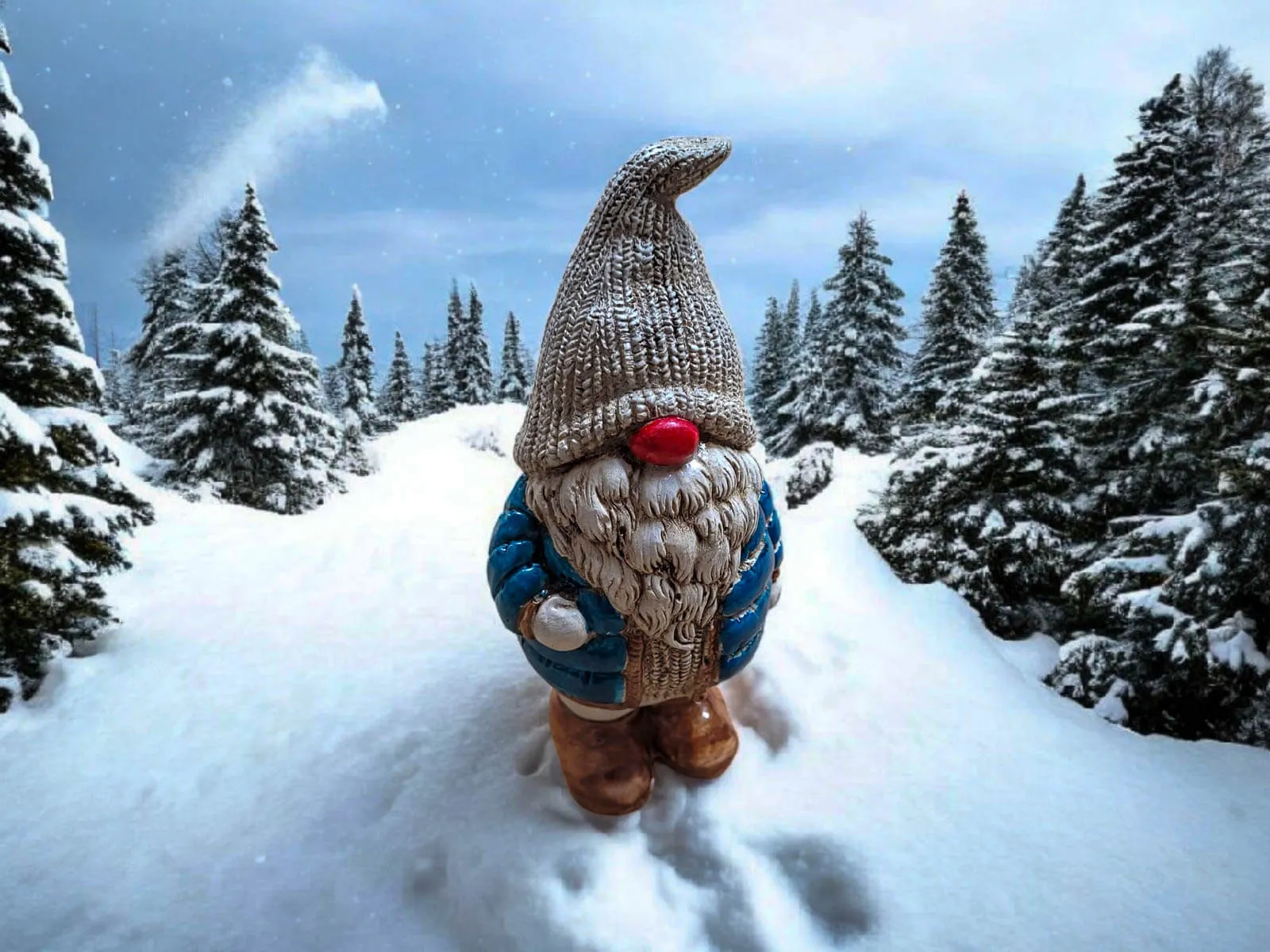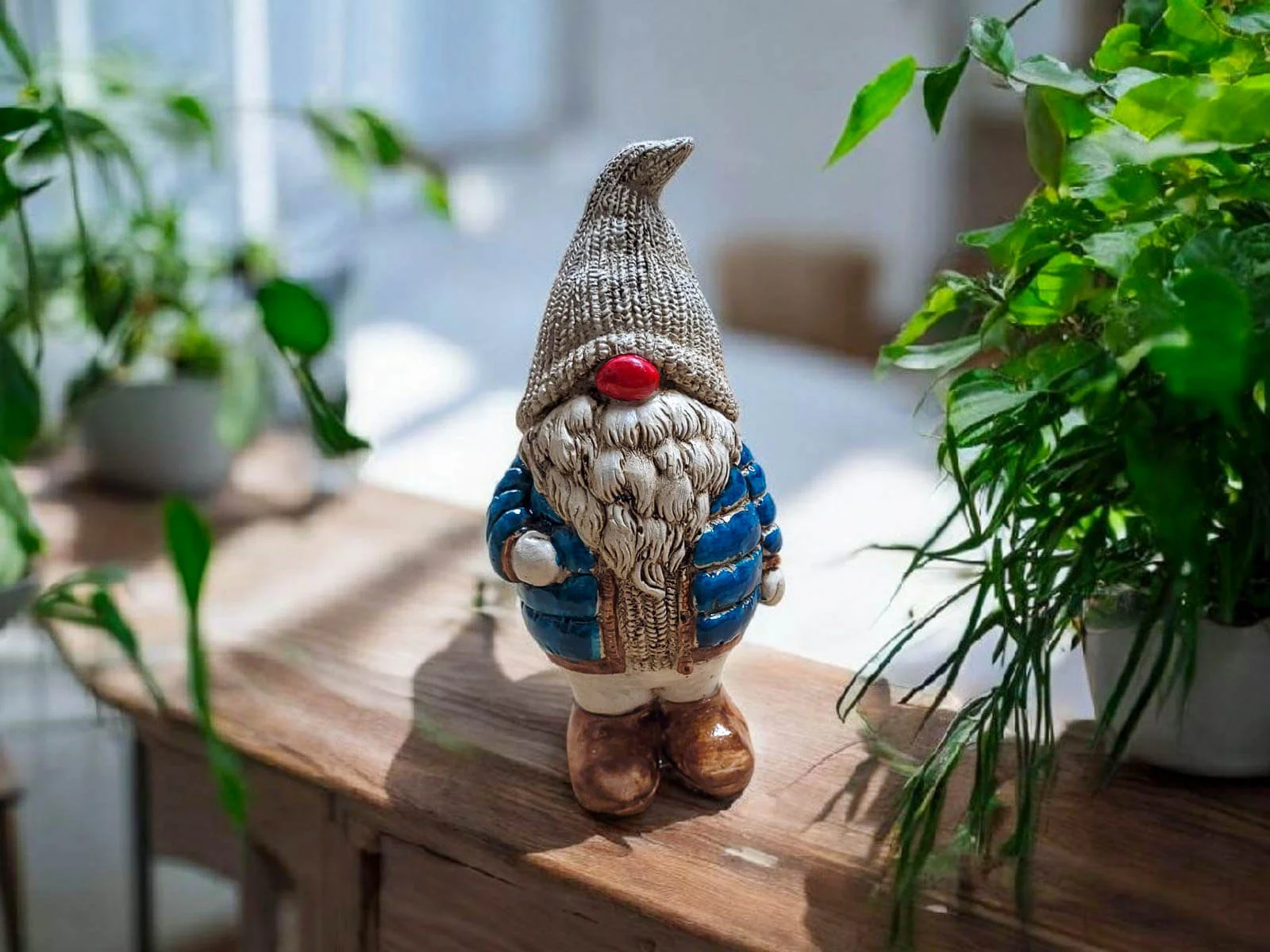 Skrzat ubrany jest w turkusową puchową, pikowaną kurtkę, która nadaje mu przytulny, zimowy charakter. Na głowie ma ciepłą, miękką czapę, opadającą na oczy, co dodaje mu uroku i tajemniczości. Jego długa, gęsta broda oraz duży, czerwony nos sprawiają, że wygląda niezwykle sympatycznie – jak prawdziwy strażnik domowego ciepła i świątecznego nastroju.