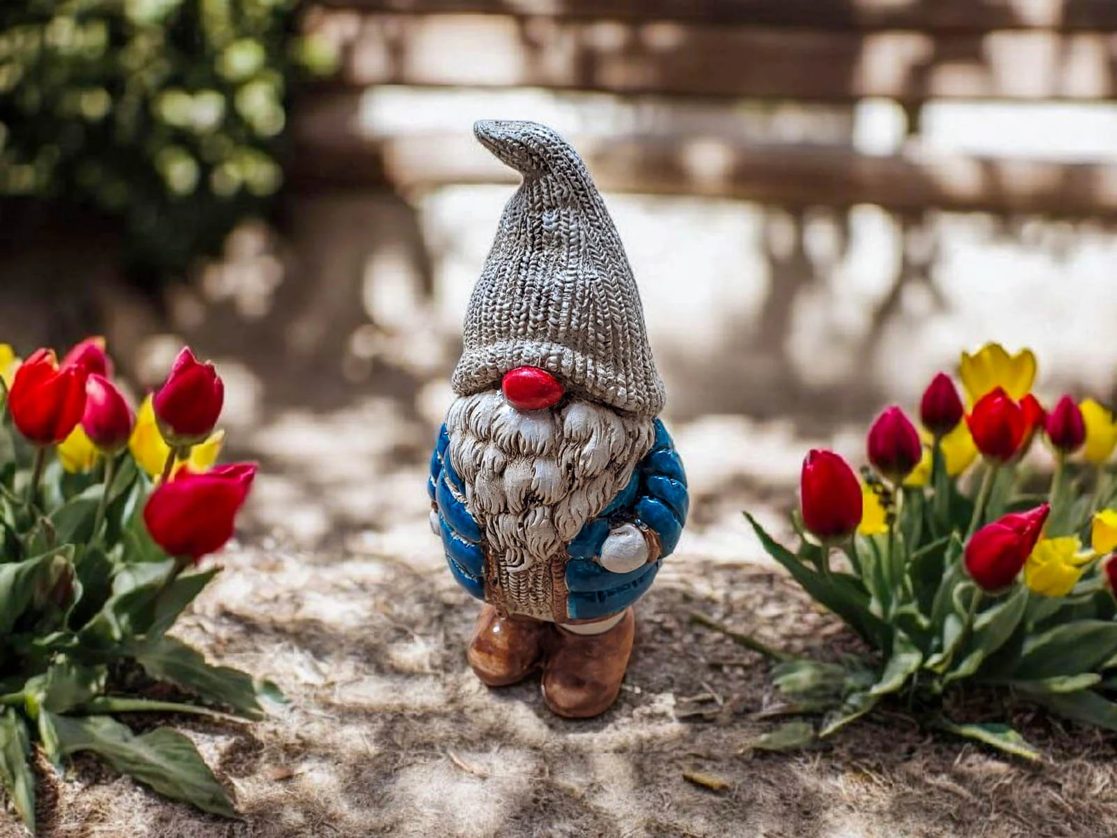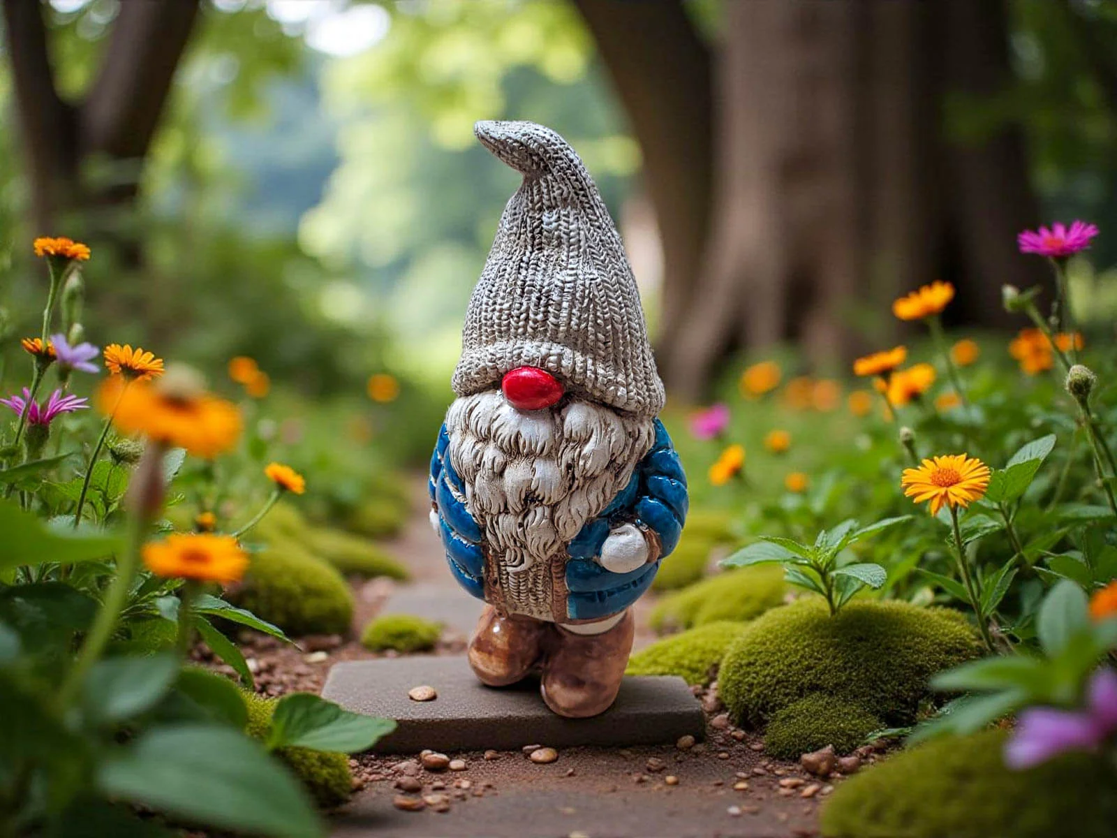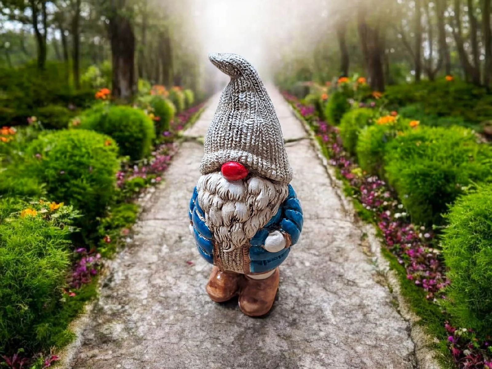 Skrzat ubrany jest w turkusową puchową, pikowaną kurtkę, która nadaje mu przytulny, zimowy charakter. Na głowie ma ciepłą, miękką czapę, opadającą na oczy, co dodaje mu uroku i tajemniczości. Jego długa, gęsta broda oraz duży, czerwony nos sprawiają, że wygląda niezwykle sympatycznie – jak prawdziwy strażnik domowego ciepła i świątecznego nastroju.