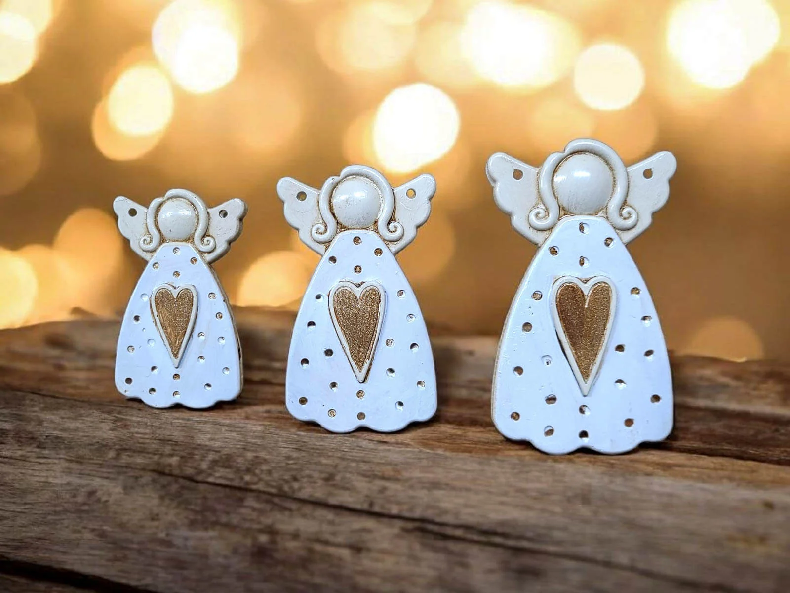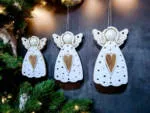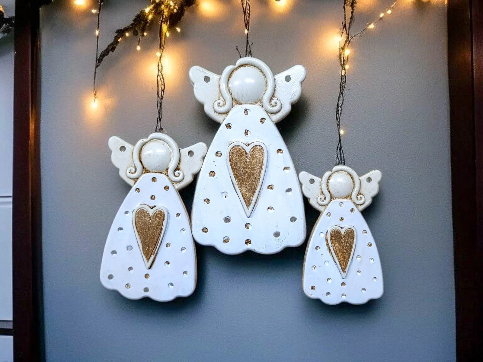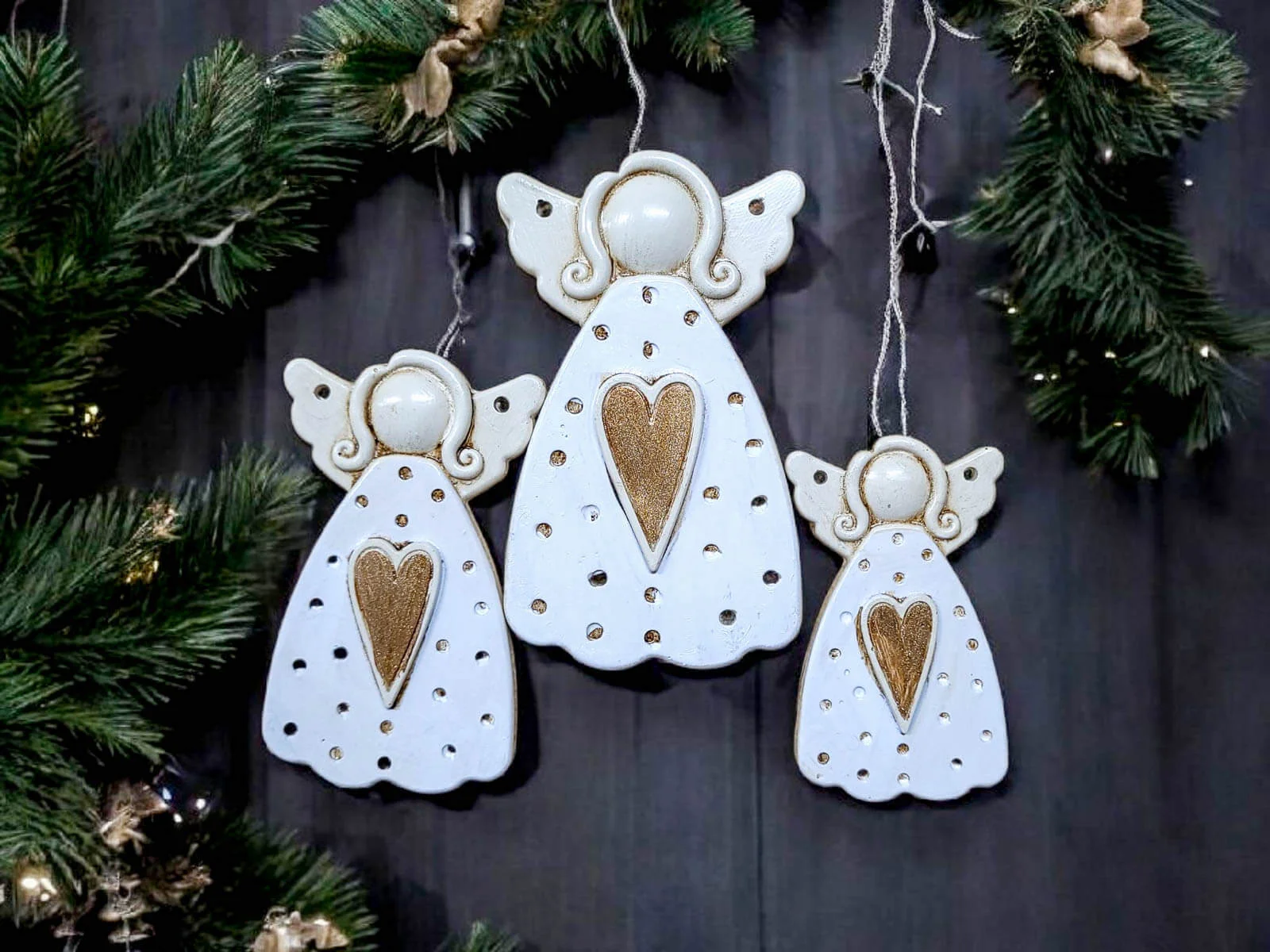 komplet trzech białych aniołków, wykonanych i malowanych ręcznie w Polsce. Każdy aniołek ma inne rozmiary, dzięki czemu razem tworzą harmonijny zestaw, idealny do powieszenia na choince, ścianie lub w oknie.