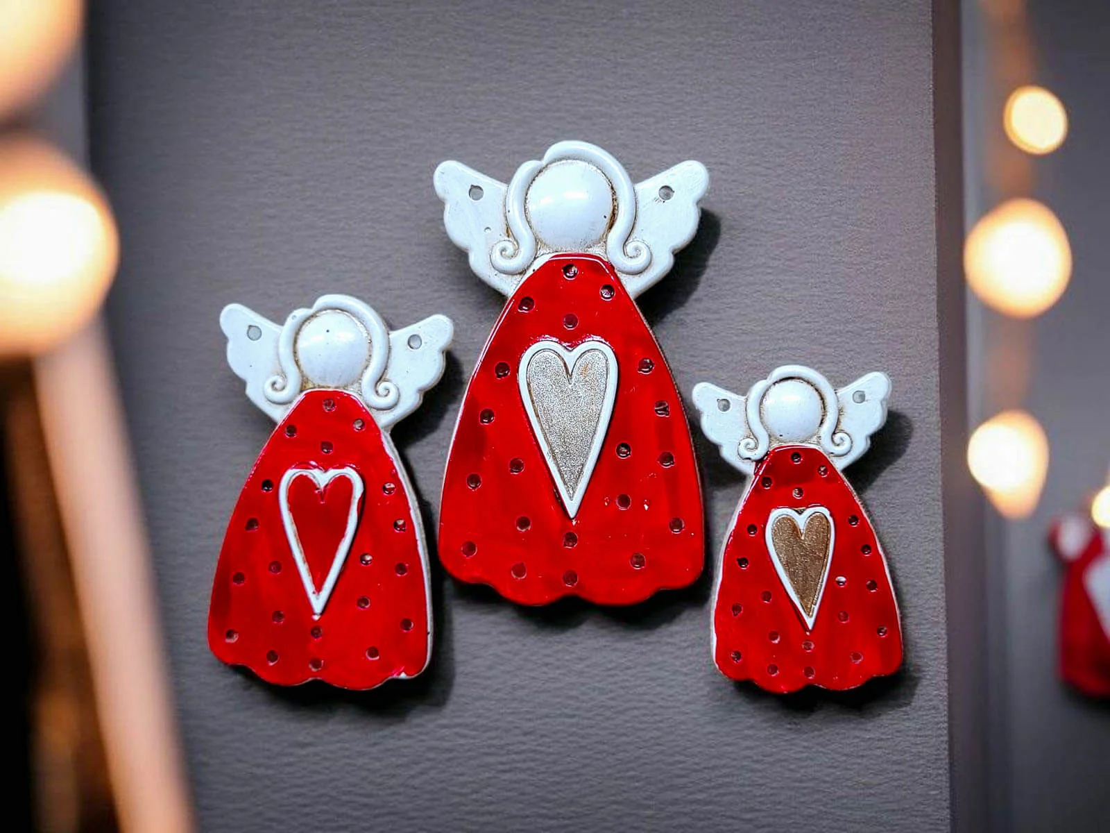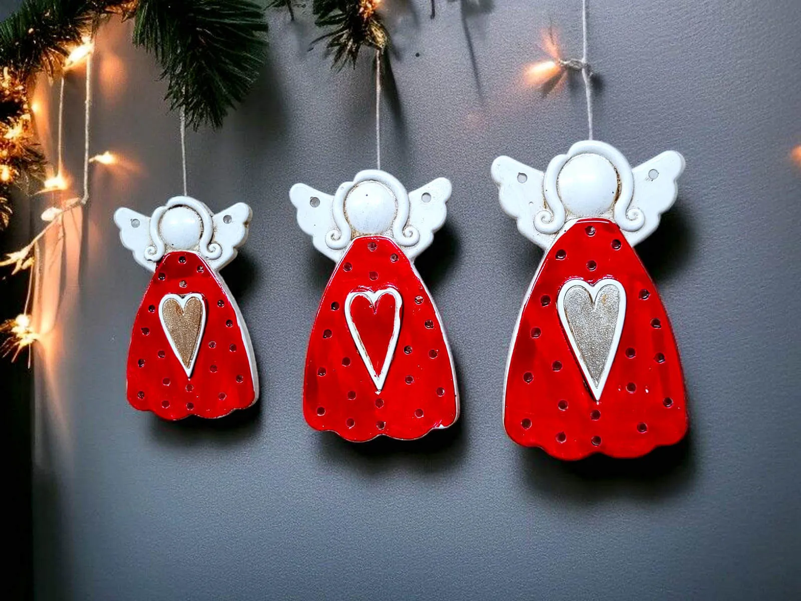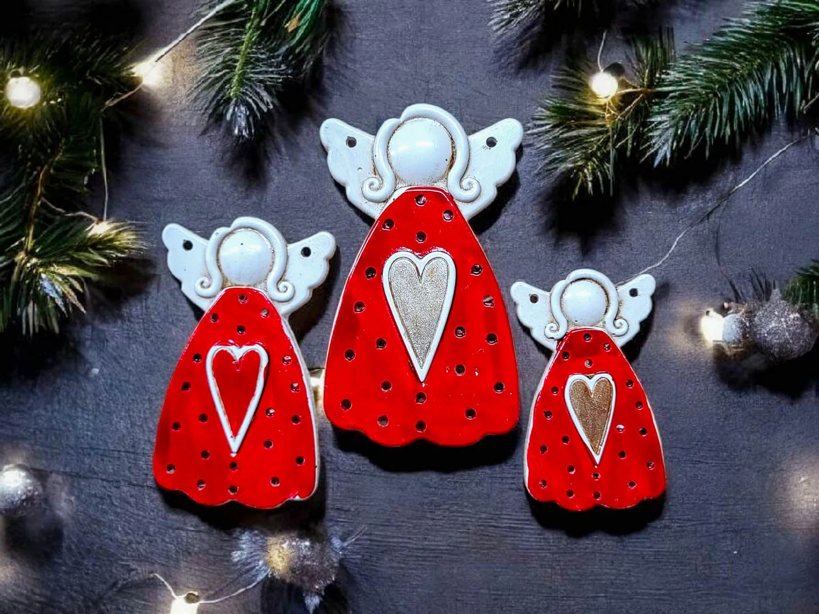 Komplet trzech czerwonych aniołków o różnych rozmiarach, stworzonych ręcznie przez polskich twórców z pasją i dbałością o każdy detal.