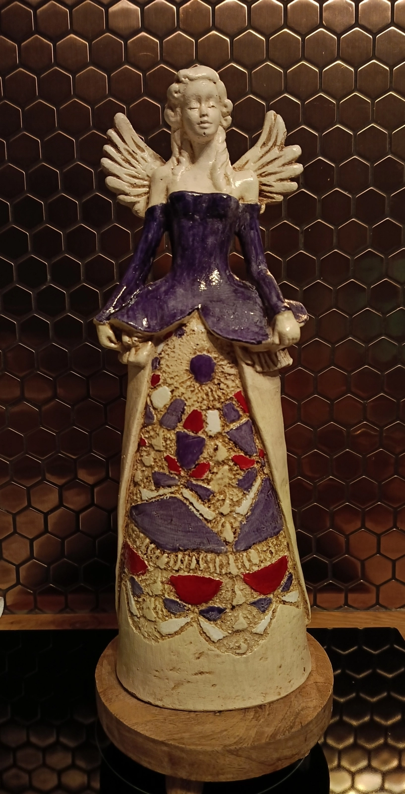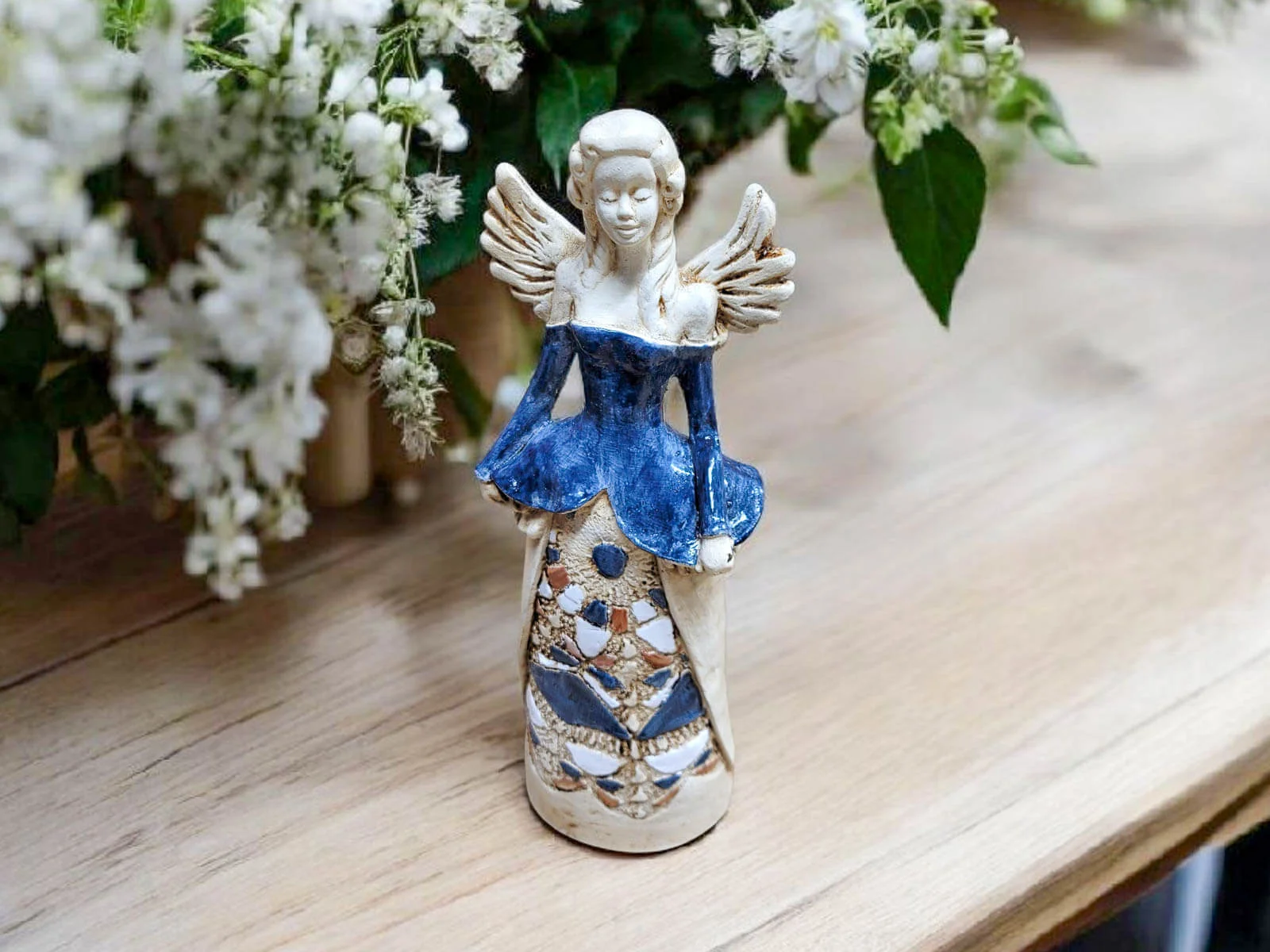 Anioł Anna to wyjątkowa, stojąca dekoracja z gipsu, tworzona ręcznie w polskiej pracowni. Jej suknia w odcieniu jeansowym, subtelnie ozdobiona białymi i żółtymi dodatkami, tworzy świeży i przyjemny dla oka kontrast, dzięki któremu aniołek wyróżnia się i natychmiast przyciąga uwagę.