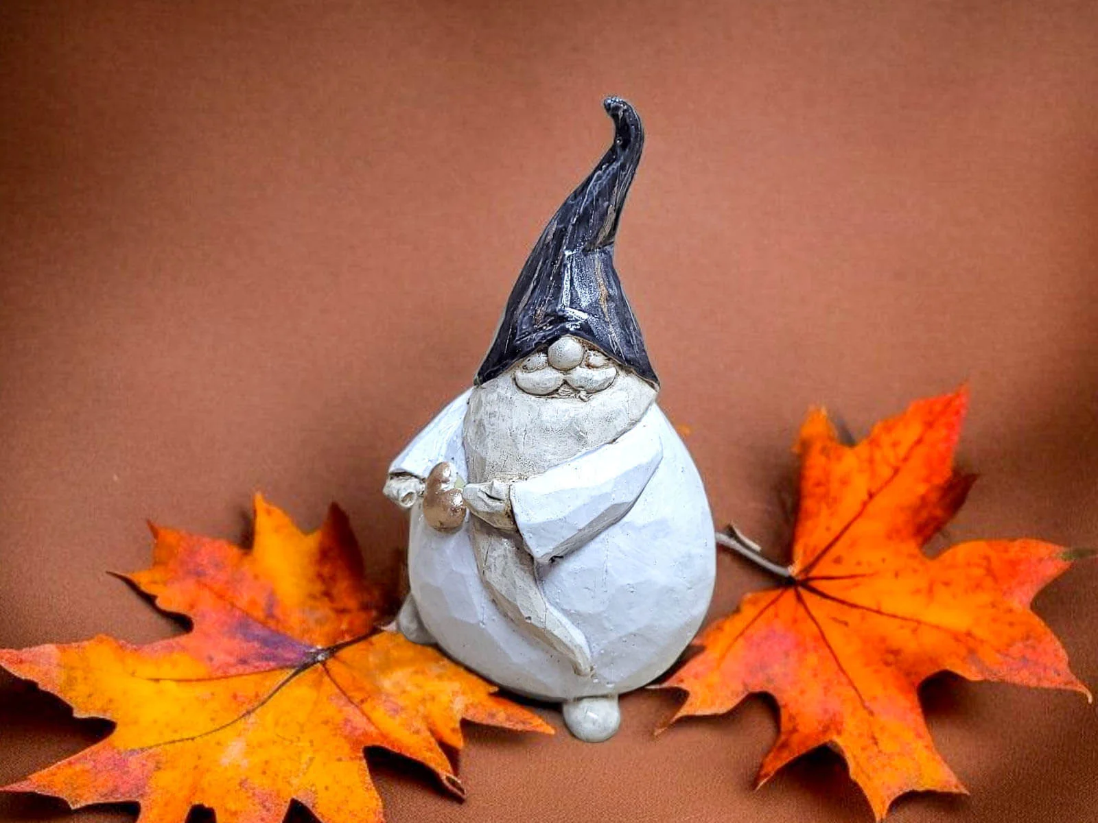 Skrzat Papcio Wąs to wyjątkowa, ręcznie wykonana figurka, która od pierwszego spojrzenia wywołuje uśmiech. To grubiutki skrzat o pełnej, przyjacielskiej sylwetce, ze szpiczastą czapką opadającą na oczy, pod którą skrywa się filigranowy, uroczy wąs. W swoich dłoniach trzyma wielkie serce — symbol dobroci, troski i bezinteresownej życzliwości.