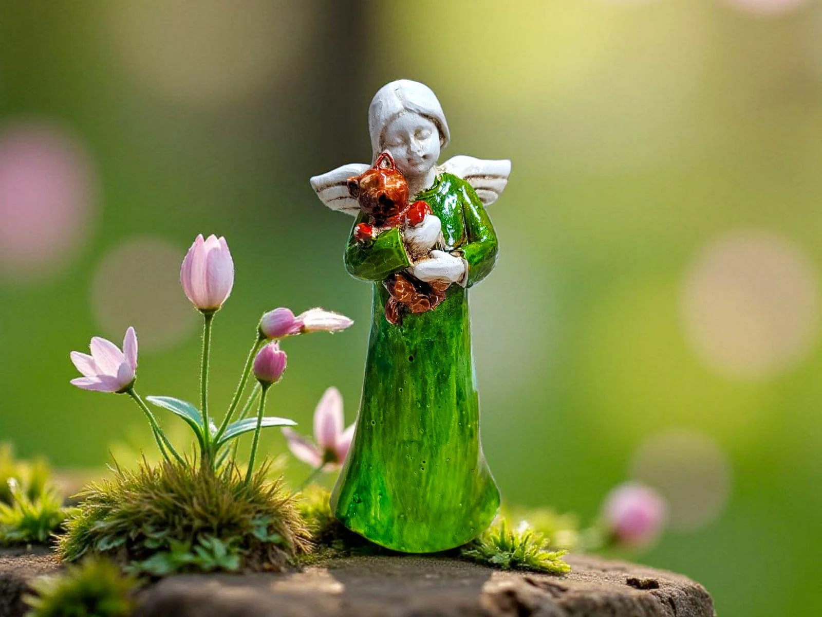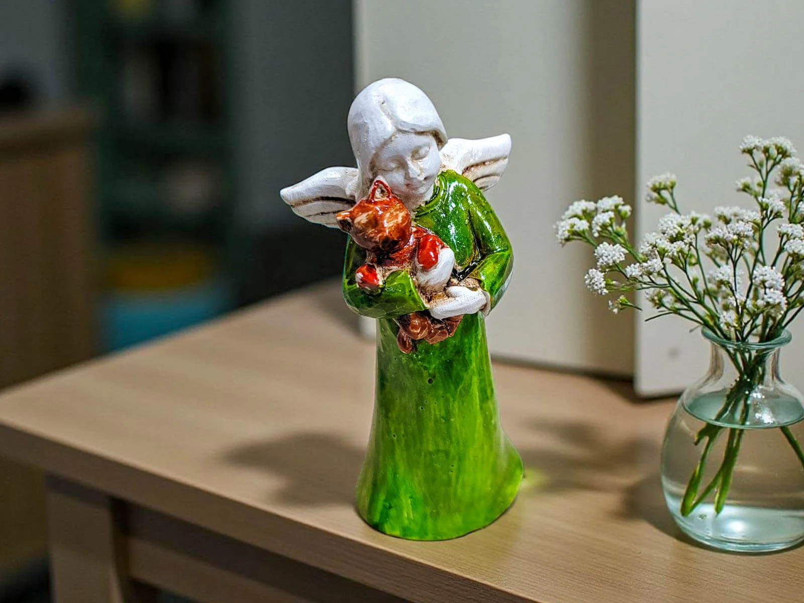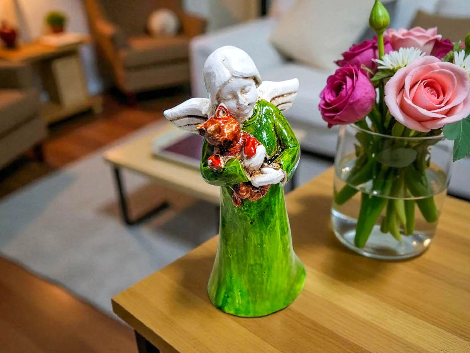 Urocza, ręcznie robiona figurka przedstawiająca małego aniołka – dziewczynkę trzymającą w ramionach kotka. Każdy egzemplarz wykonany ręcznie jest z dbałością o szczegóły, dzięki czemu każda figurka jest niepowtarzalna.
