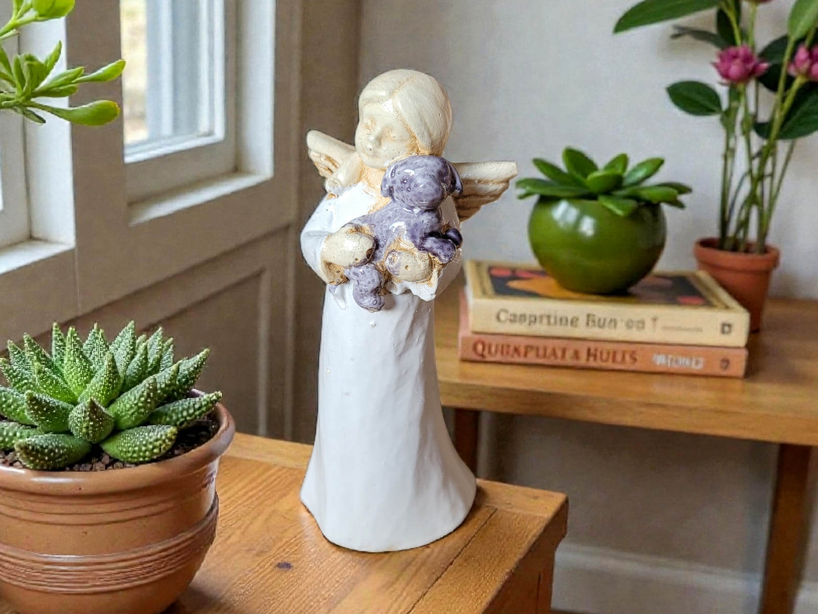 Urocza, ręcznie robiona figurka przedstawiająca małego aniołka – dziewczynkę trzymającą w ramionach pieska. Każdy egzemplarz wykonany jest z dbałością o szczegóły, a każda figurka jest niepowtarzalna.