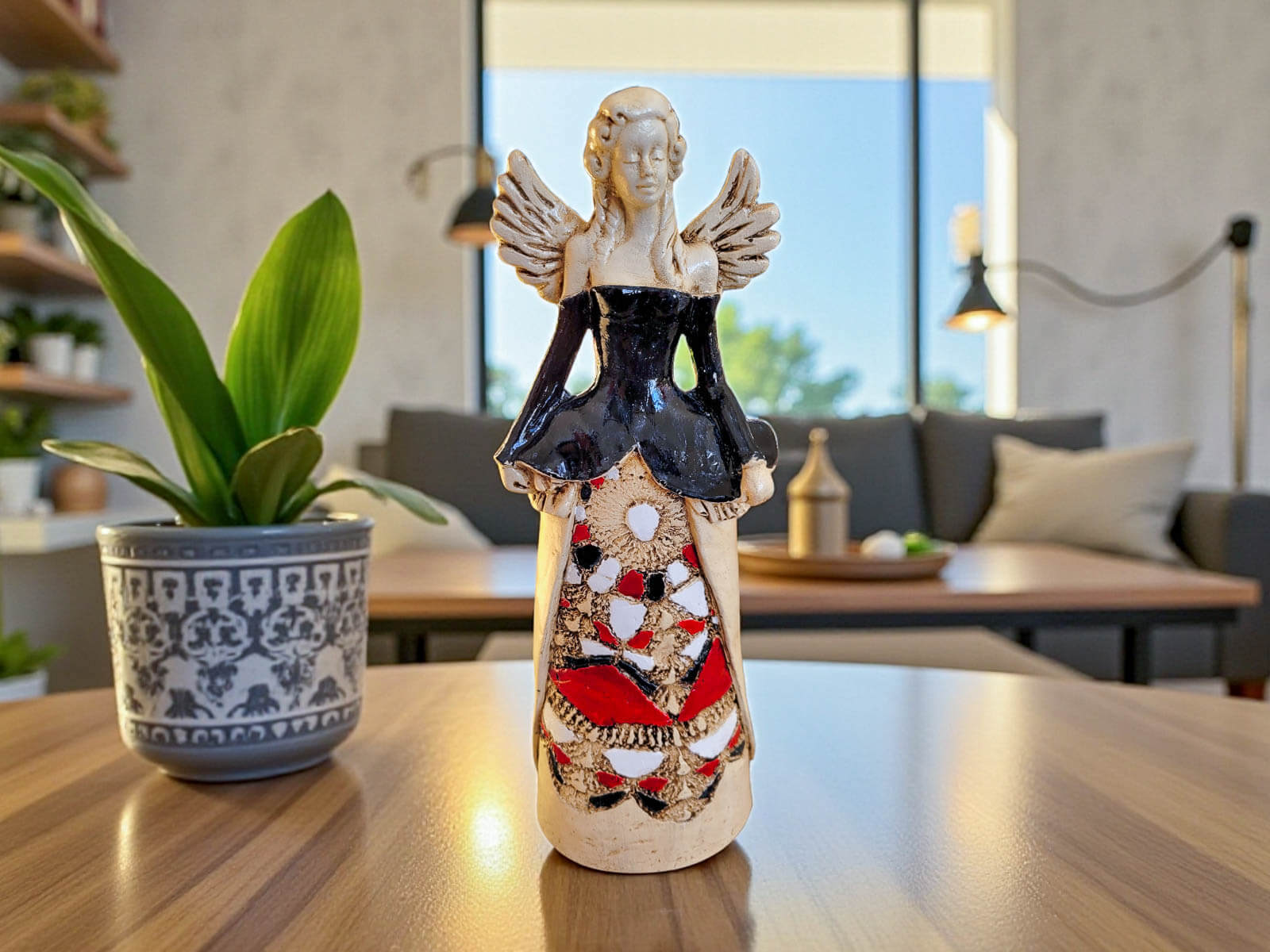 Dlaczego Anioł Anna to piękny element dekoracyjny? Ożywia i rozjaśnia przestrzeń – połączenie jeansowego koloru z bielą i żółcią nadaje wnętrzu lekkości i pozytywnej energii. Zwabia wzrok i budzi ciekawość – ręcznie wykonane zdobienia i delikatne detale sprawiają, że każda figurka jest niepowtarzalna. Uniwersalna dekoracja do wielu miejsc – doskonale prezentuje się na komodzie, półce, parapecie, stoliku nocnym czy w przedpokoju. Pasuje do wnętrz nowoczesnych, skandynawskich, rustykalnych i minimalistycznych.