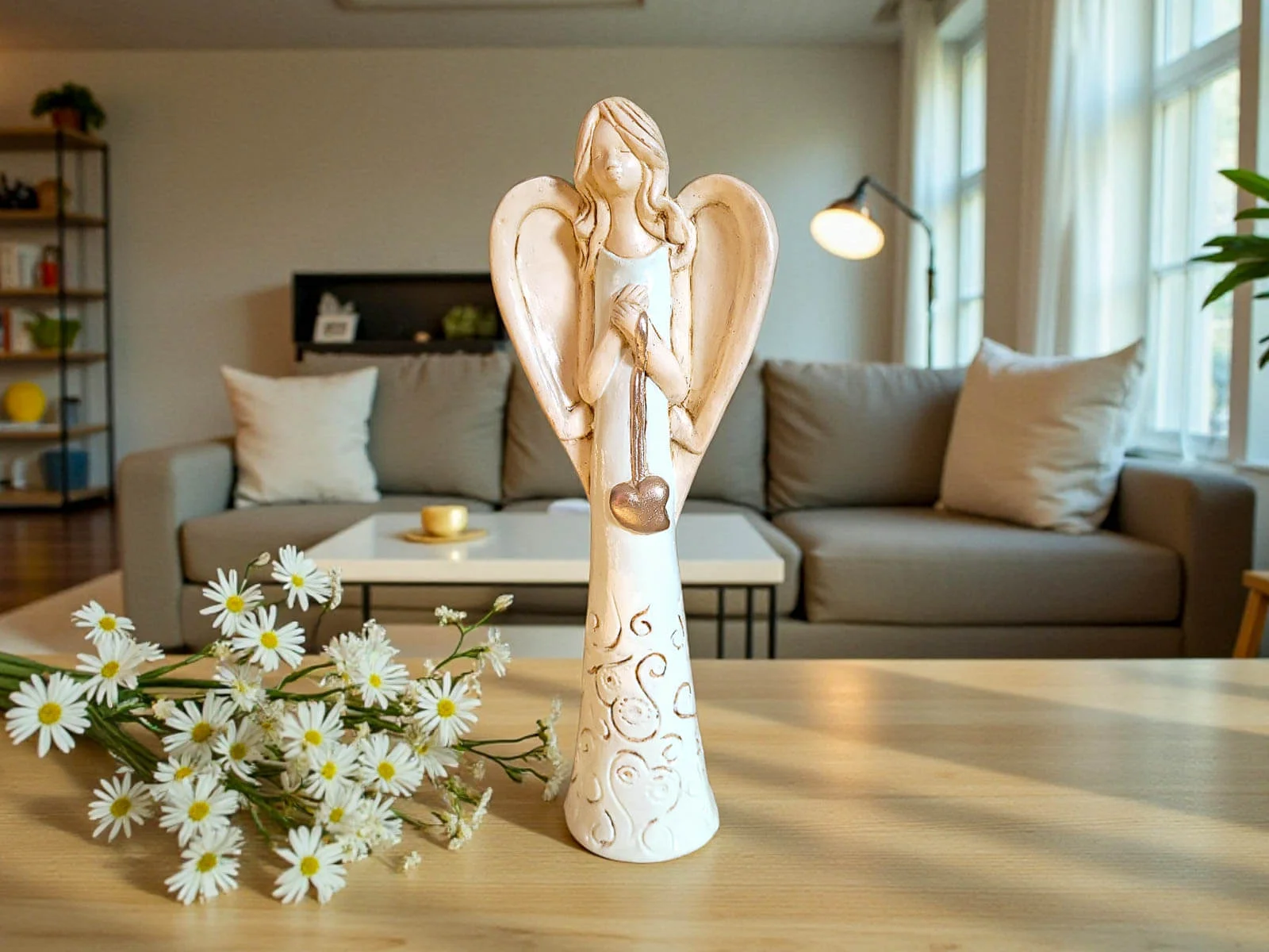 Jeśli anioł ma zostać wręczony jako prezent możemy go również elegancko zapakować w przeźroczysty celofan wiązany ekologicznym sznurkiem. Dzięki temu anioł będzie wyglądał jeszcze bardziej dostojnie i będzie gotowy do wręczenia. Dla wygody możesz również od razu zakupić papierową białą torbę prezentową.