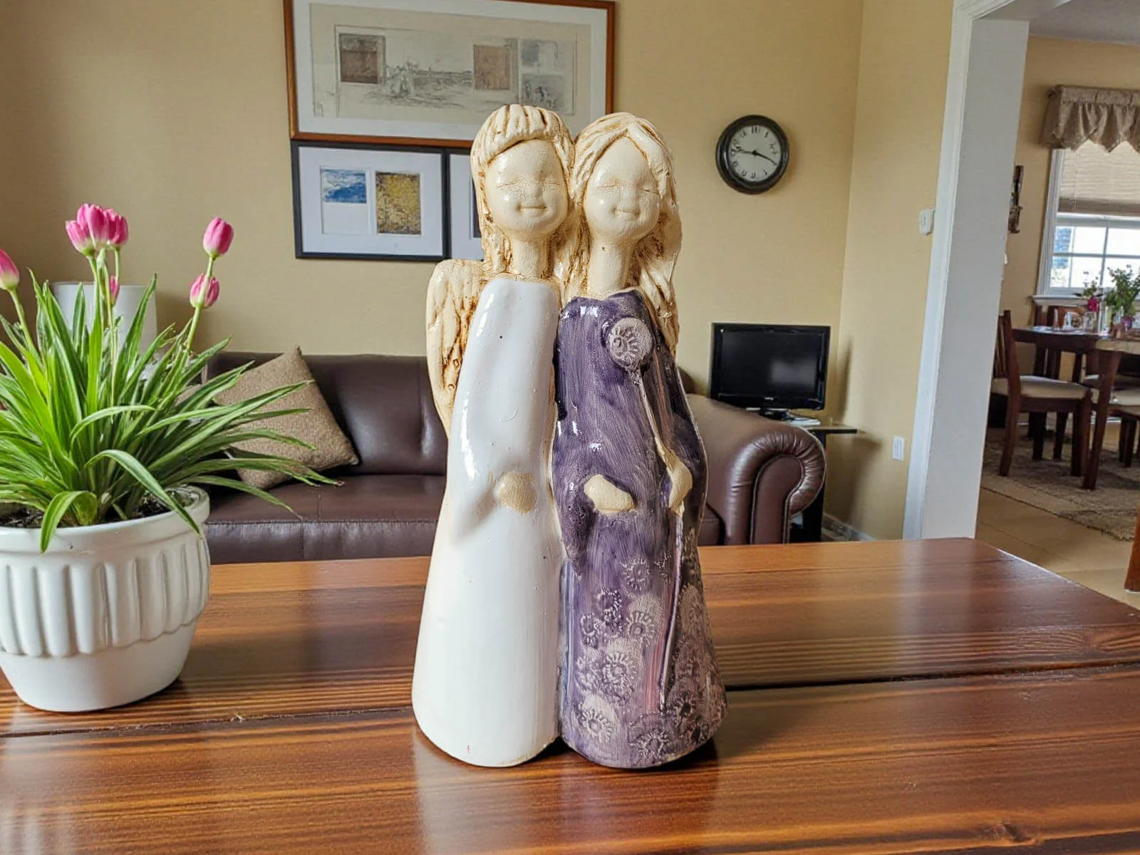 Jeśli anioł ma zostać wręczony jako prezent możemy go również elegancko zapakować w przeźroczysty celofan wiązany ekologicznym sznurkiem. Dzięki temu anioł będzie wyglądał jeszcze bardziej dostojnie i będzie gotowy do wręczenia. Dla wygody możesz również od razu zakupić papierową białą torbę prezentową.