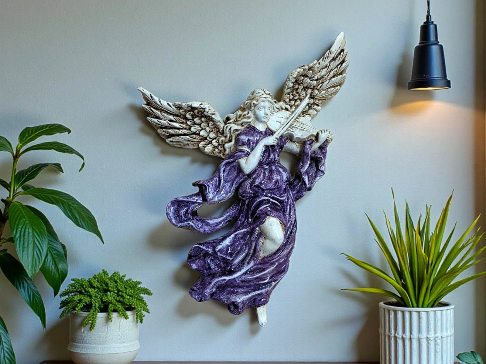 Anioł ze Skrzypcami w szaro fioletowej sukni to unikatowa, ręcznie robiona figurka do powieszenia na ścianie dzięki której wnętrze Twojego domu nabierze niepowtarzalnego uroku. Każdy element figurki emanuje starannością, tradycją i artystycznym kunsztem.