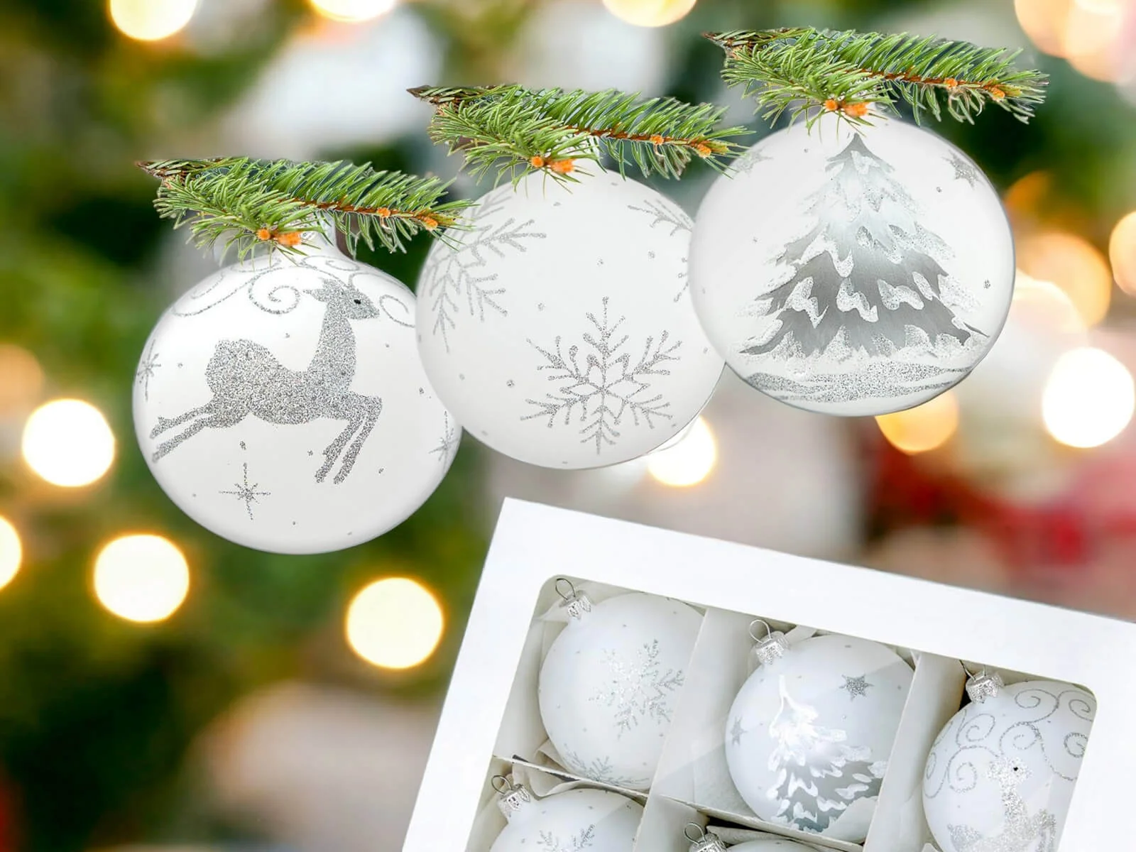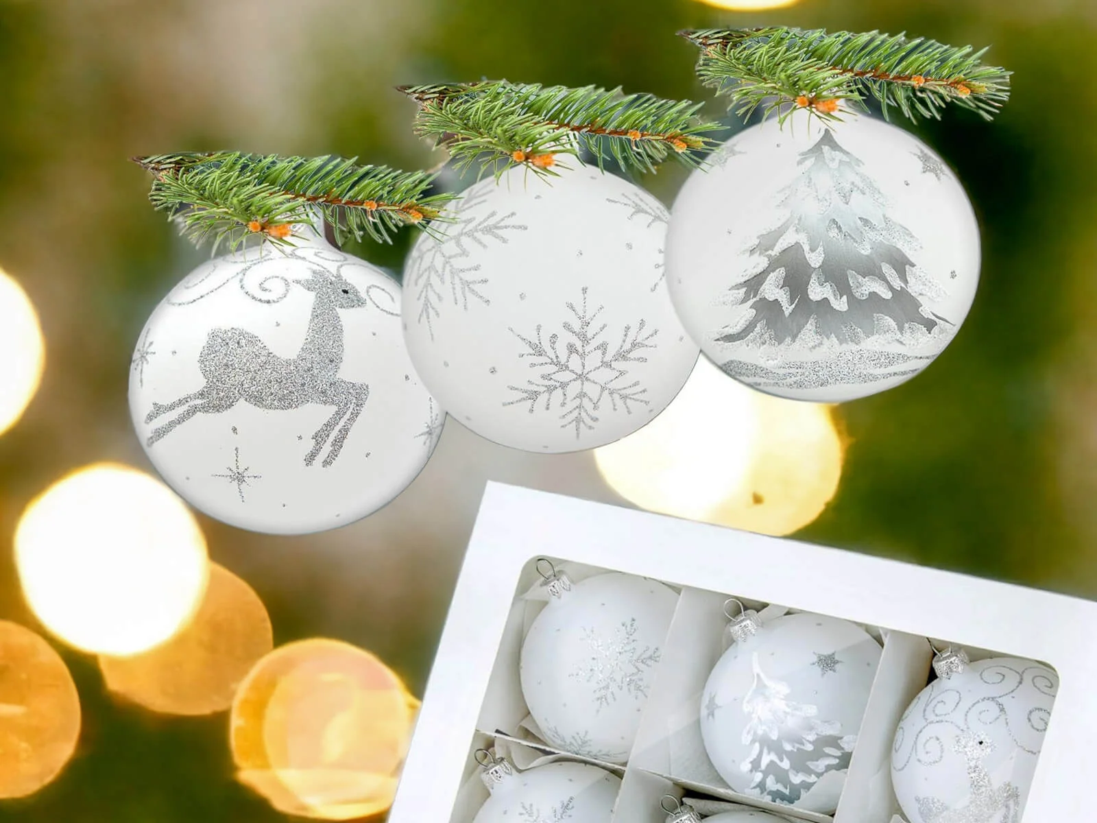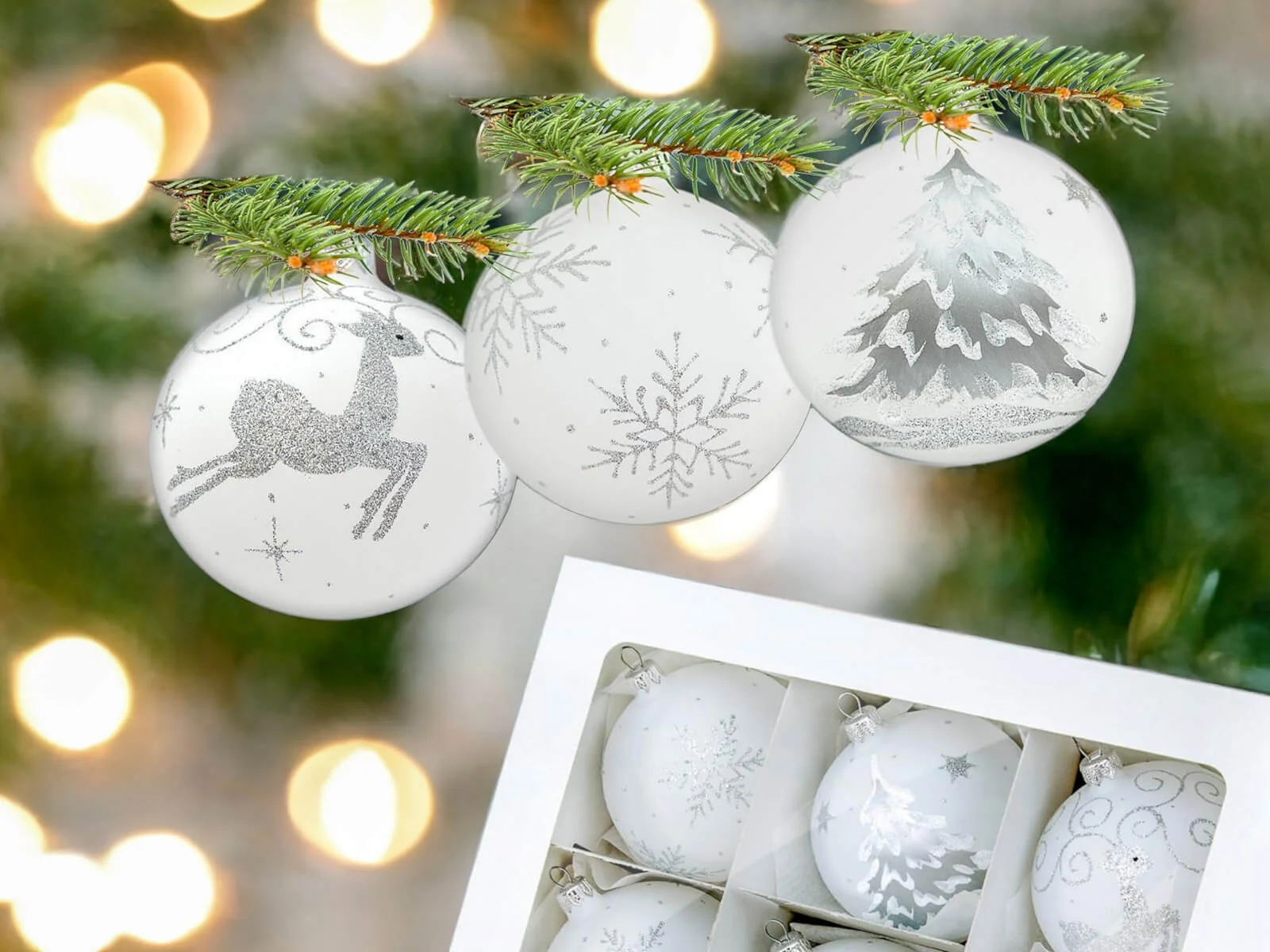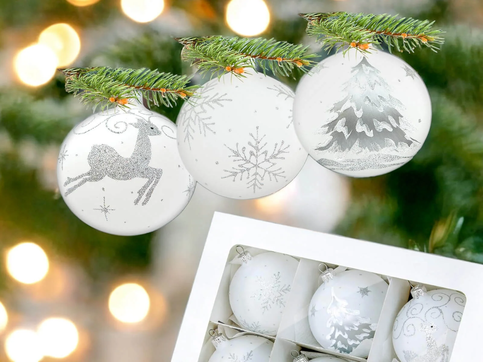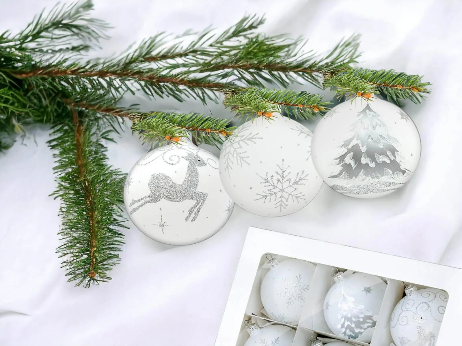 Jelonek, choinka i płatki śniegu - każdy z tych wzorów występuje po dwie sztuki w komplecie, tworząc zróżnicowany i harmonijny zestaw ozdób. Srebrne zdobienia są precyzyjnie rozmieszczone na każdej bombce, nadając im wytwornego i stylowego wyglądu. Biały śnieg, malowany z dbałością o detale, tworzy na powierzchni każdej ozdoby piękną zimową scenę.