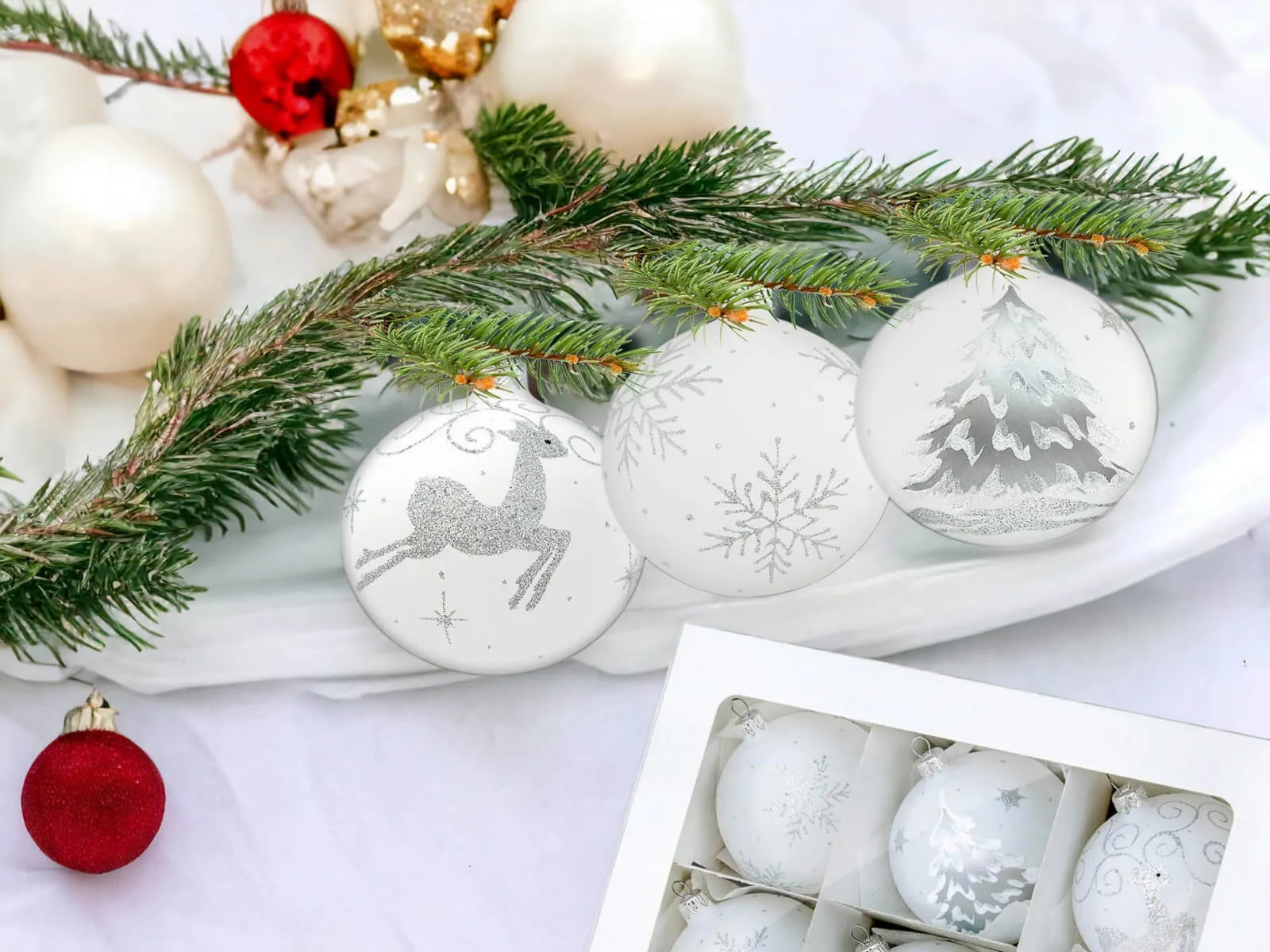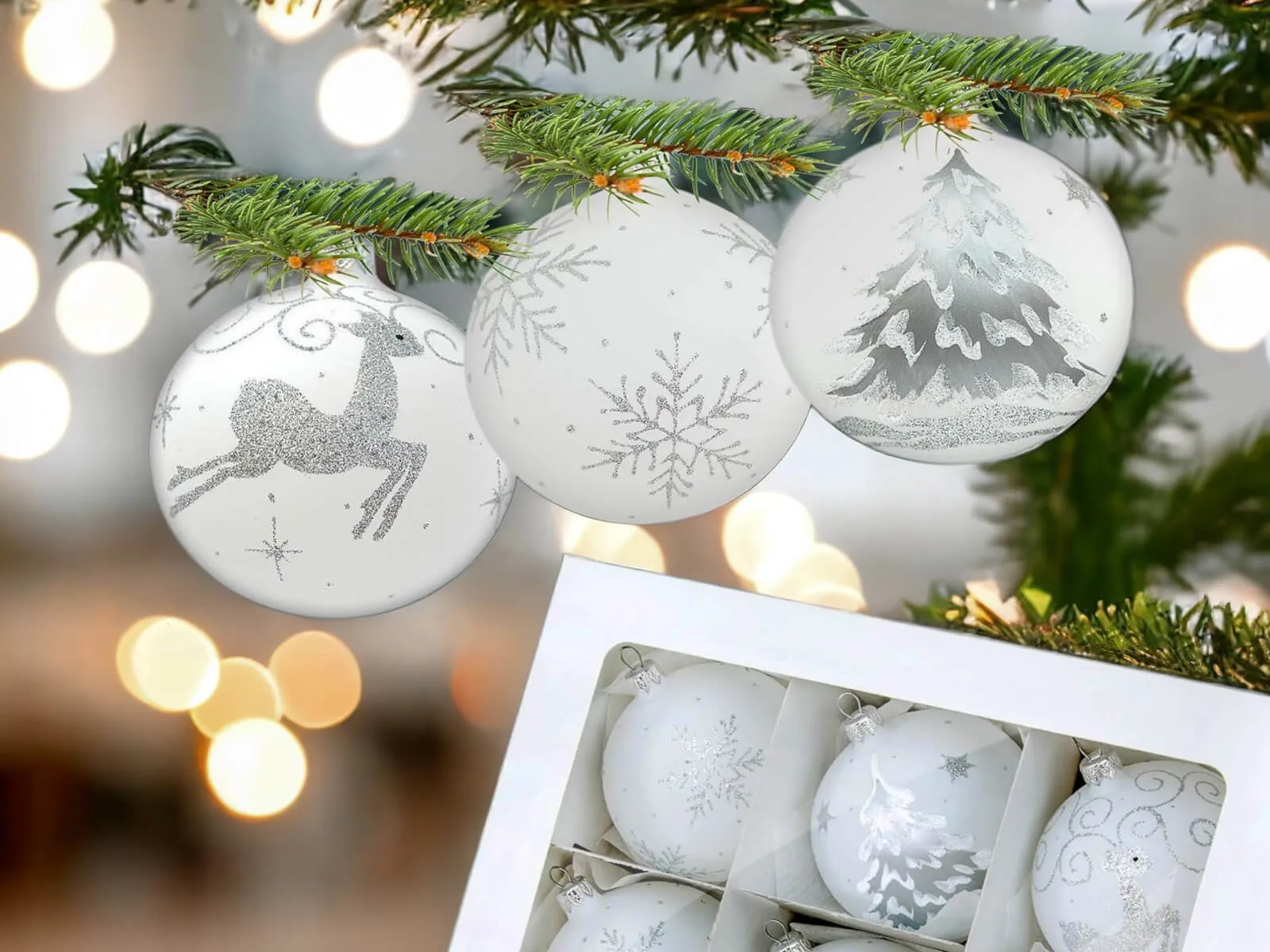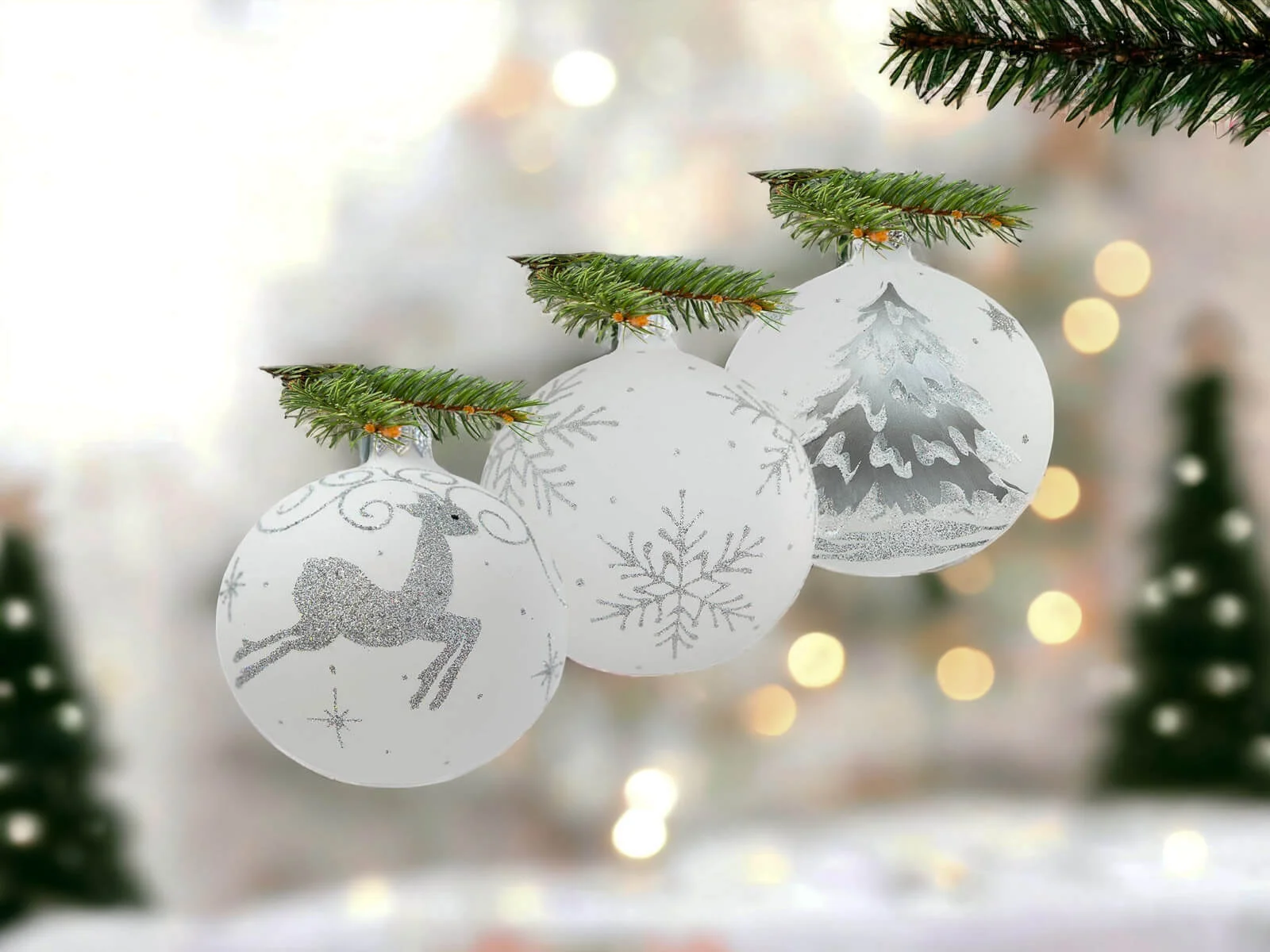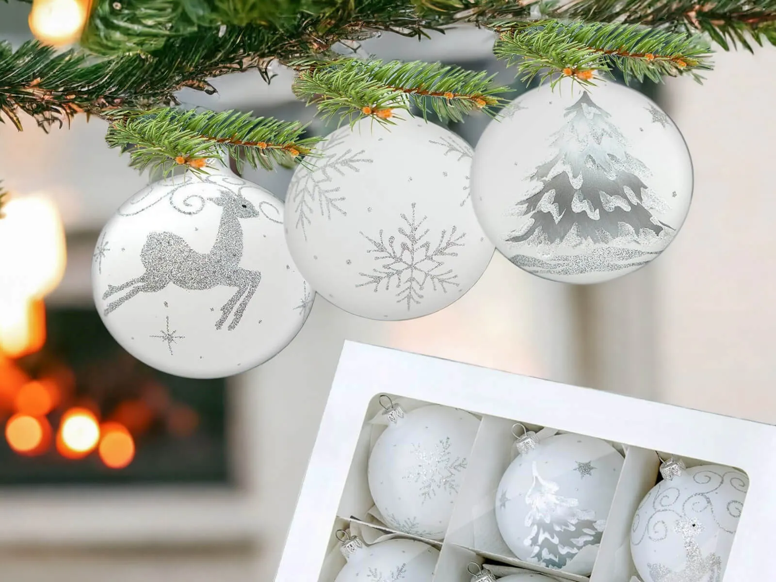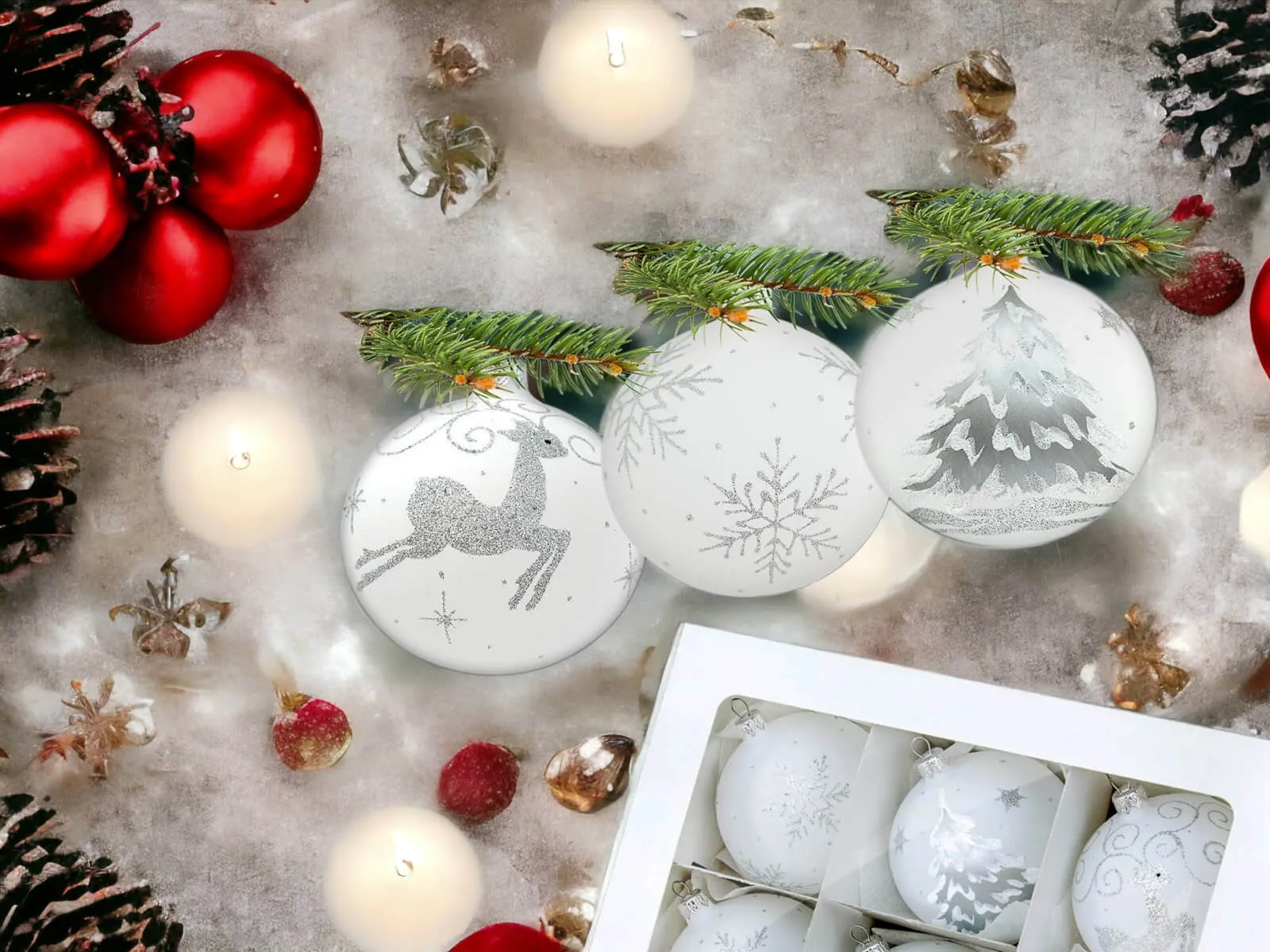 Jelonek, choinka i płatki śniegu - każdy z tych wzorów występuje po dwie sztuki w komplecie, tworząc zróżnicowany i harmonijny zestaw ozdób. Srebrne zdobienia są precyzyjnie rozmieszczone na każdej bombce, nadając im wytwornego i stylowego wyglądu. Biały śnieg, malowany z dbałością o detale, tworzy na powierzchni każdej ozdoby piękną zimową scenę.