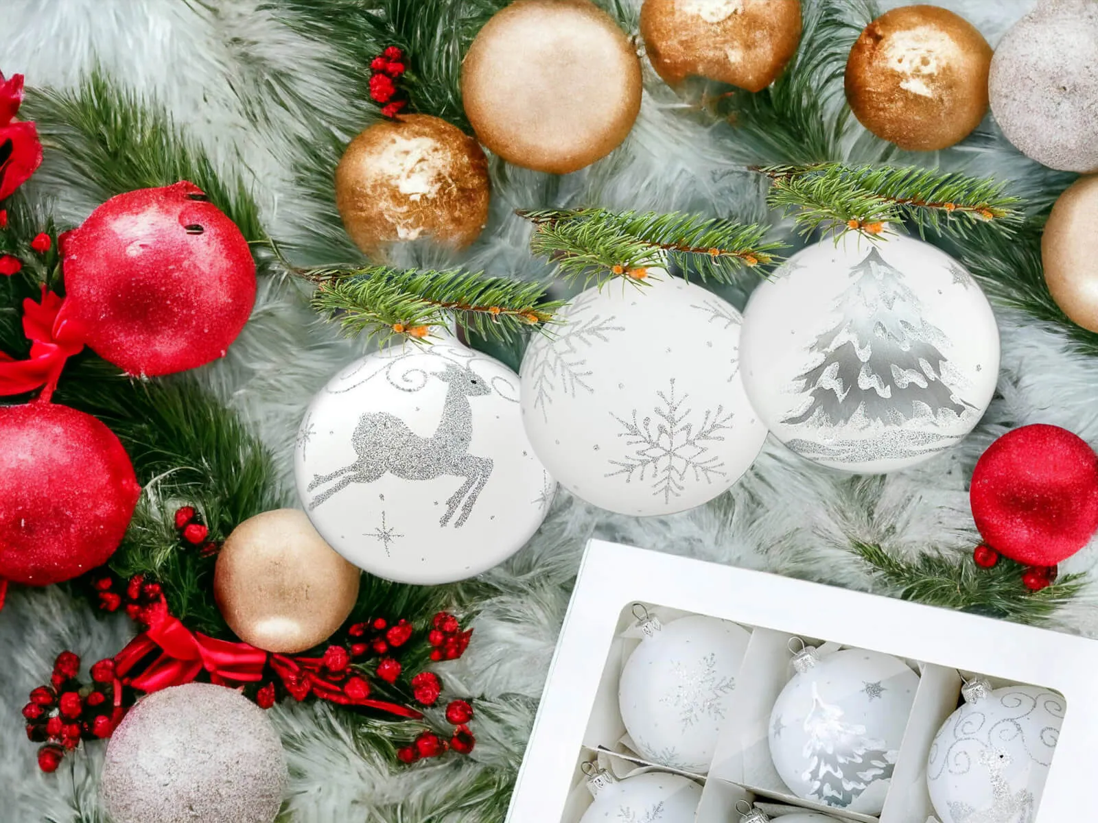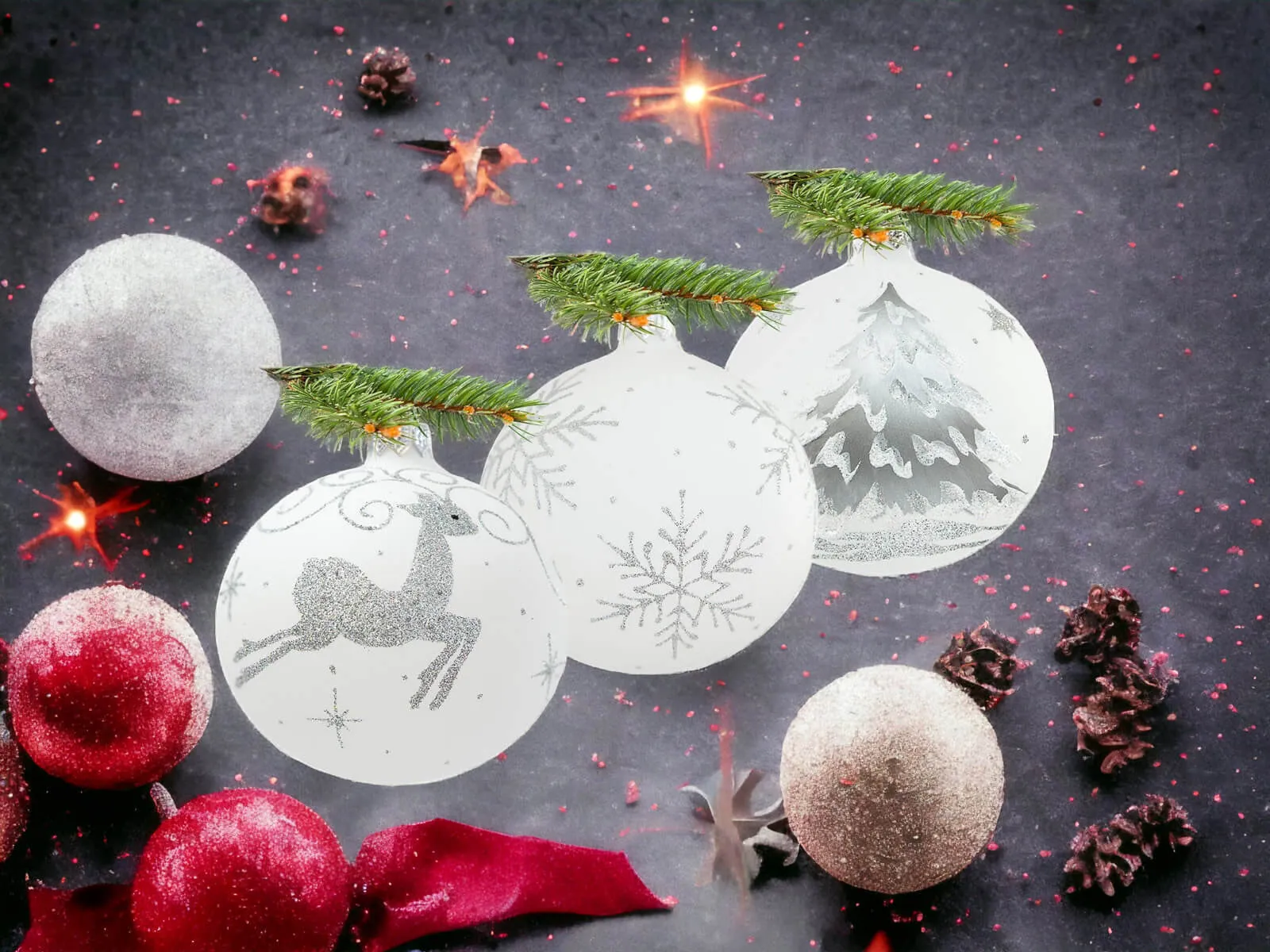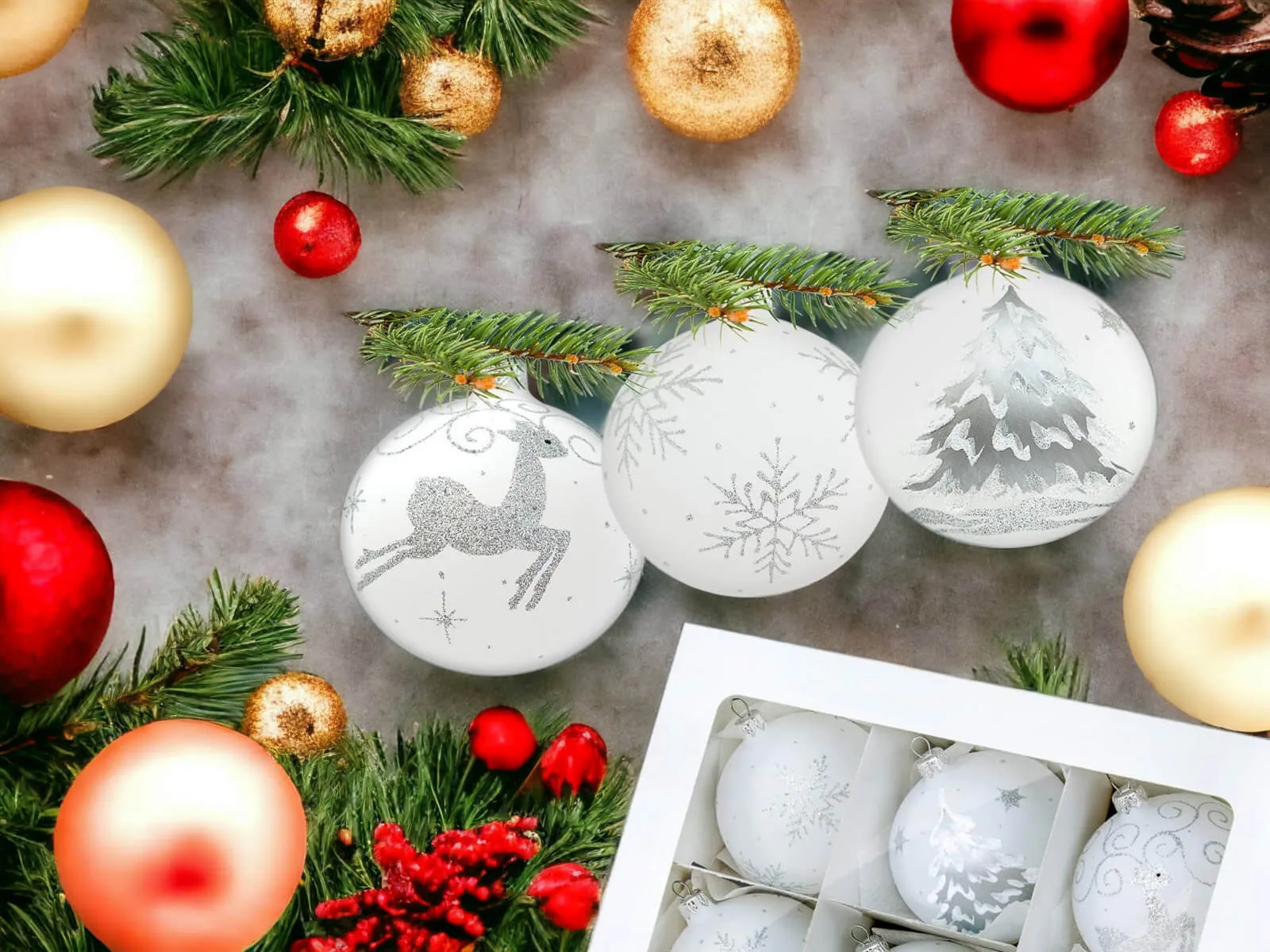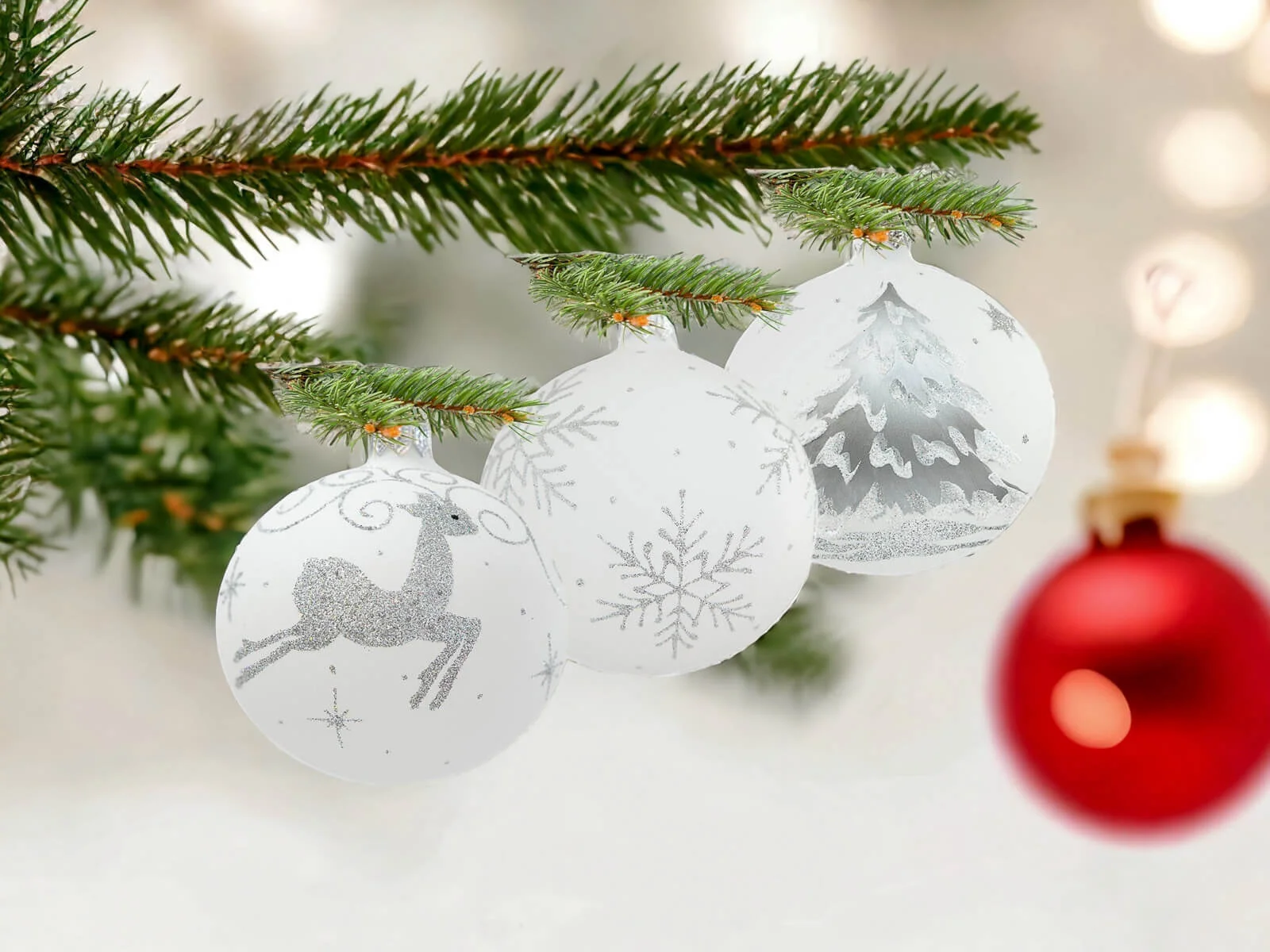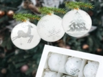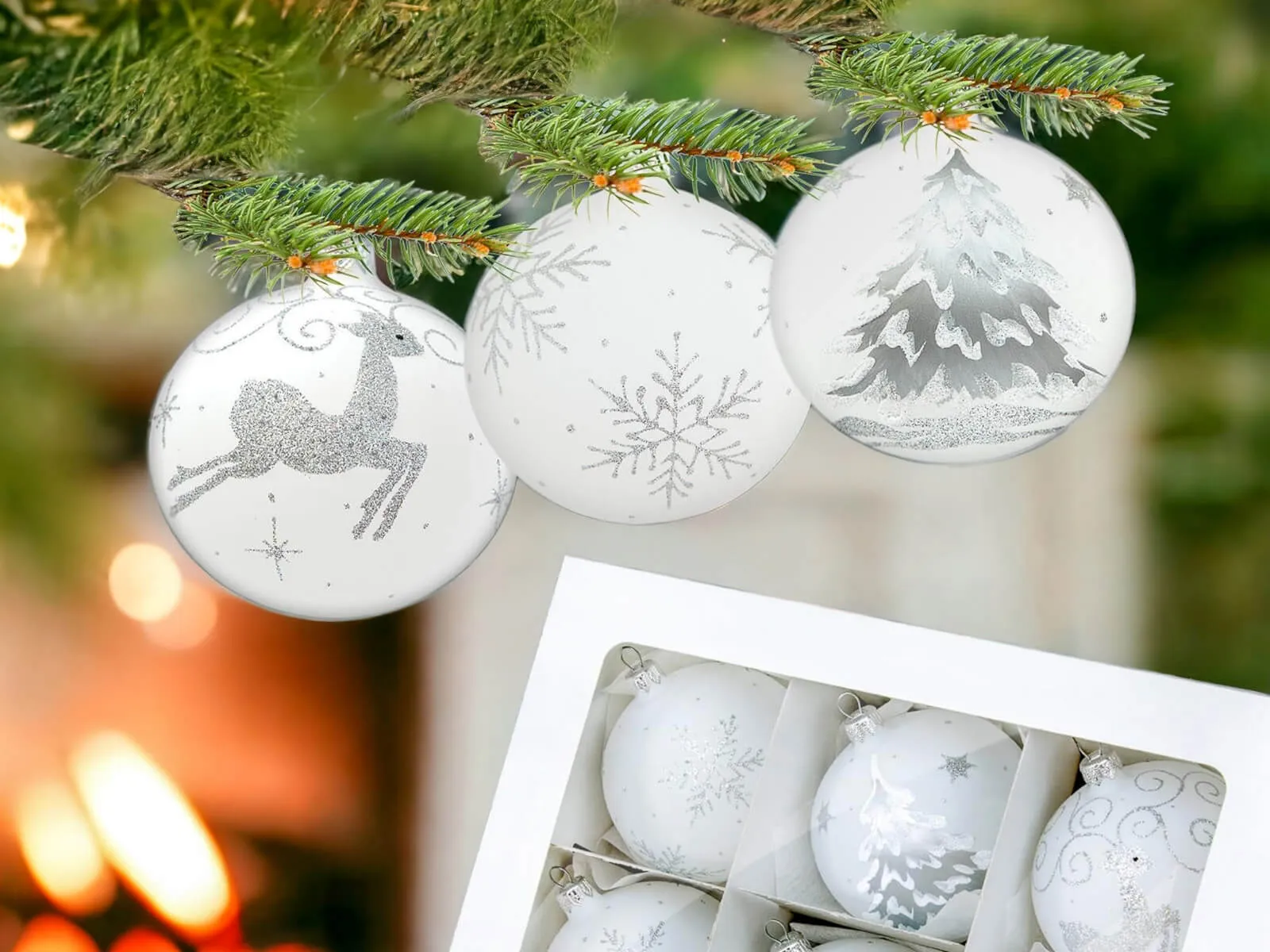 Jelonek, choinka i płatki śniegu - każdy z tych wzorów występuje po dwie sztuki w komplecie, tworząc zróżnicowany i harmonijny zestaw ozdób. Srebrne zdobienia są precyzyjnie rozmieszczone na każdej bombce, nadając im wytwornego i stylowego wyglądu. Biały śnieg, malowany z dbałością o detale, tworzy na powierzchni każdej ozdoby piękną zimową scenę.