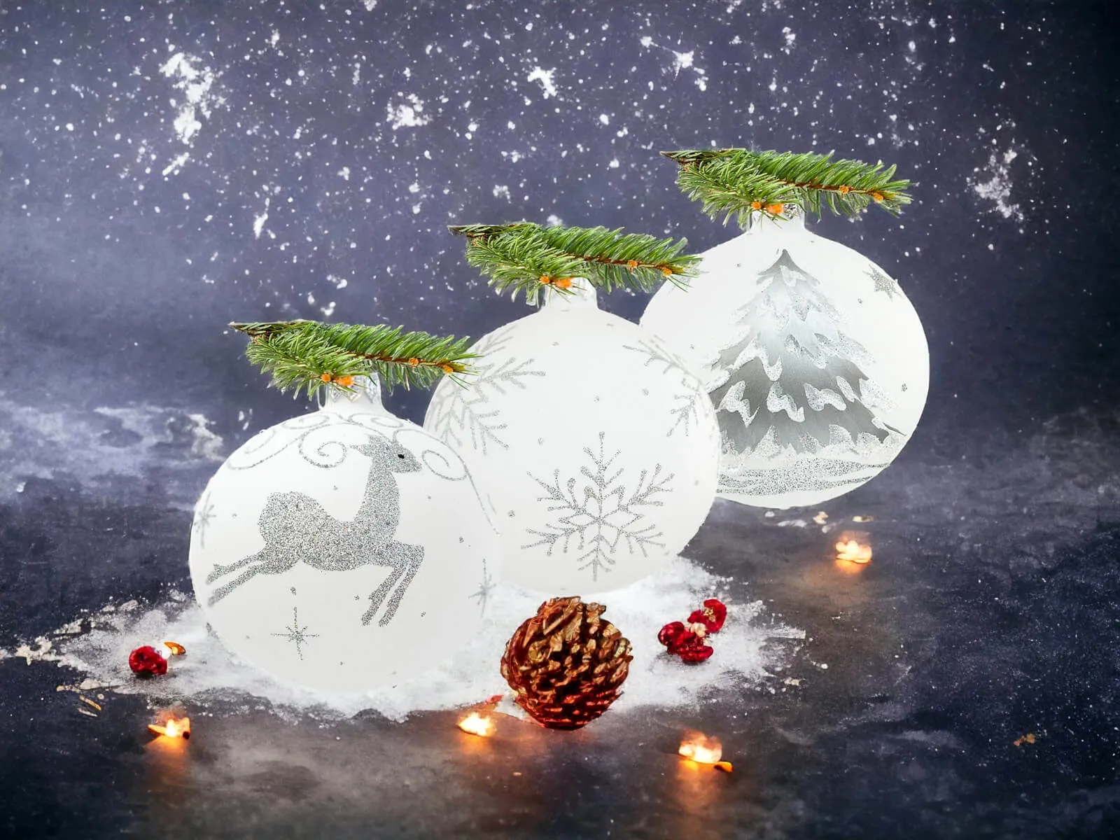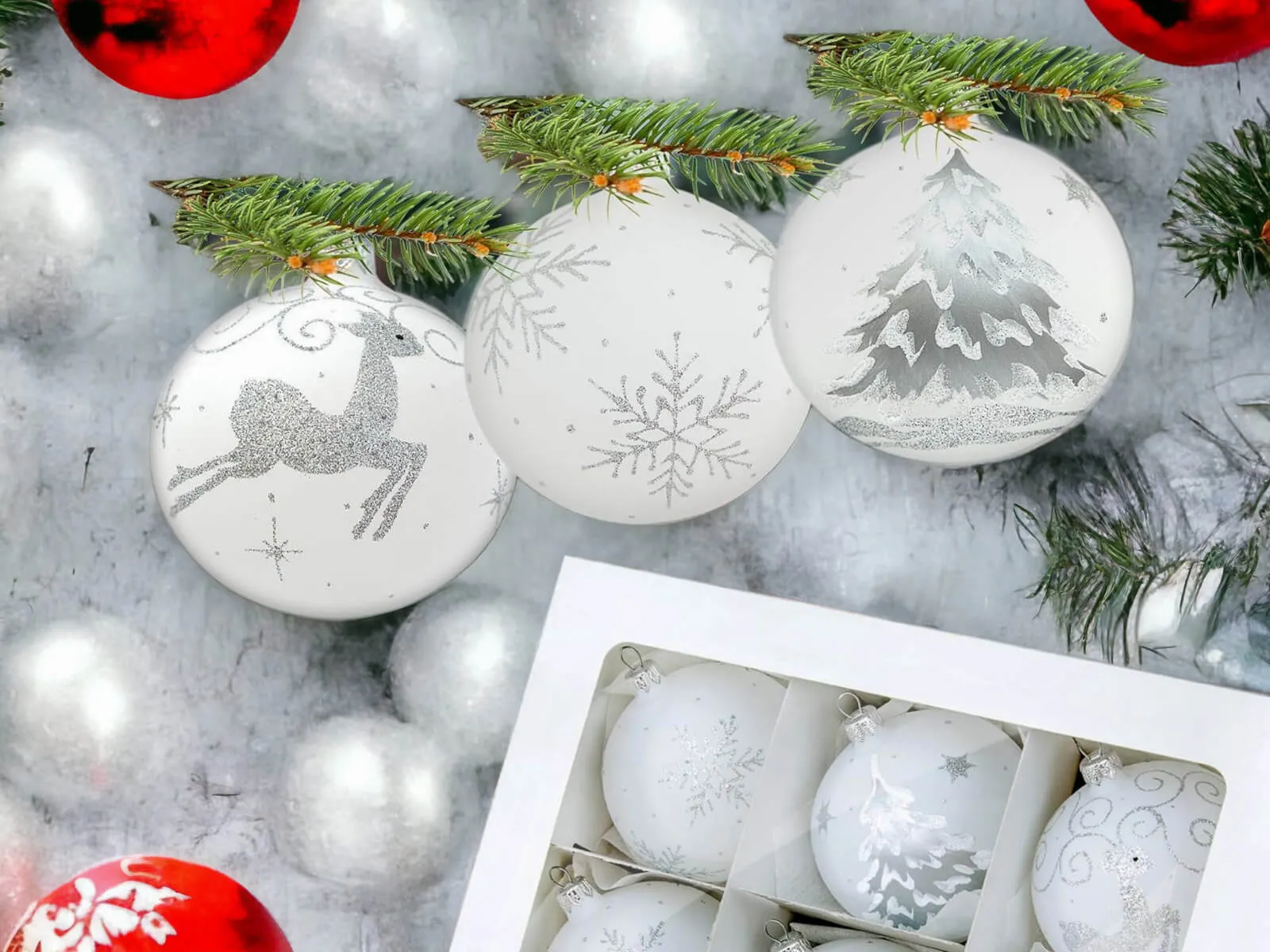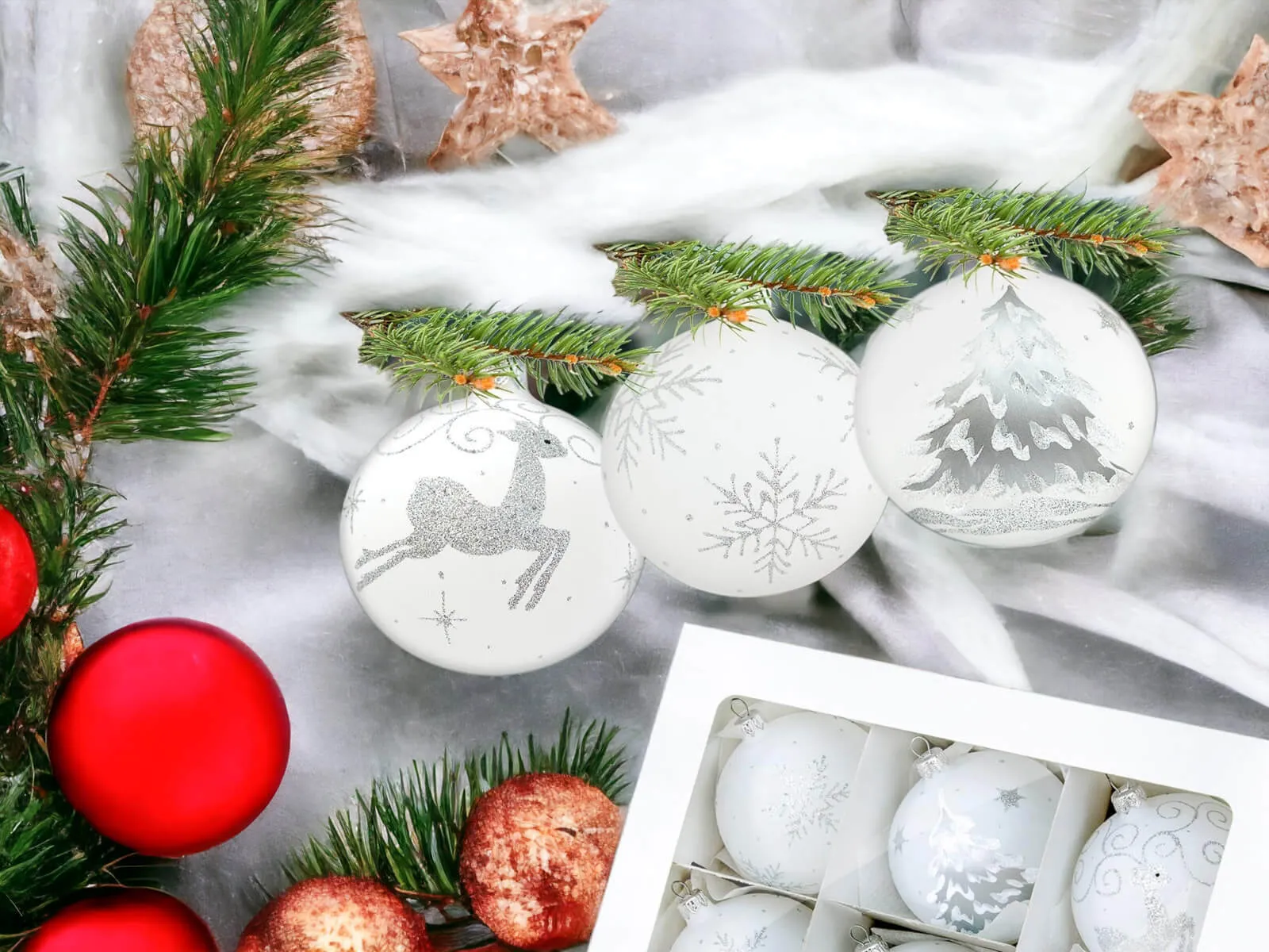 Komplet szklanych bombek choinkowych Srebrne Jelonki Śnieg Choinka Biały Mix to niepowtarzalna symfonia świątecznego blasku i elegancji. Ręcznie robione i malowane ozdoby emanują magią Bożego Narodzenia, tworząc atmosferę świątecznej radości. Srebrne zdobienia na białej kredzie dodają im szlachetności.