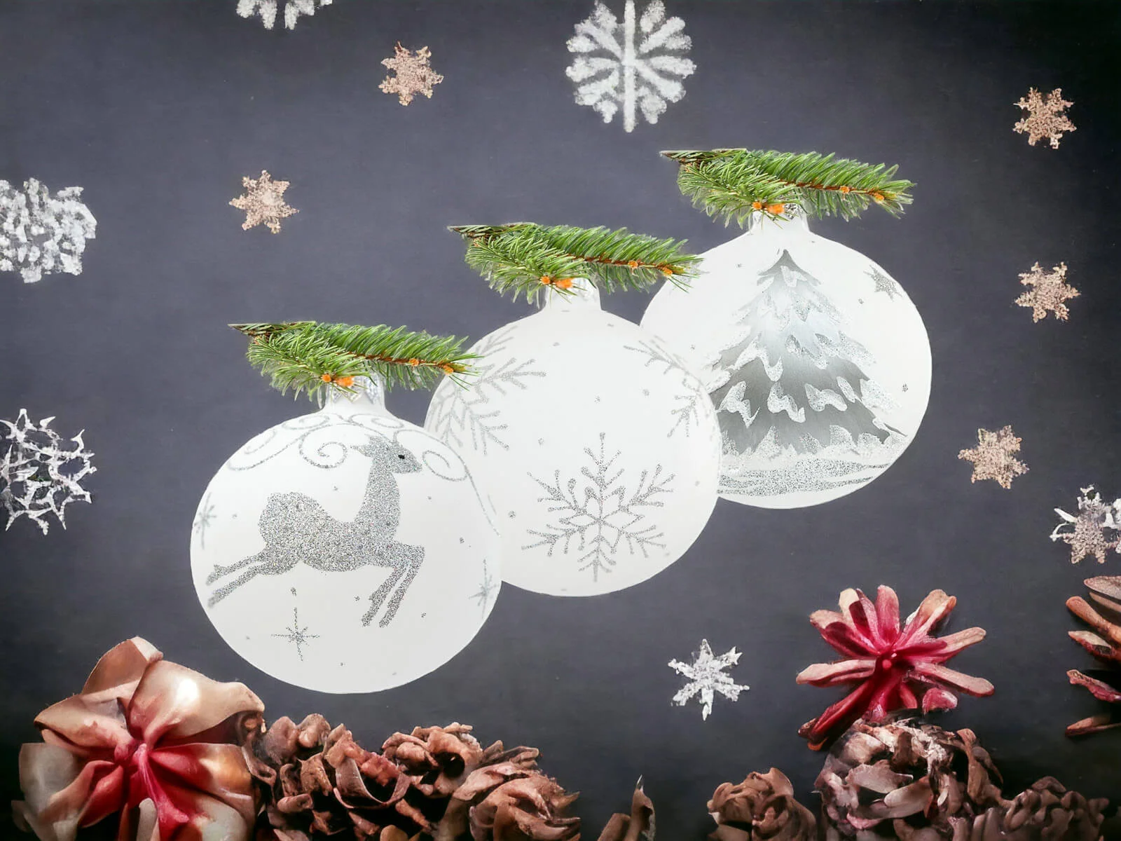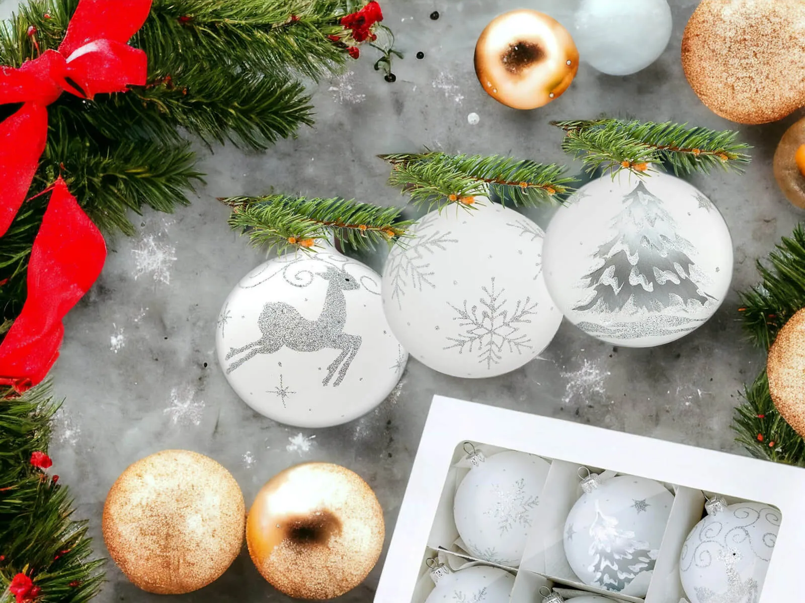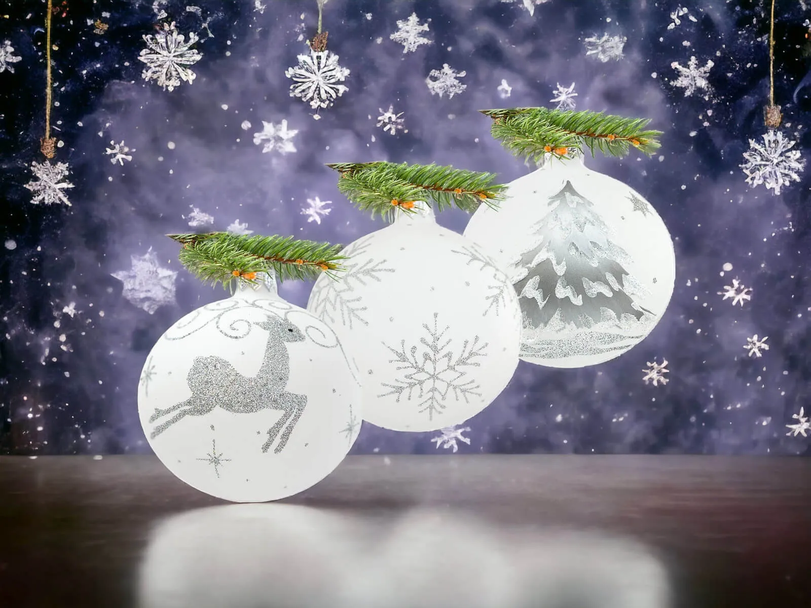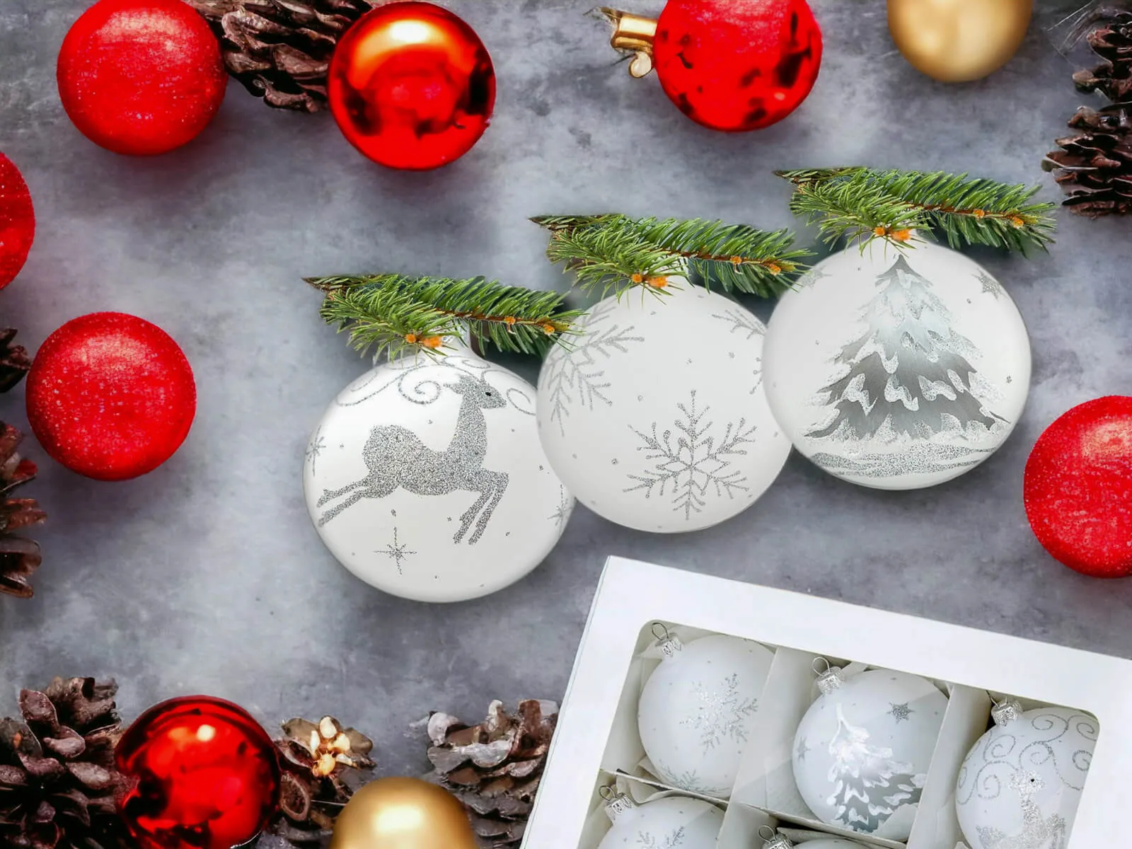 Komplet szklanych bombek choinkowych Srebrne Jelonki Śnieg Choinka Biały Mix to niepowtarzalna symfonia świątecznego blasku i elegancji. Ręcznie robione i malowane ozdoby emanują magią Bożego Narodzenia, tworząc atmosferę świątecznej radości. Srebrne zdobienia na białej kredzie dodają im szlachetności.
