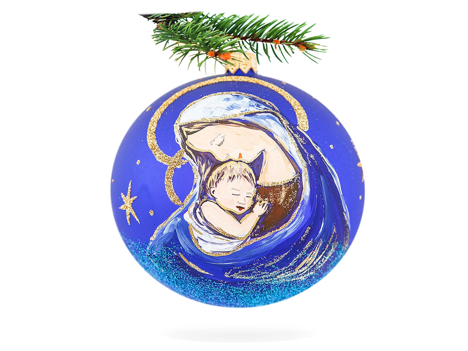 Owa bombka to obraz pięknej matczynej miłości. Ręcznie zdobiona szklana ozdoba przedstawia Maryję trzymającą w objęciach swoje dziecię. Świetnie dobrana kolorystyka uwydatnia piękno tej sceny. Bombka, jako dekoracja, nada Twojemu wnętrzu niezwykły klimat, a podarowana w prezencie będzie miłym gestem.