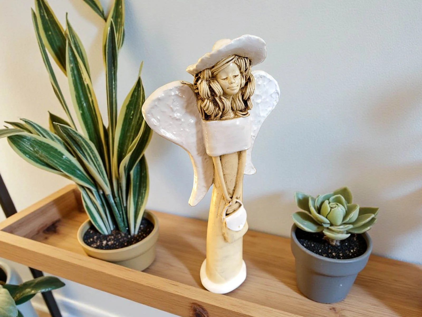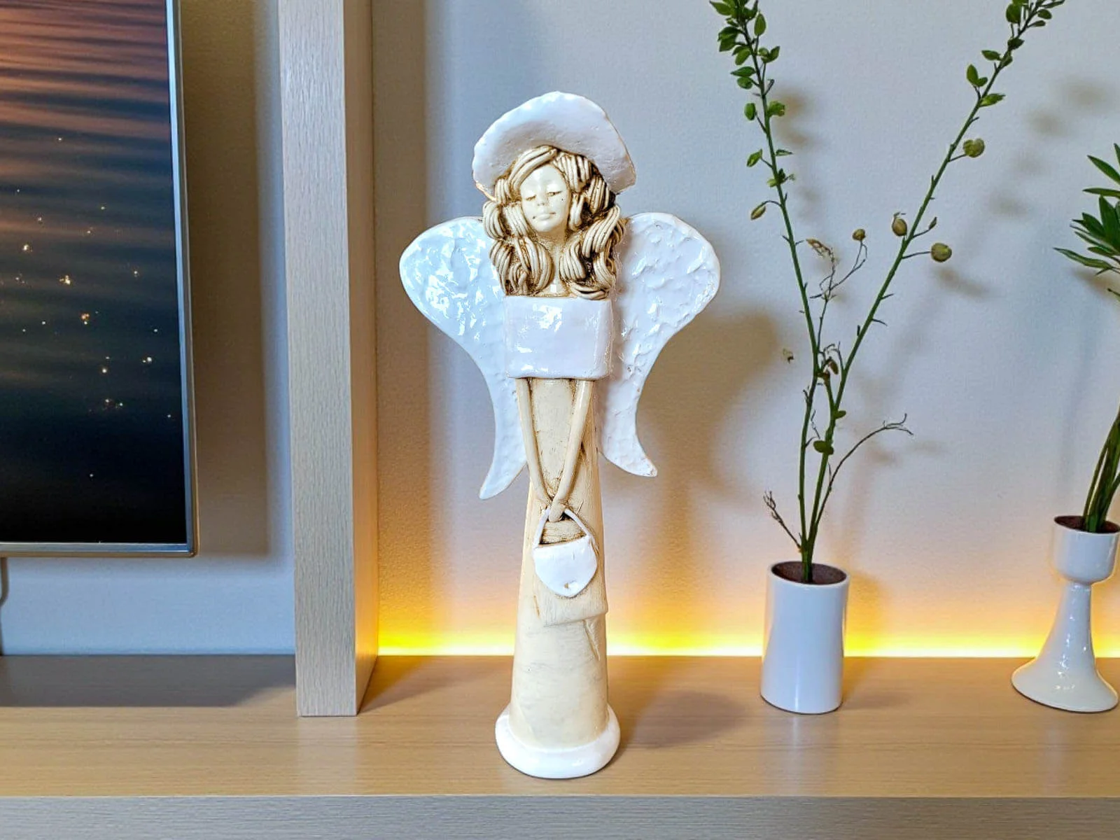 Jeśli anioł ma zostać wręczony jako prezent możemy go również elegancko zapakować w przeźroczysty celofan wiązany ekologicznym sznurkiem. Dzięki temu anioł będzie wyglądał jeszcze bardziej dostojnie i będzie gotowy do wręczenia. Dla wygody możesz również od razu zakupić papierową białą torbę prezentową.