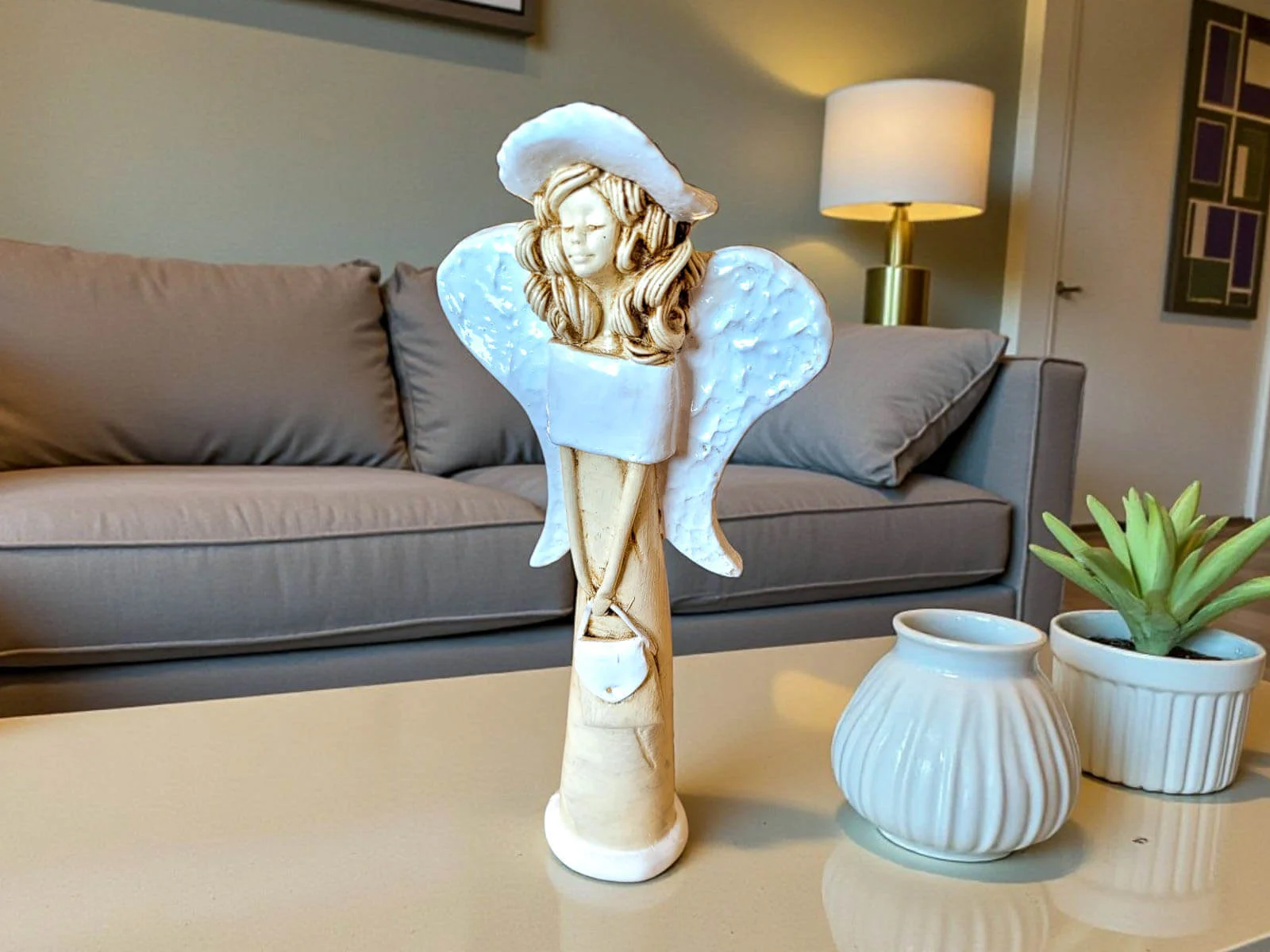 Subtelny, beżowy strój z białymi akcentami nadaje figurce lekkości i ponadczasowej elegancji, dzięki czemu harmonijnie wpisuje się w każde wnętrze i przez lata zachowuje swój wyjątkowy charakter. To dekoracja, która nie traci uroku wraz z upływem czasu.