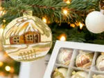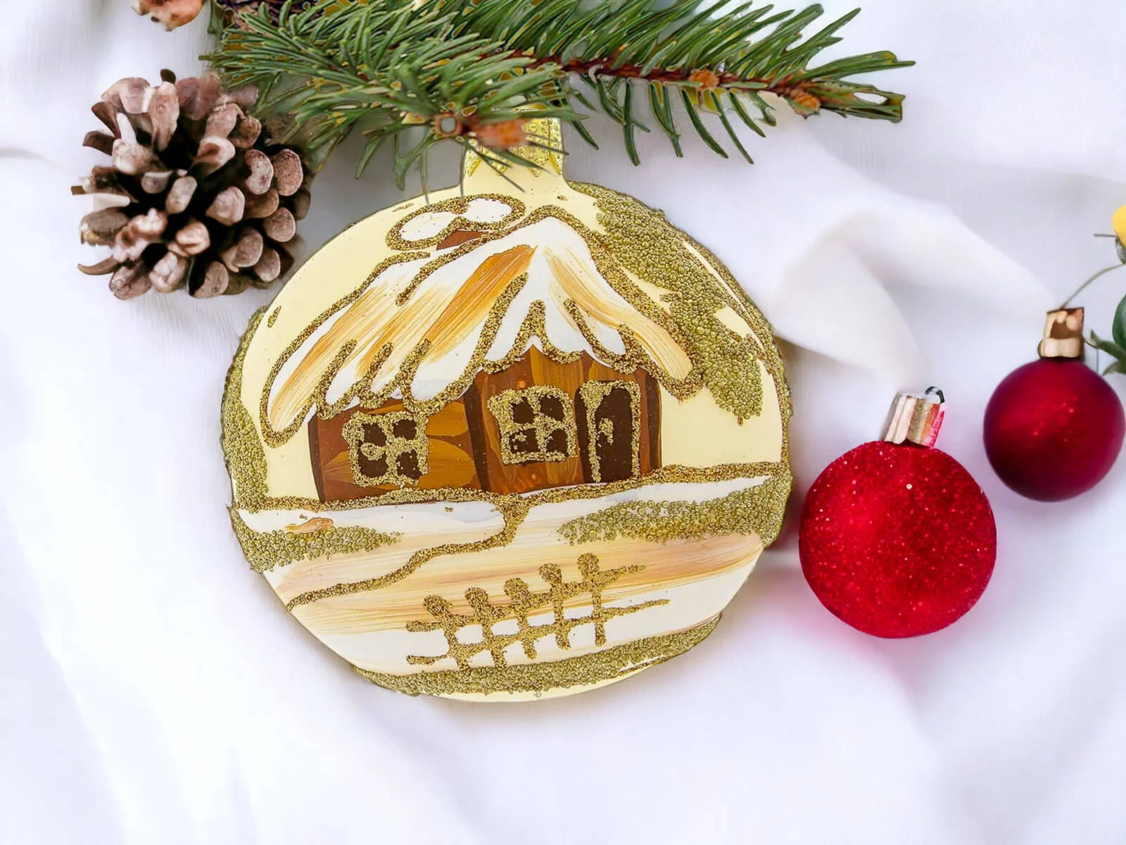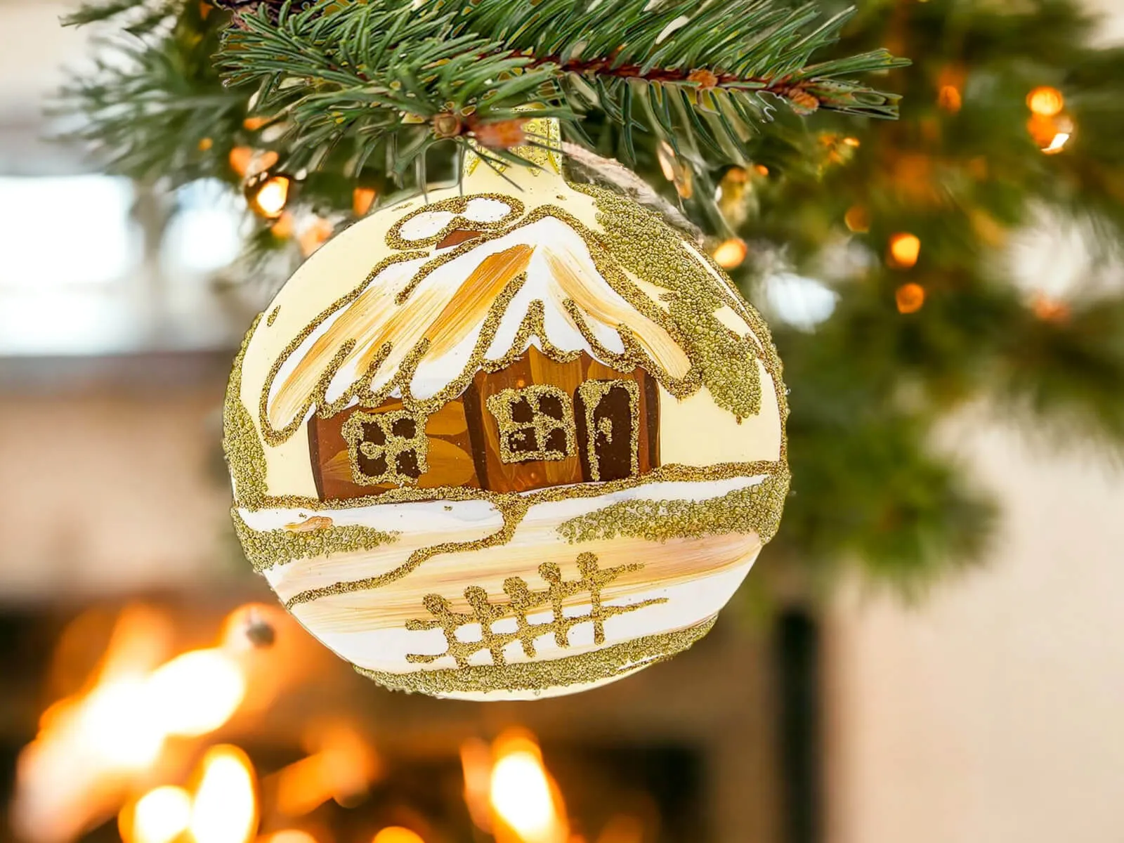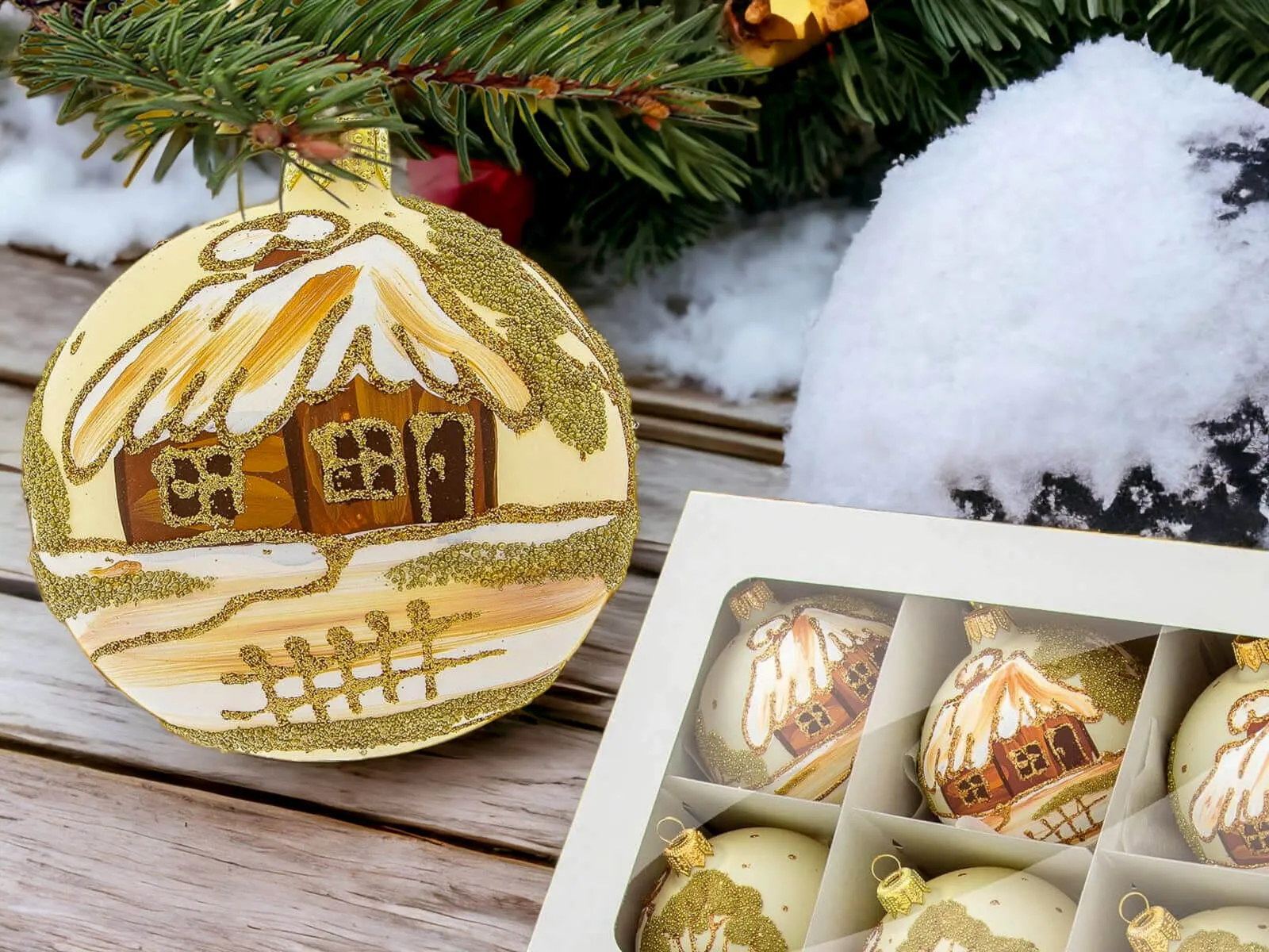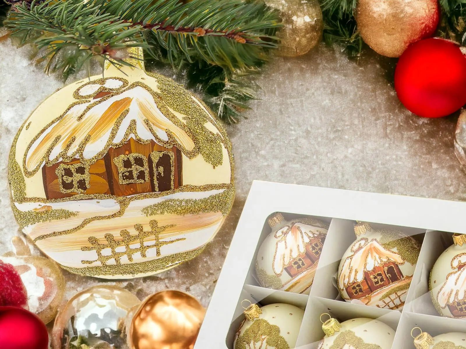 Komplet Szklanych Bombek - Złote Chatki Wanilia to zestaw szklanych bombek, które przeniosą Cię w świat magii świąt Bożego Narodzenia. Każda z tych bombek to unikatowe dzieło ręcznej roboty, malowane z dbałością o detale na waniliowym podkładzie, tworząc efektowne złote chatki.