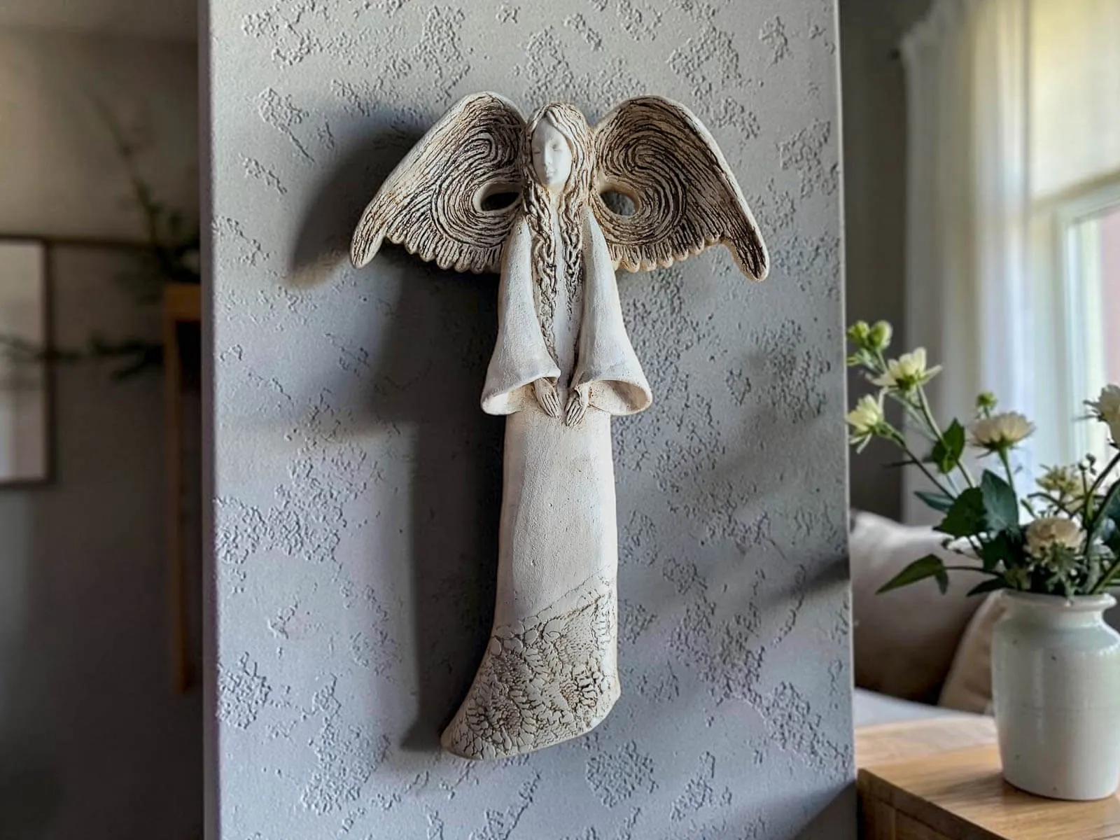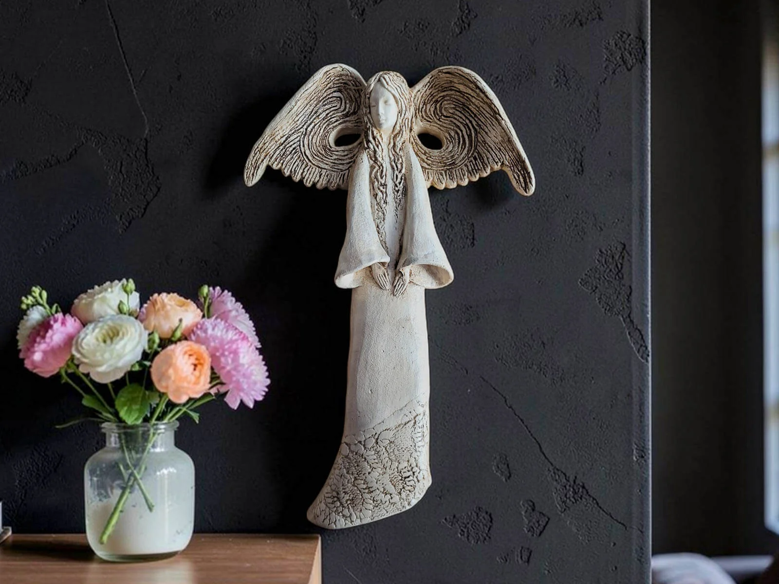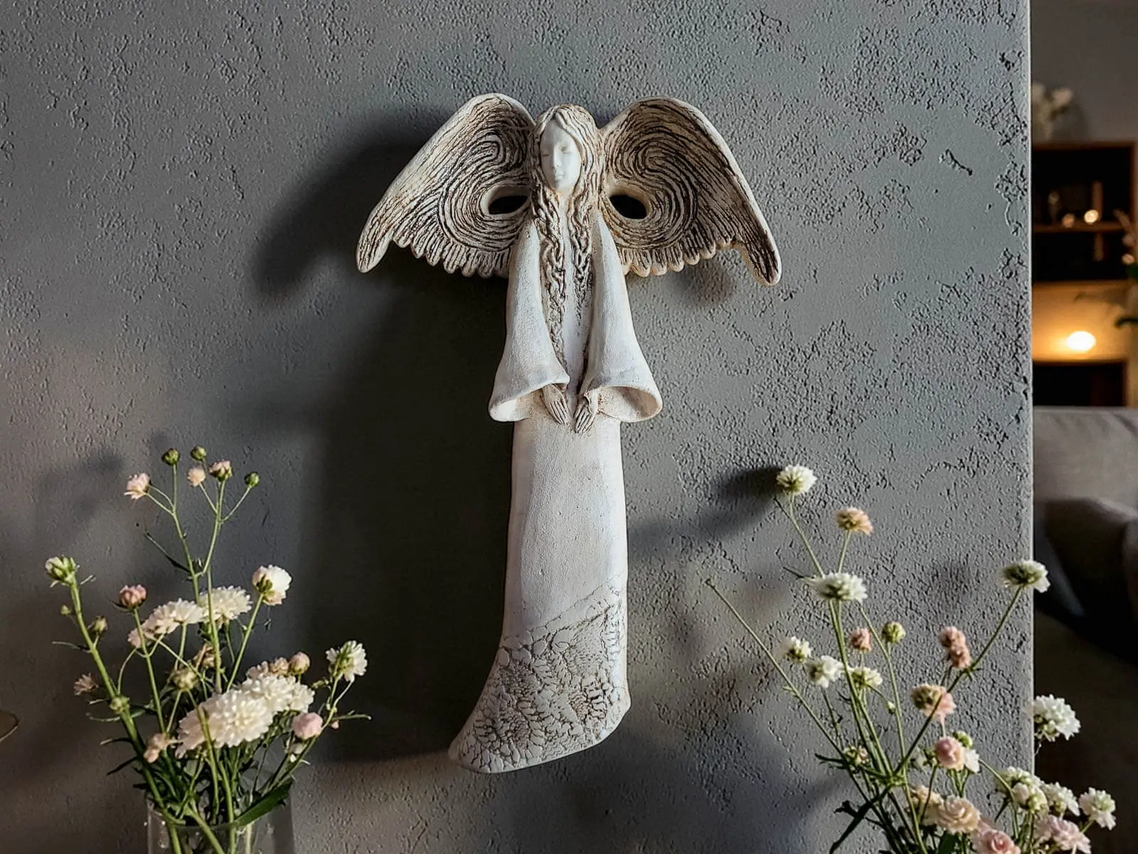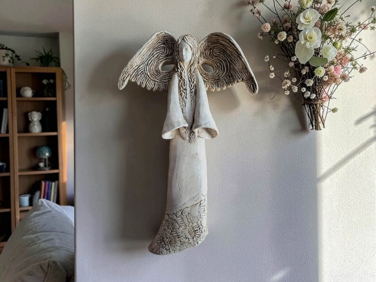Minimalistyczna, spokojna kolorystyka sprawia, że anioł Clara pięknie komponuje się z różnymi stylami aranżacji – od klasycznych i eleganckich po nowoczesne, skandynawskie czy rustykalne. Może stać się subtelną ozdobą półki, komody, regału czy stolika, dodając wnętrzu lekkości i wyjątkowego charakteru.