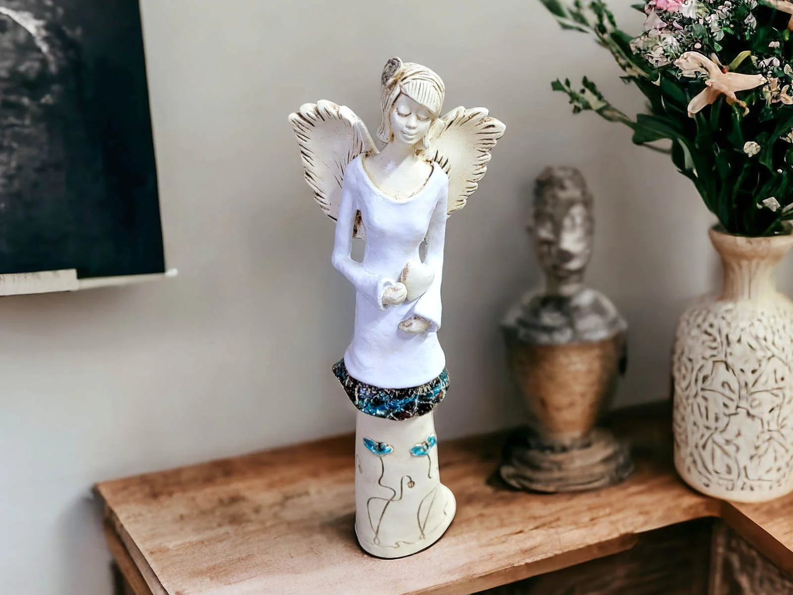 Anioł Mia jest przepiękną postacią o uspokajającym i kojącym wyrazie twarzy. Jej puszyste skrzydła dopełniają jej idylliczny charakter. Ma na sobie długą biało-beżową suknię, po której pną się kwiaty. Kwiaty, które są wszechobecne w tej figurze - znajdują się również we włosach Mii oraz w formie bukietu trzymanego w rękach. Figurka jest bardzo uniwersalna. Sprawdzi się bowiem jako prezent z wielu okazji, a przy tym będzie pięknym akcentem w każdym mieszkaniu.