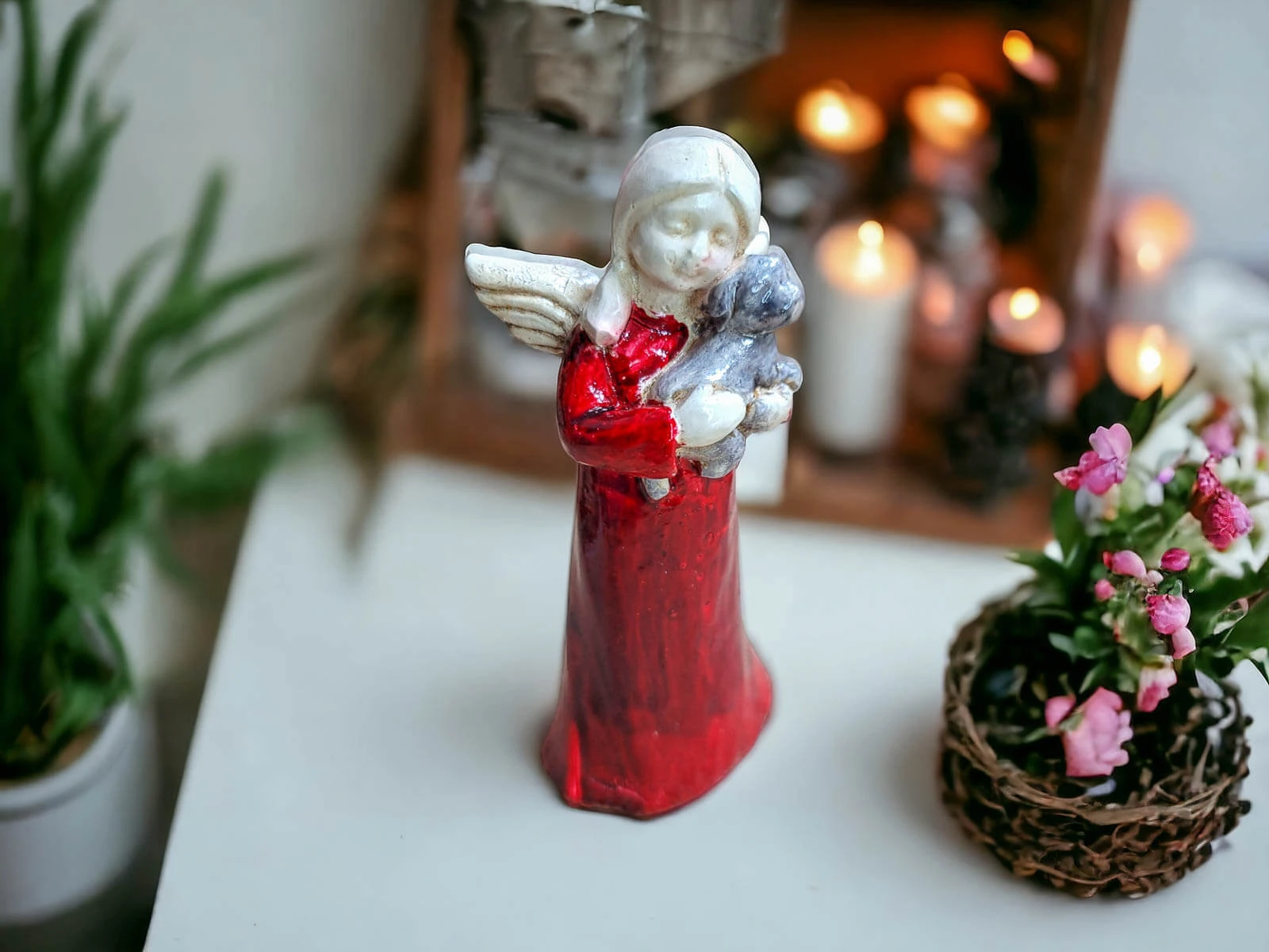 Aniołek z pieskiem - czerwony -  22 x 9 cm figurka dekoracyjna gipsowa