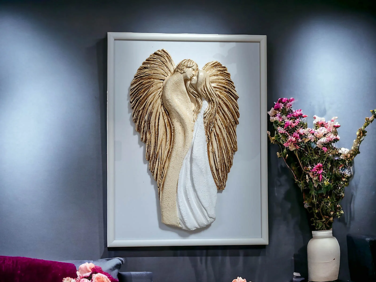 Zakochane Anioły + ramka - wiszące biało beżowe -  35 x 21 cm figurka dekoracyjna gipsowa