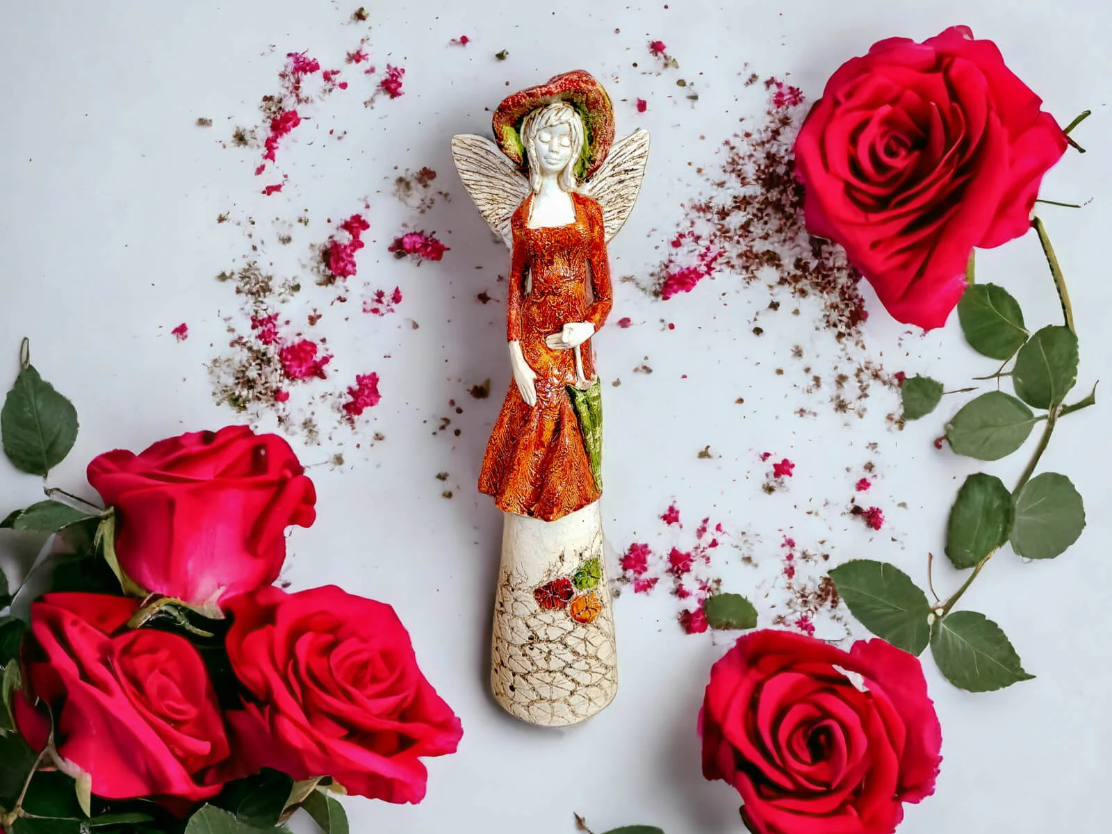 Anioł Olivia - pomarańcz - 32 x 15 cm figurka dekoracyjna gipsowa