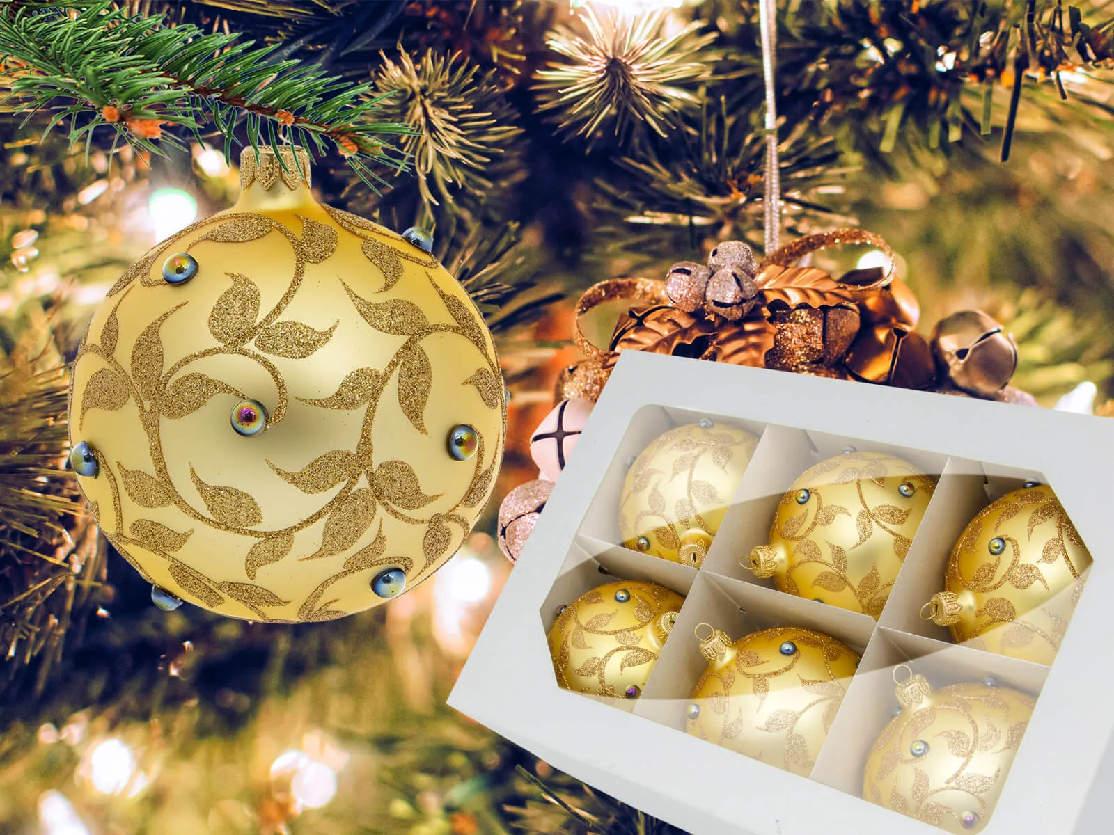 Bombki - złote listki z perełką - 100 mm bombki choinkowe szklane 6 szt
